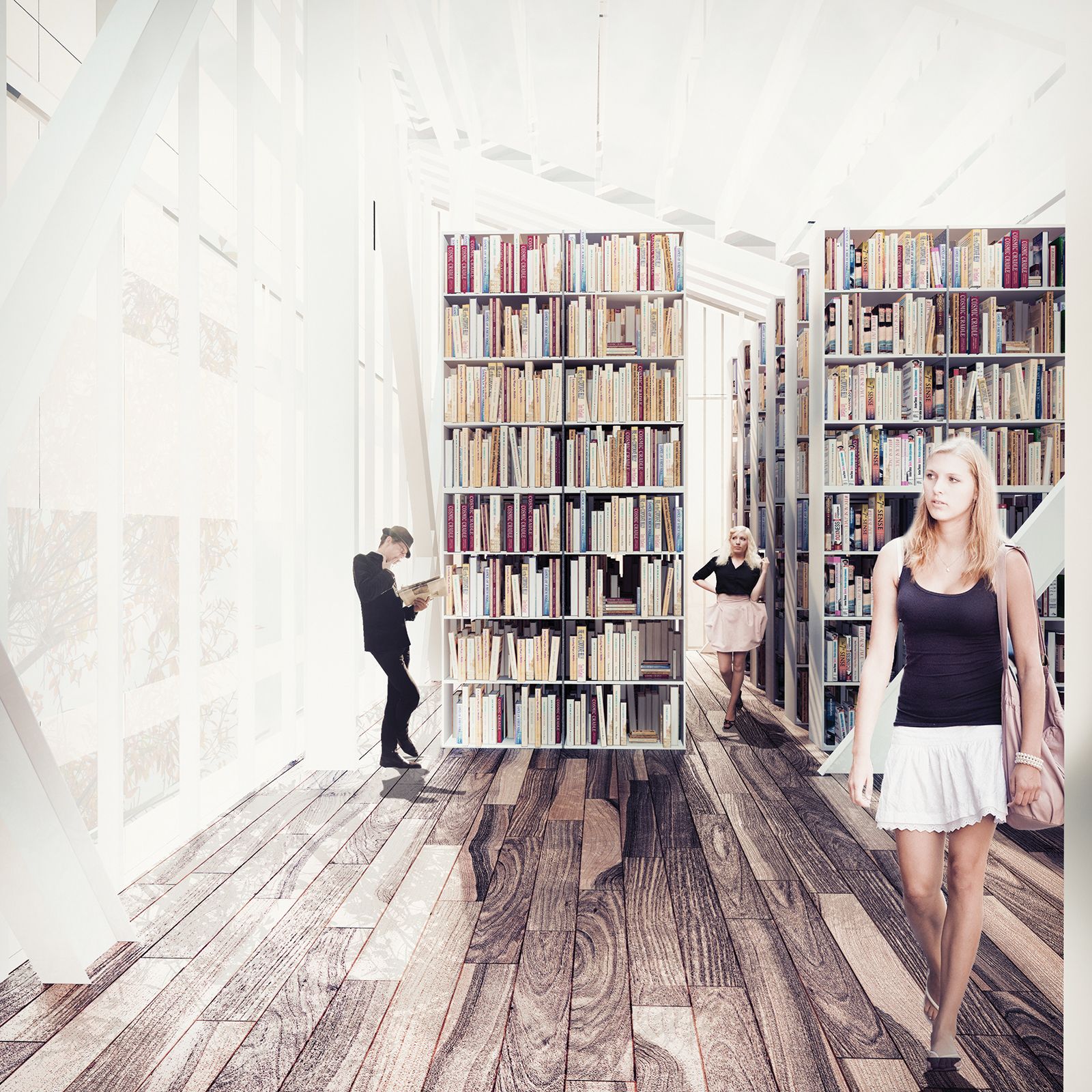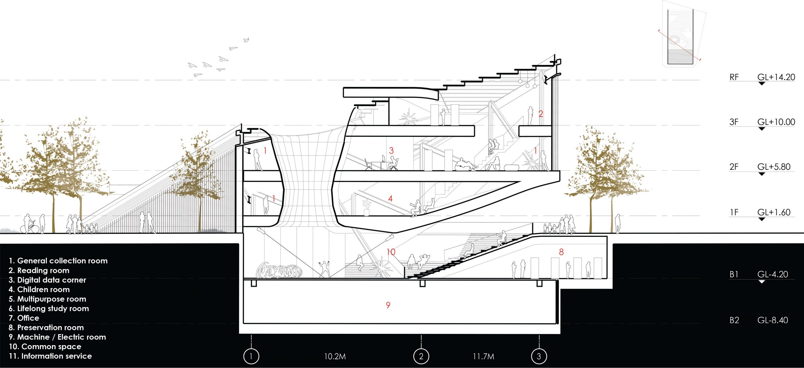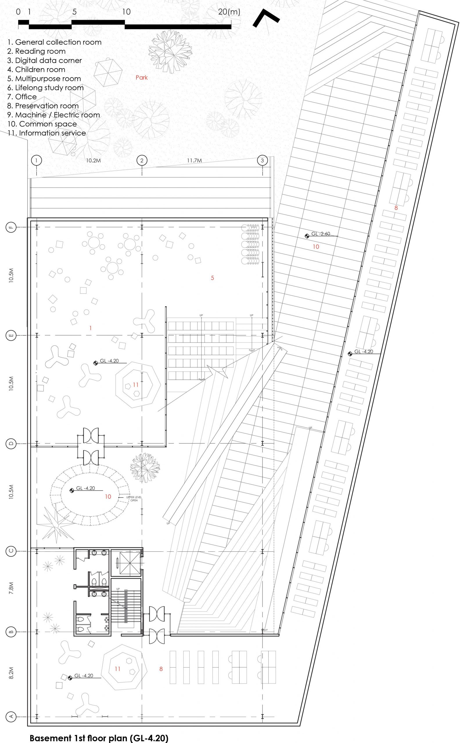 The library has two main programs, that is collection and preserving.the underground serves to house the preserving functions while the collection functions are kept above ground.The simple lattice structural beams used allow for maximum spacing devoid of structural constraints. This design although it didn’t come out tops, was named aas an hounorable mention in the design competition.