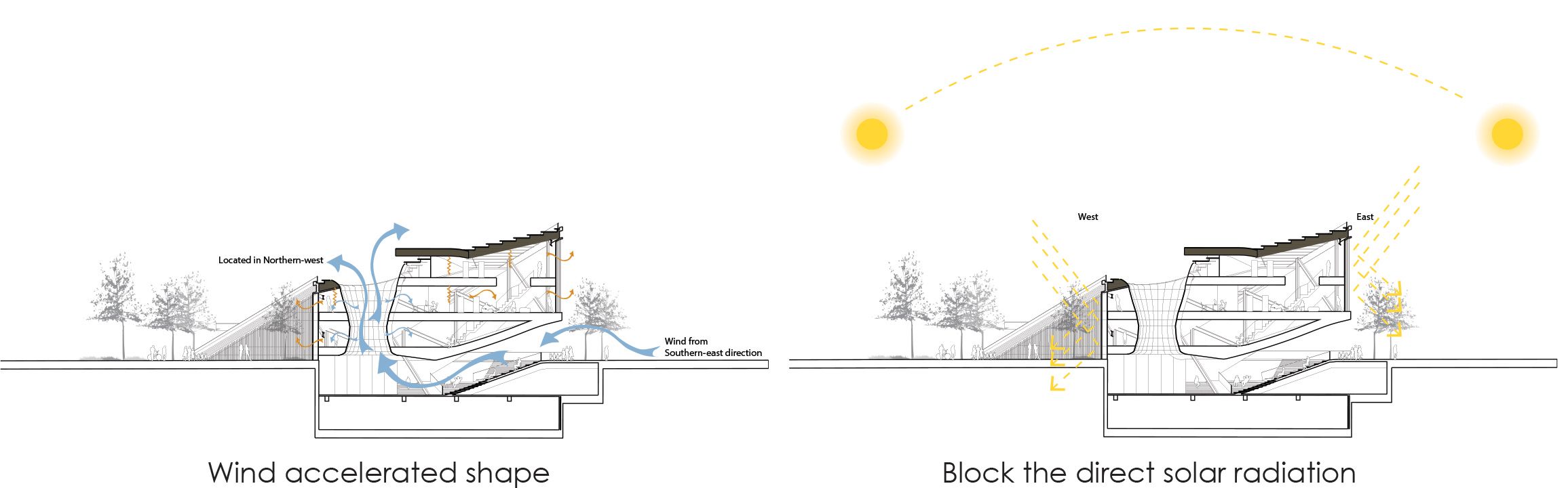 Entrance to the building is assured via a long ramp that creates a linear passage into the main floor area and preserving rooms. All the main public spaces are accessible via this route. Like a staircase t, the raised end serves an additional function by allowing for easy flow of air therby reducing significantly the need for ACs. Climatic conditions were seriously taken into consideration by orienting the building to the direction of the summer winds to allow for cooling effects during the humid summer.