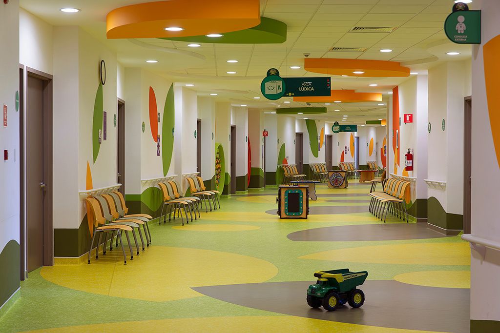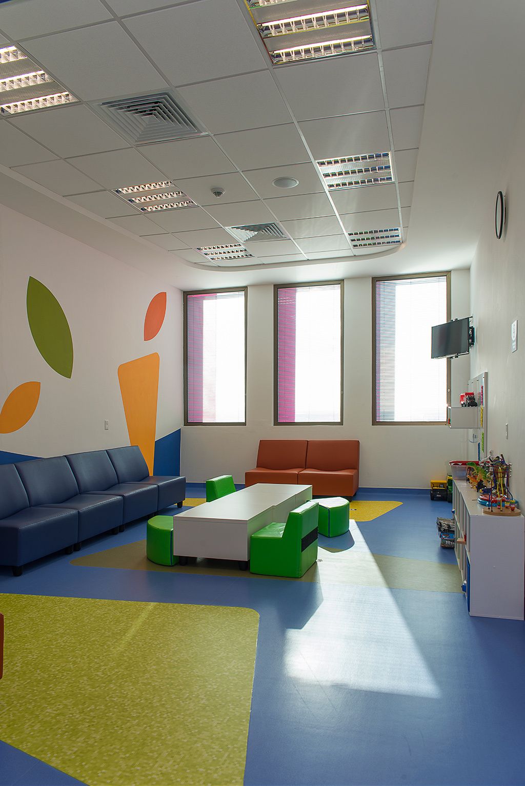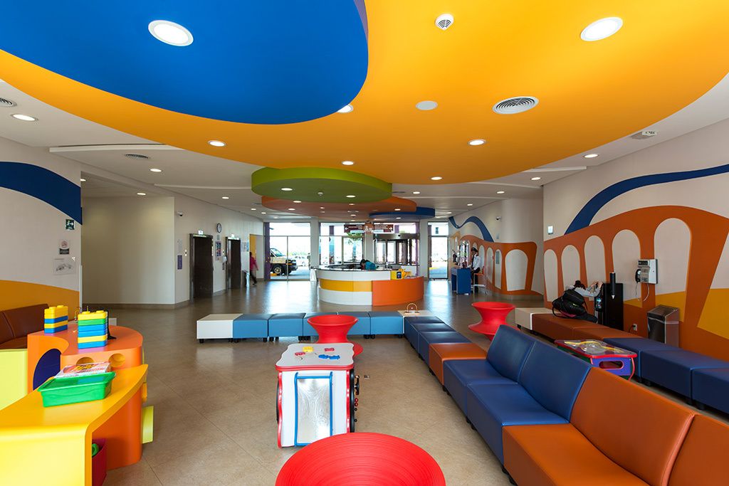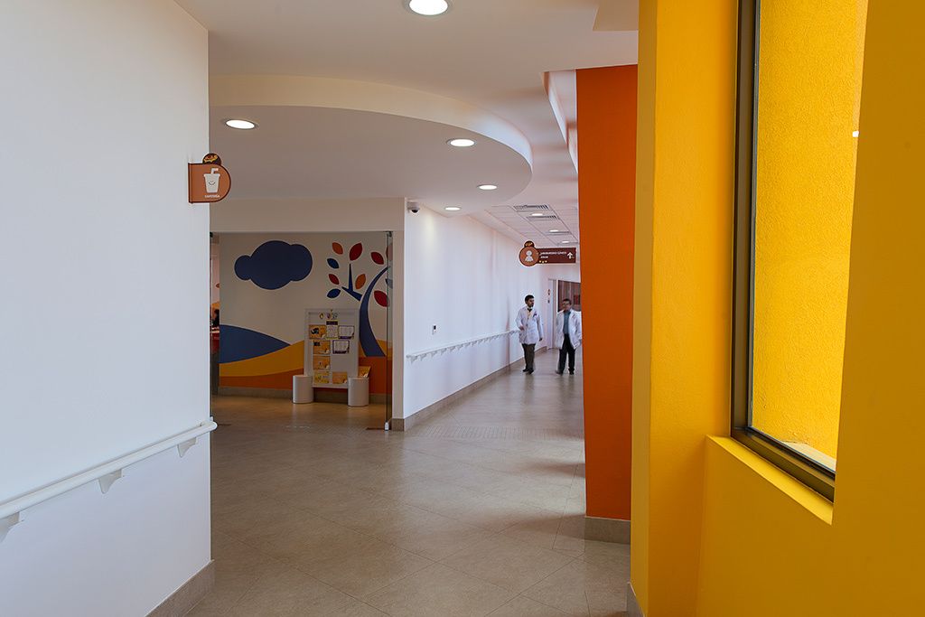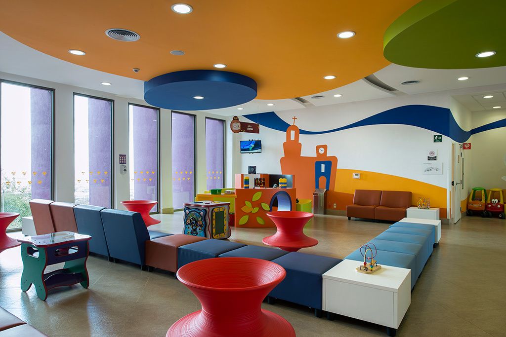 The shape of a geometric leaf has been repeatedly used on the walls, floors and ceilings. The colourful and bright interiors have been accompanied by equally bright furniture. The design of both the exterior and the interior reveals sensitivity to its users. The spaces look more like they belong to a playschool, creating a positive atmosphere for children, casting aside the feeling of being in a hospital.