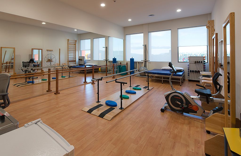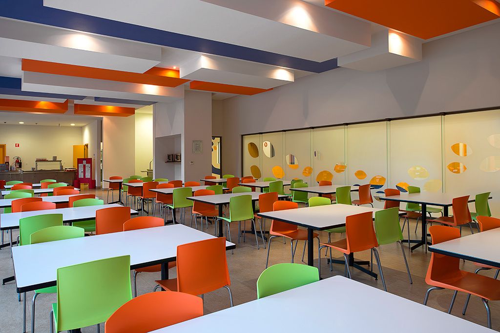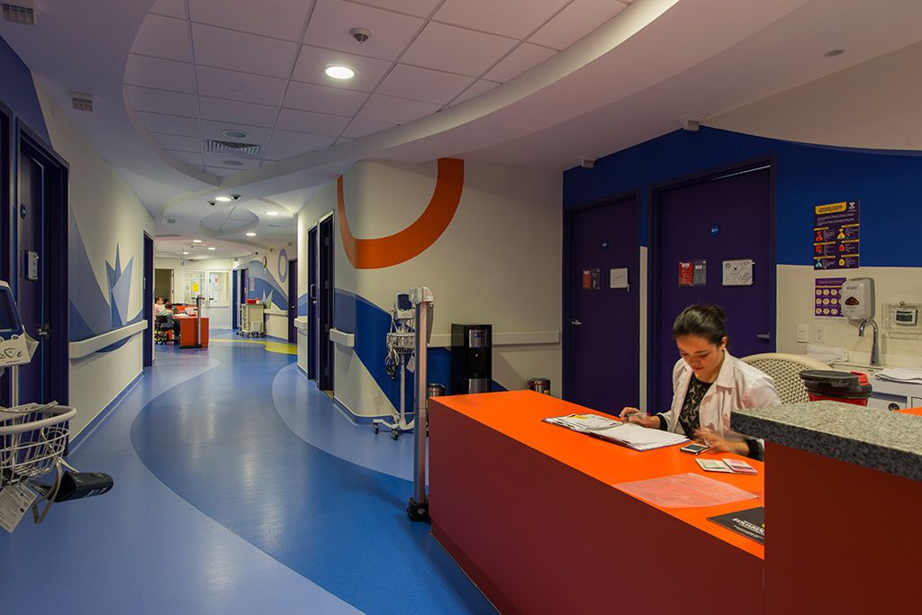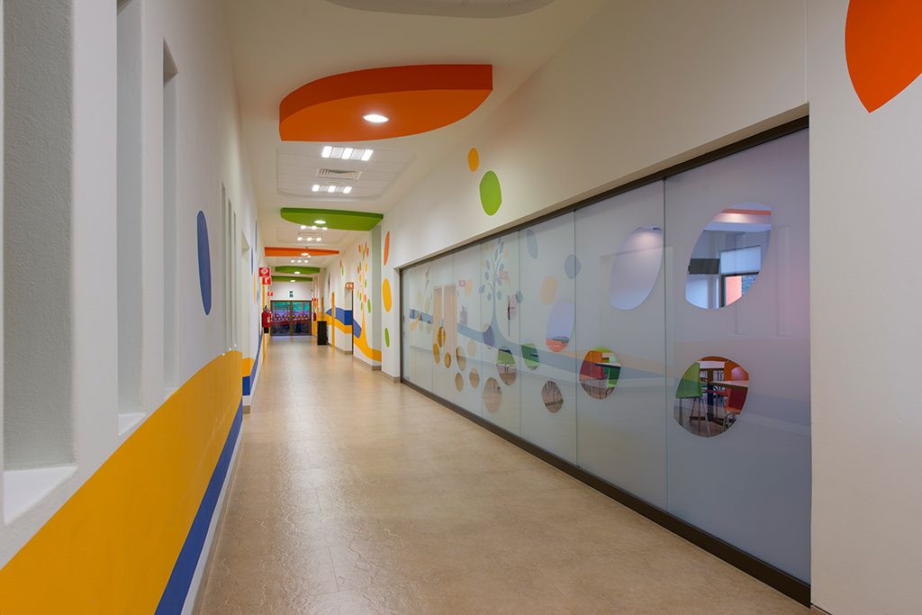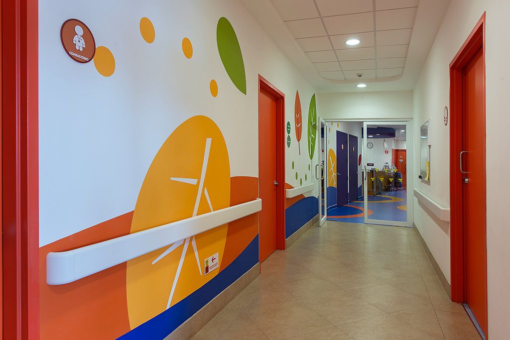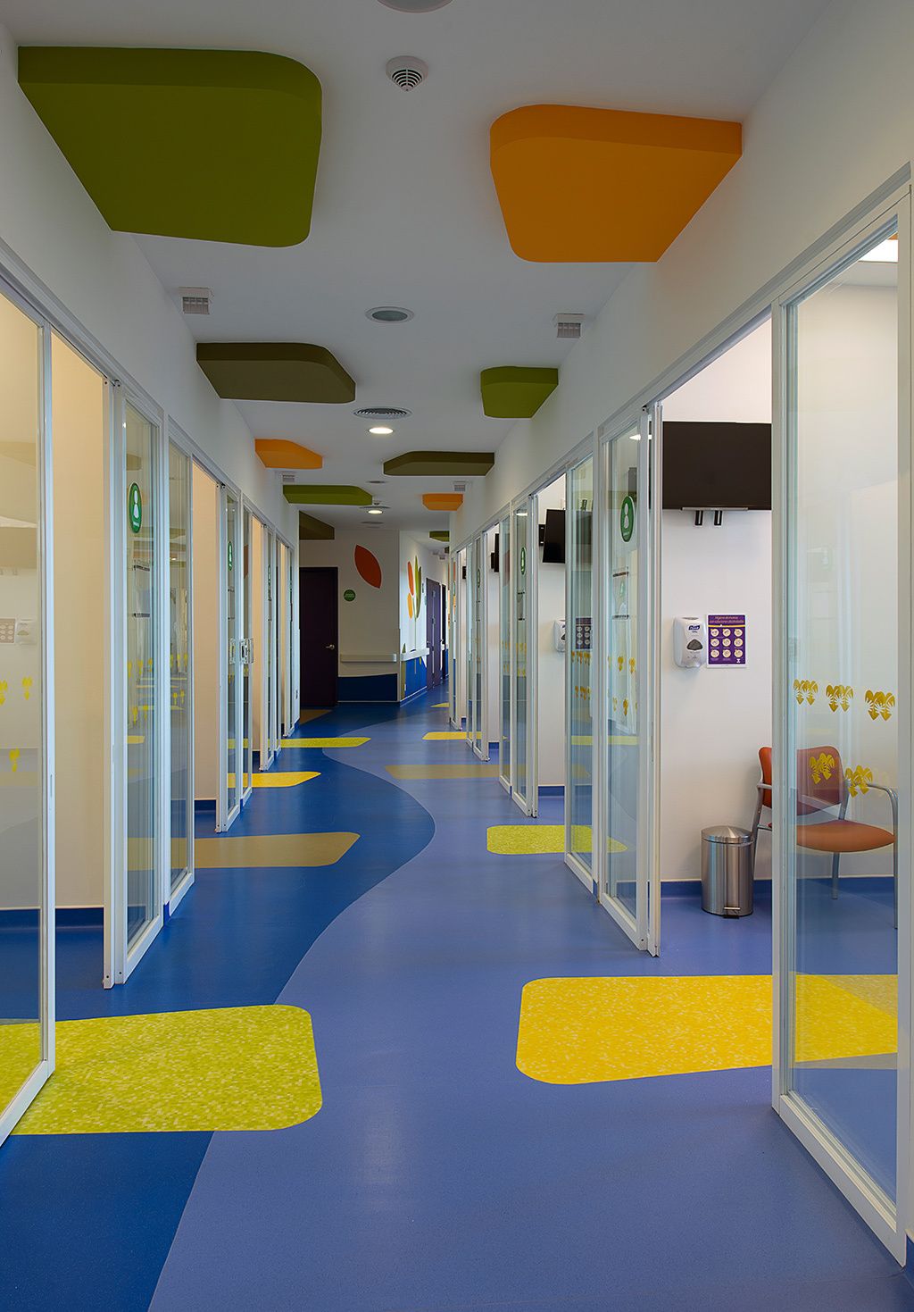 The shape of a geometric leaf has been repeatedly used on the walls, floors and ceilings. The colourful and bright interiors have been accompanied by equally bright furniture. The design of both the exterior and the interior reveals sensitivity to its users. The spaces look more like they belong to a playschool, creating a positive atmosphere for children, casting aside the feeling of being in a hospital.