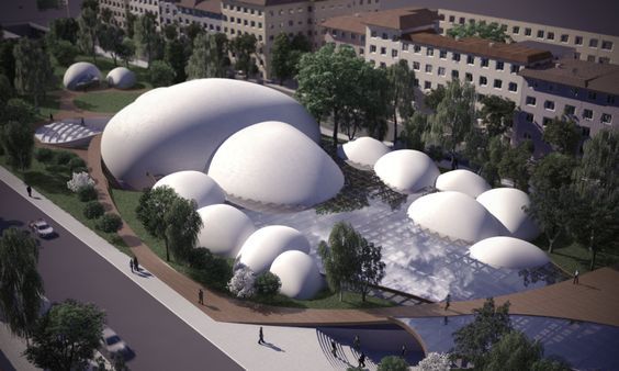 Because the amount of water flowing down the river is not constant throughout the year, a waste management plant has been incorporated in the design, which purifies the incoming river waters (including Weatlands plants) and then conveys part of it through an underground channel flowing under the pebbles. The remaining water forms a small ribbon flowing constantly through.The construction of the pebbles, involves the implementation of a new building technology, green, environmentally friendly and flexible. The “Binishells” technology is based on the radical notion of replacing formwork and heavy machinery with air, by using low air pressure to lift and shape a reinforced concrete thin shell structure. Air is essentially used as a formwork for the pebbles’ construction. The intermediate space is covered by a special glass which allows you to walk on it. It lies on multilayer wooden beams, which rest on the shells structures.”]