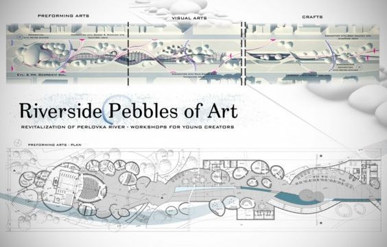 The main idea of the project is about a river of art in Sofia, bringing the old river of Perlovska back to city life. A canal used as a sewage conduit is transformed into an area of culture: art installations, workshops and artist’s ateliers make up a new-found experience of built environment in the city for pedestrians and civilians.The conceptual design envisions buildings which are shaped like pebbles, scattered by the flow across the rivers, forming clusters or standing alone, shaped by art according to the artists’ needs. Collaborating types of arts (performing arts, visual art and crafts) form clusters in direct connection to the surrounding areas already existing cultural spaces, thus operating as bridges. Open space between the pebbles is the “bed” of the art river where artists make exhibitions, exchange ideas and communicate with the public, reviving art in people’s everyday life, as they waver across.”]