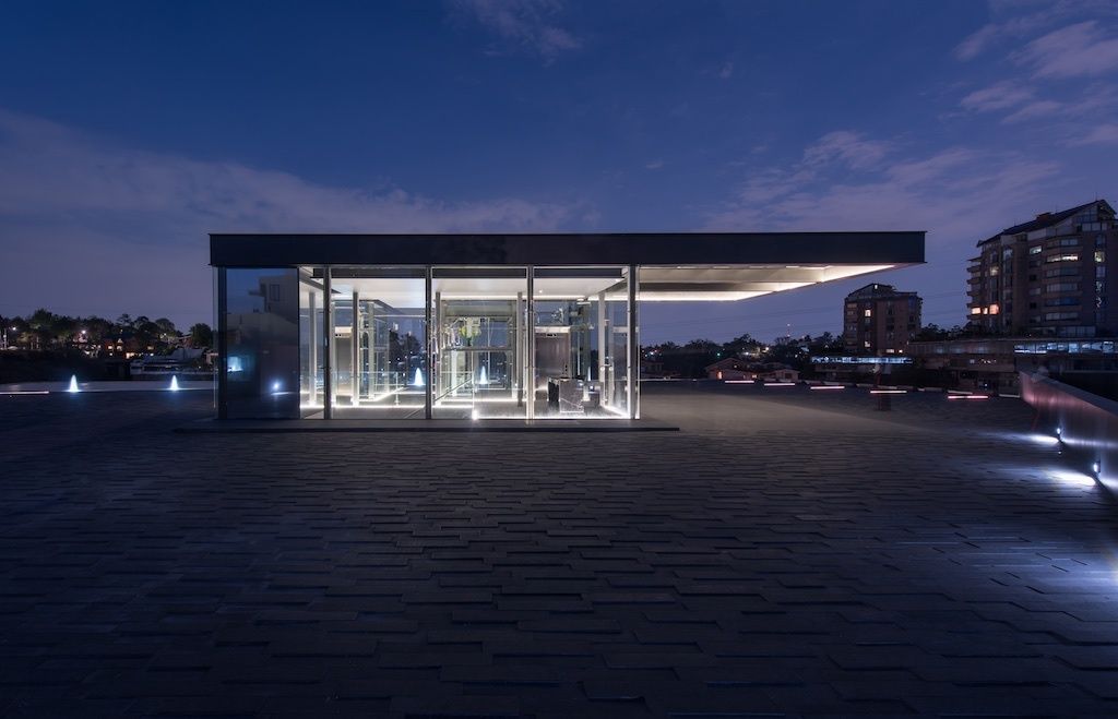 The natural slope of the terrain made it necessary to develop the entrance and sequence of the building in a descending fashion. The vehicular access is located at the highest point, with a ramp that descends comfortably 5 meters to a reception area, visually rounded off by a large wooded area. This area is delimited by a large pool of water with fountains and incorporates 10 parking spaces for visitors and the access ramp to the residents’ parking. The lobby is sited at the center of this plaza in a transparent glass box with access to the vertical circulation nucleus for distribution to the various departments on the four levels below.