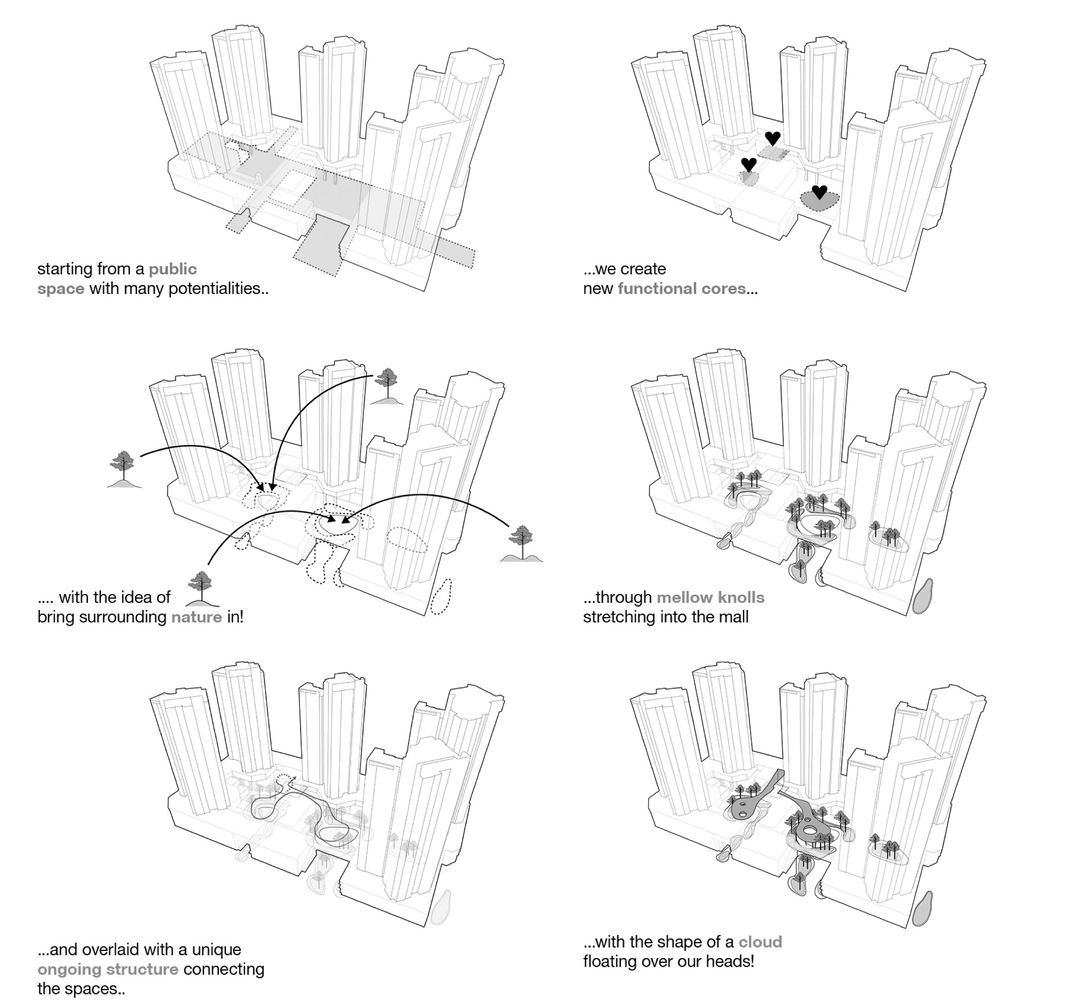 We envisioned the outbuildings in the mall as vibrant public gathering spaces for the Arcloud community, in line with the project objectives. Our goal was to create beautiful and welcoming spaces that celebrated everyday life’s dynamic and ever-changing rhythms. The neighborhood park “Arcloud” is surrounded by gently rolling hills, providing a versatile, open event space. It has a central platform that can be used for center stage that can be used for performances, while the bowl-shaped surround can be turned into a winter sprinkler by filling it with water. This simple but flying system enhances the space’s many functions, ensuring it can be enjoyed in various ways throughout the year.