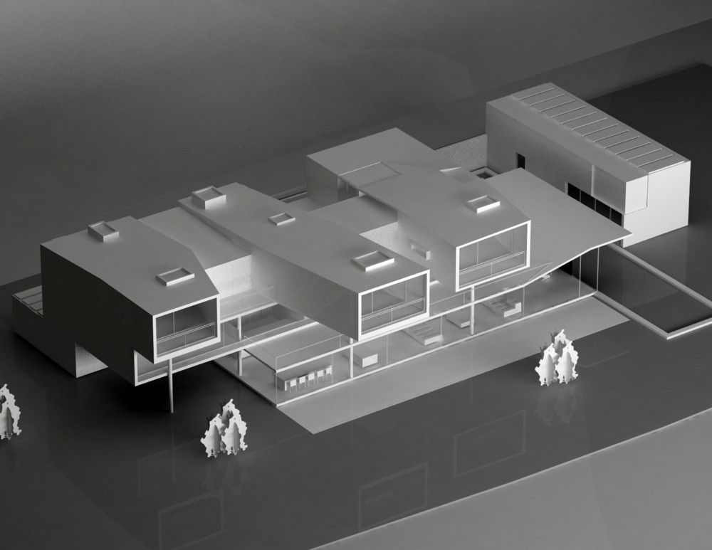 The 3 layers are organized also functionally to enhance the site characteristics and maximize the green-sustainable aspects of the project. The ground floor is ideally presented as a transparent glass box. It contains all public spaces (living, kitchen, pool, garden, deck, etc.) Via operable wall windows, the ground floor greatly takes advantage of the cross ventilation as the main green feature. The second level works as a “connector” between the top and bottom floor and it’s programmatically intended to be a semi-public space. Mostly carved to allow for soaring double height spaces at grade, it features passing bridges that lead to the family/fun/recreation areas to the east of the house.