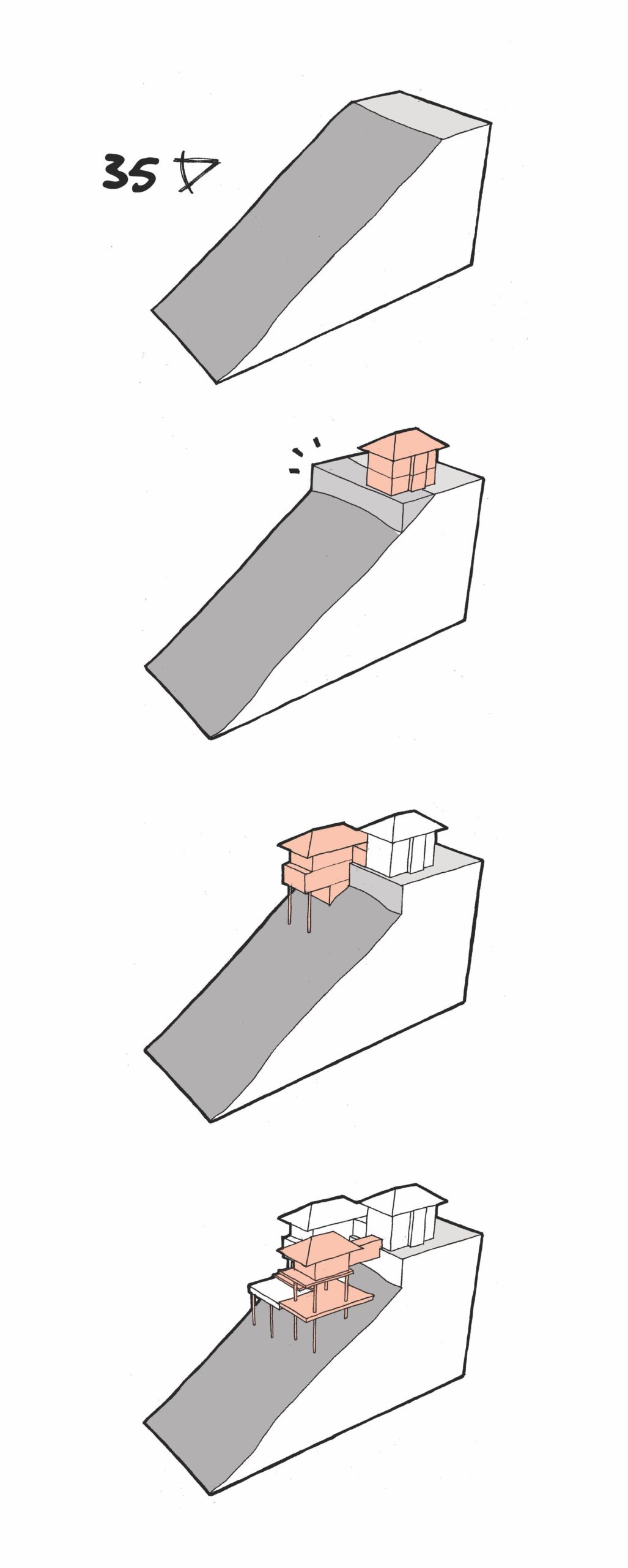 Sited on a dramatic 34-degree slope facing a forest reserve, the Be-landa house was an exercise in “befriending” rather than “conquering” the terrain. The starting point was to establish the minimum amount of flat land required for the house to be functional. We drew a line for the retaining wall to include a flat area for parking the cars, an adjoining main entrance, and the kitchen at the street level. The retaining wall bisected the site acted as a datum for the master planning. All spaces required by our Clients were massed into three Pavilions with varying relationships to the datum wall; the 1st Pavilion is entirely “on the ground” within the flat land area; the 2nd Pavilion is half on the ground, and half hanging over the slope on stilts; and finally the 3rd Pavilion is entirely hovering over the slope on pilotis, accessed via a glass-sheathed bridge.