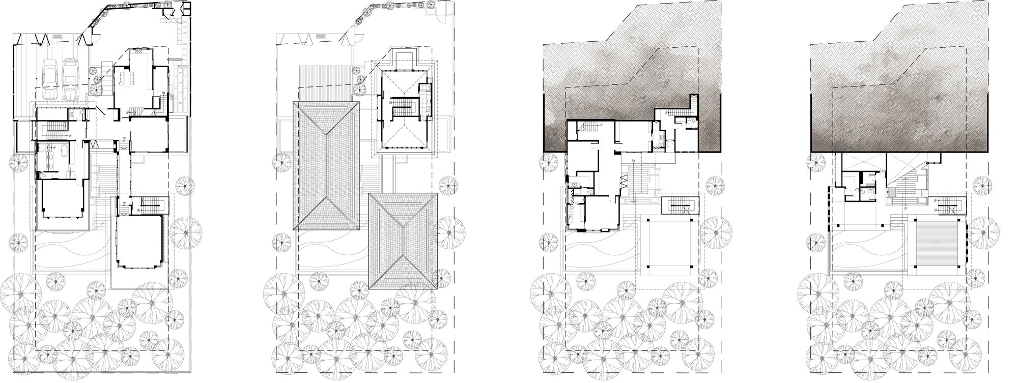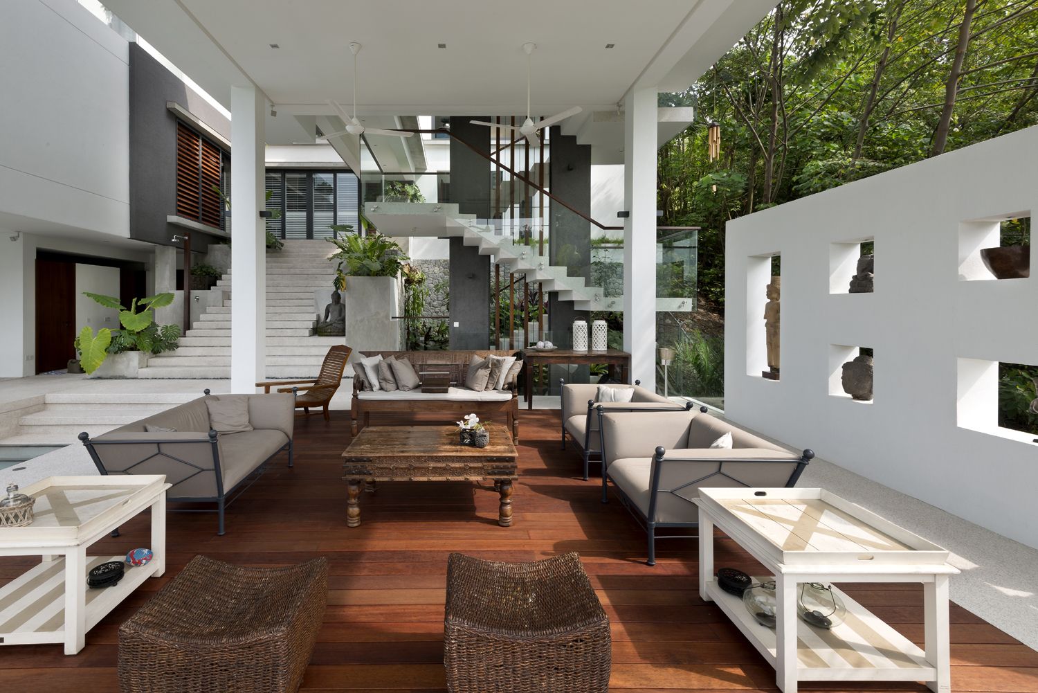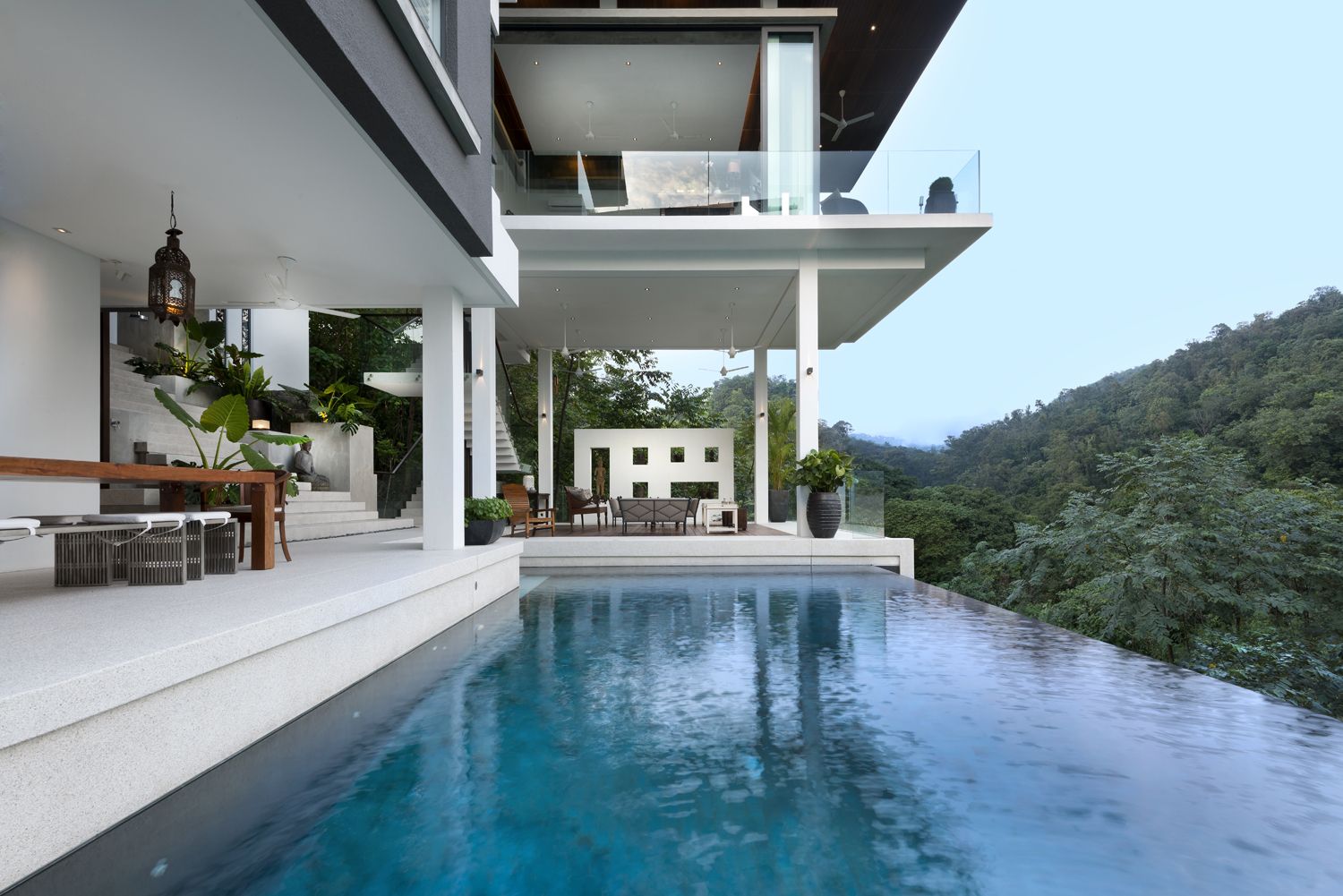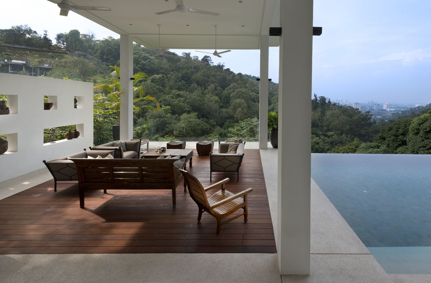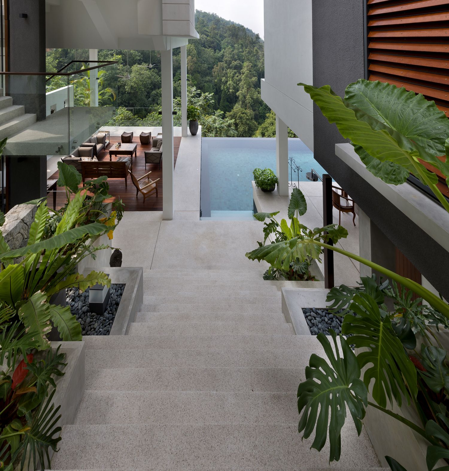 When viewed from the street, only the “grounded” portion of the 1st and 2nd Pavilions is visible. The front façade is decidedly low-key, a double story massing with little indication of what lies beyond. Upon entering, there is an element of surprise as the house unfolds. The Foyer features an elevated view straight through to the forest reserve across the valley, framed by the 2nd & 3rd Pavilions. The lowest poolside living area was used in Crazy Rich Asians, in the scene where the ladies gathered for Bible study and tea. This level is shielded from the rain and equatorial sun by the spaces above.