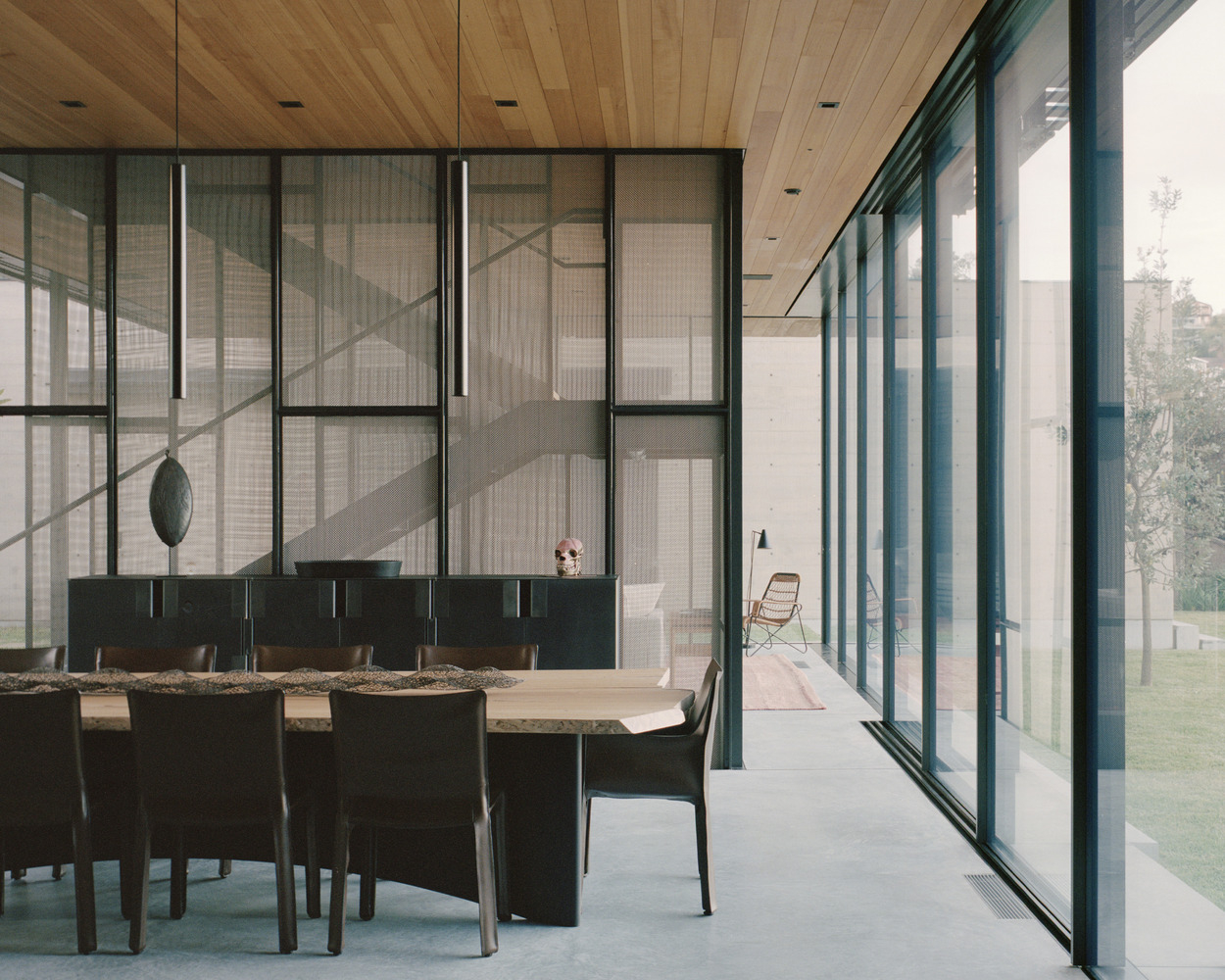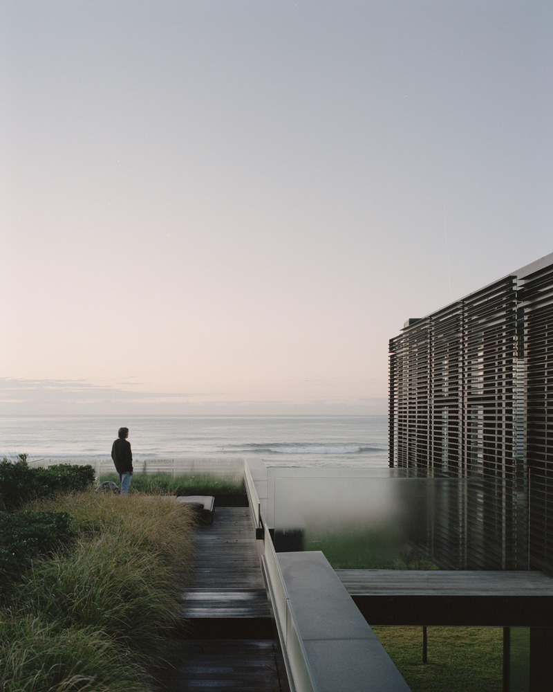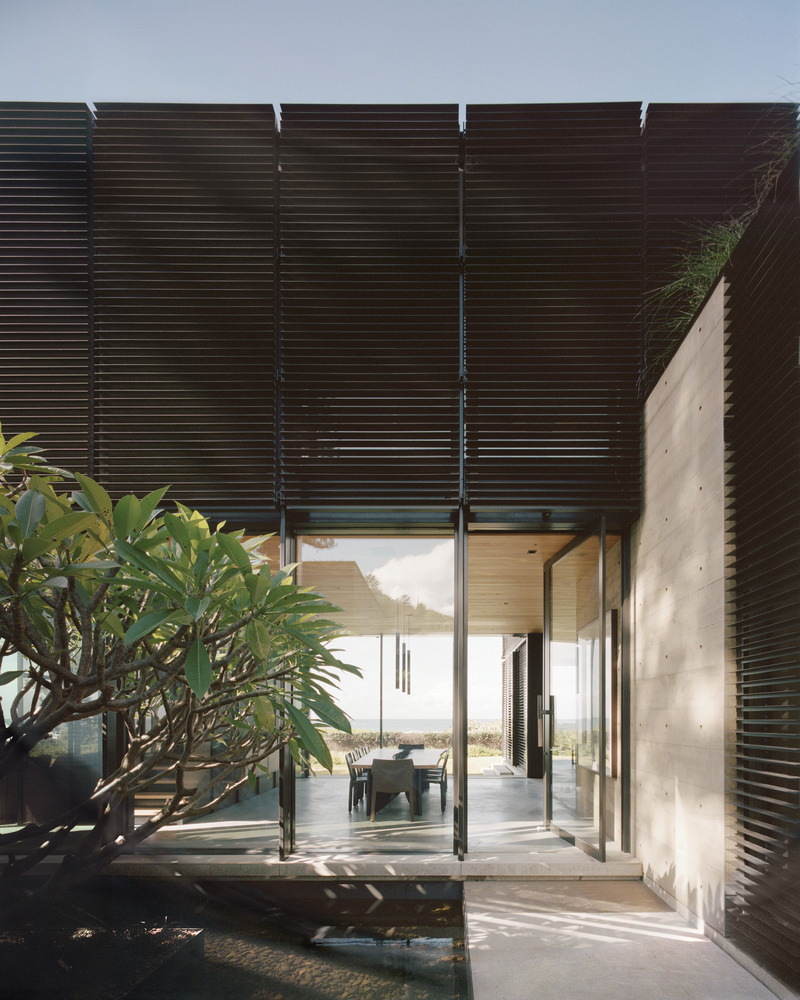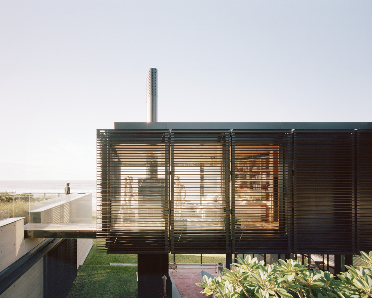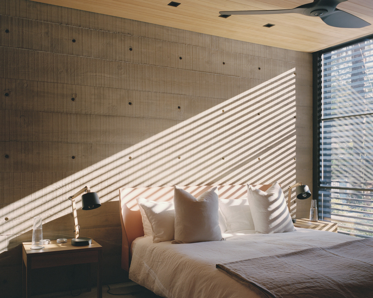 The house’s board-formed concrete walls match the color of the local sands, connecting the architecture to its surroundings and allowing it to blend in with the natural environment as it ages.