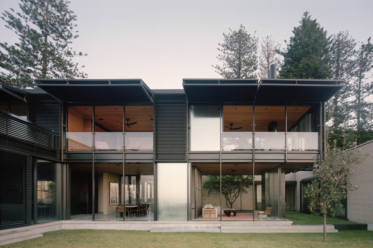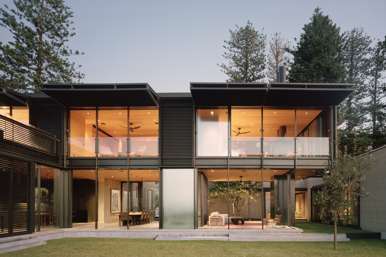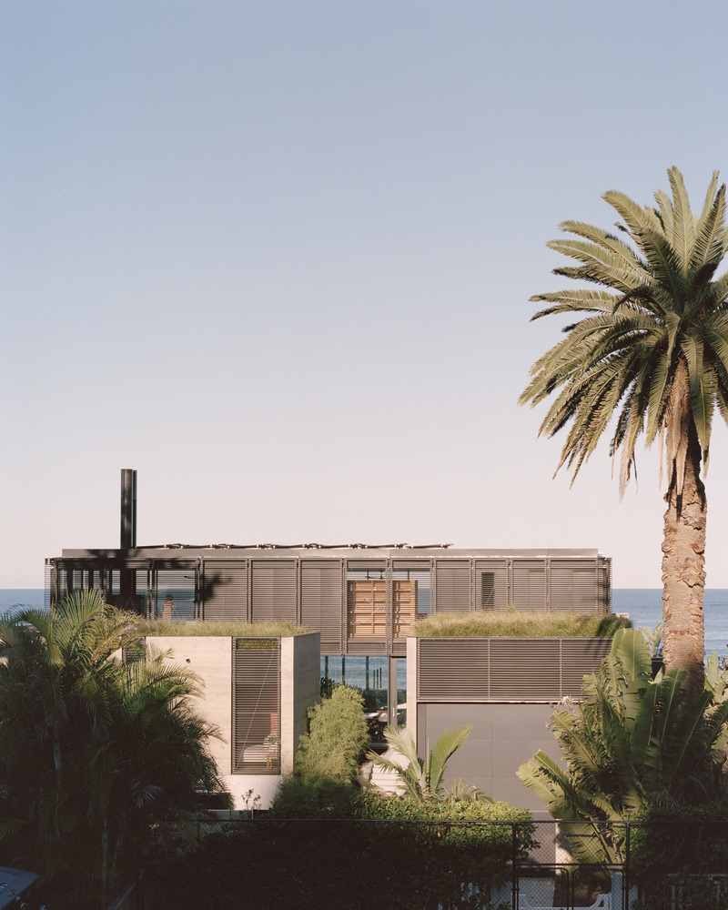 This 9,400-square-foot family home is situated on the northern coast of Sydney, Australia, in the sand dunes of Bilgola Beach. Palm trees and Norfolk Pines surround the entrance to the home, and it leads to the main and guest wings of the house. As you approach the front door, you will be greeted with a stunning view of the sand dune and beach.