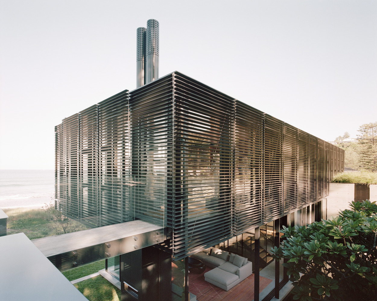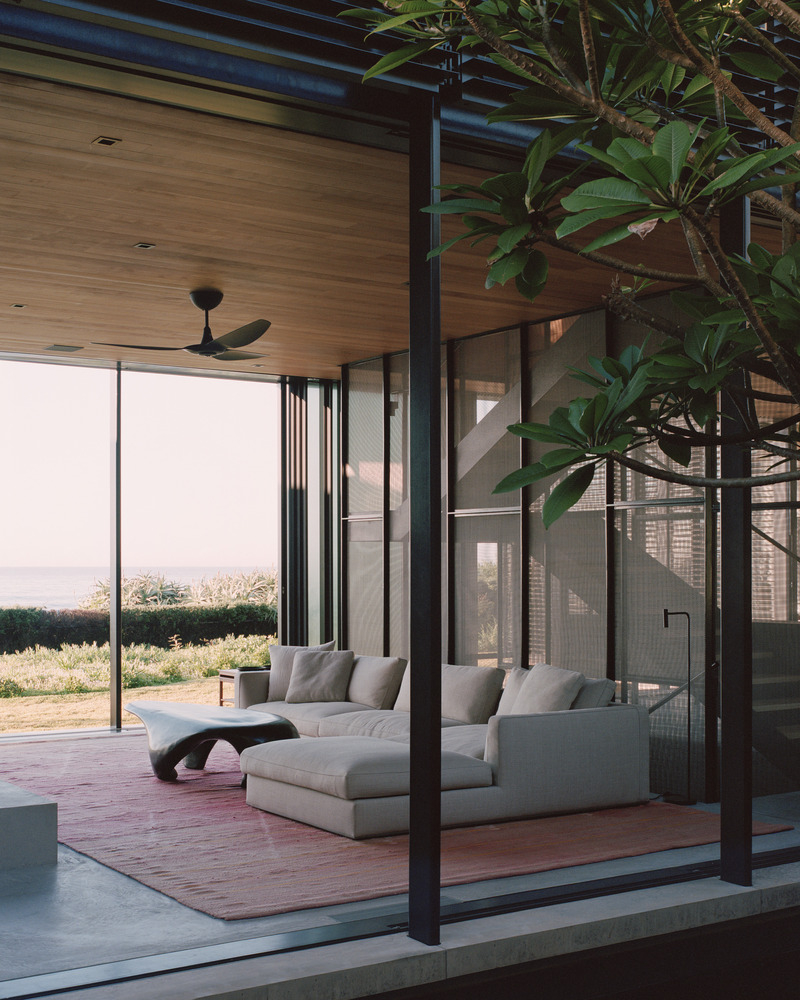 The house is built to withstand the extreme weather conditions of its beachfront location in Australia. It is designed to endure strong sunlight, high winds, and flooding. The structure is elevated on concrete piles, which allows sand and water to flow underneath the building.
