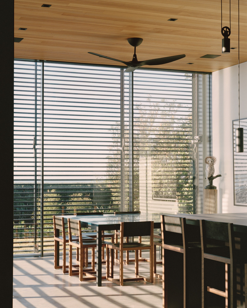 The design of the house enables the family to enjoy the natural surroundings. The retractable window walls provide shade and allow the outside to blend seamlessly with the inside. This design also promotes passive ventilation. Additionally, the interior courtyard brings in filtered daylight, and a central water feature helps to cool the air.