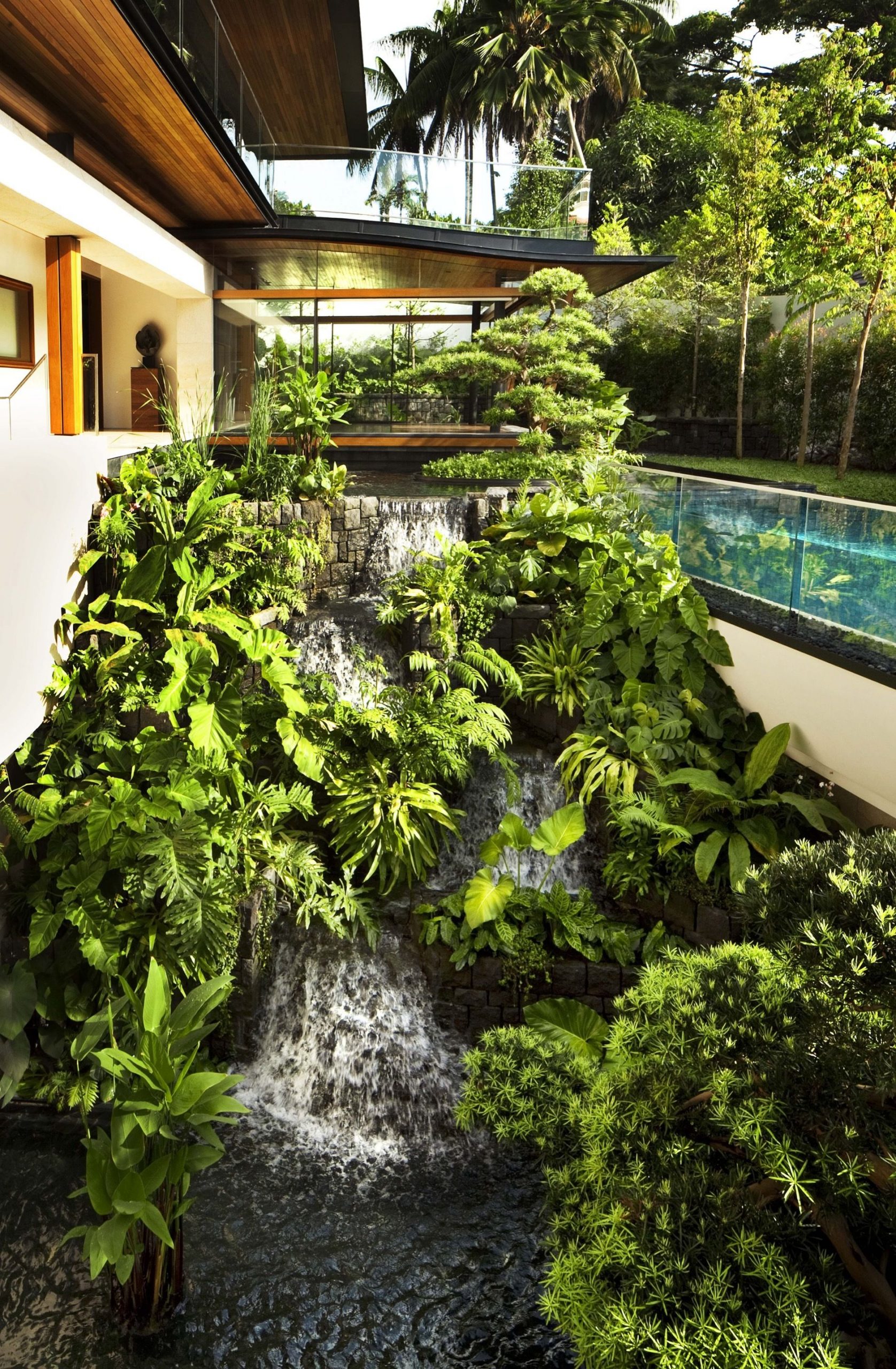 To minimize the discrepancy between the 1/F platform level and the road level it was decided to enter at basement level and to create a light airy basement entry a courtyard was sunk down with a landscaped pond and waterfall to introduce the connection with nature. Even adopting this strategy meant the driveway had to be sinuous and steep.