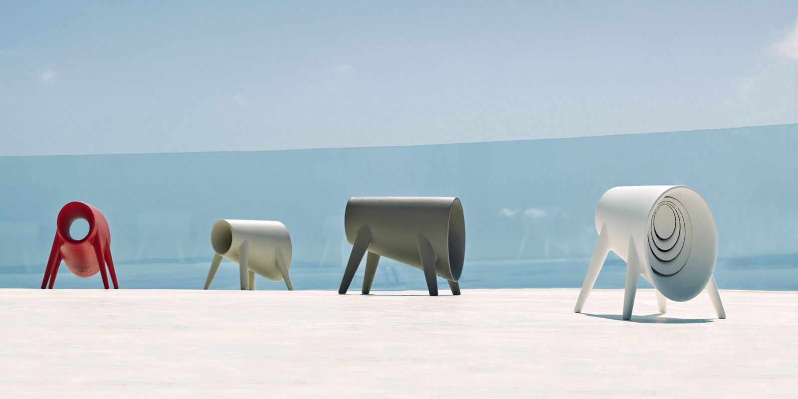 The collection consists of “ BUM BUM” a set of sculptural seating pieces that are suitable for outdoor and indoor purposes. The simplicity of the monochromatic colors and the combination of narrow and curved elements allows the design to have an emphasized presence within a certain space.