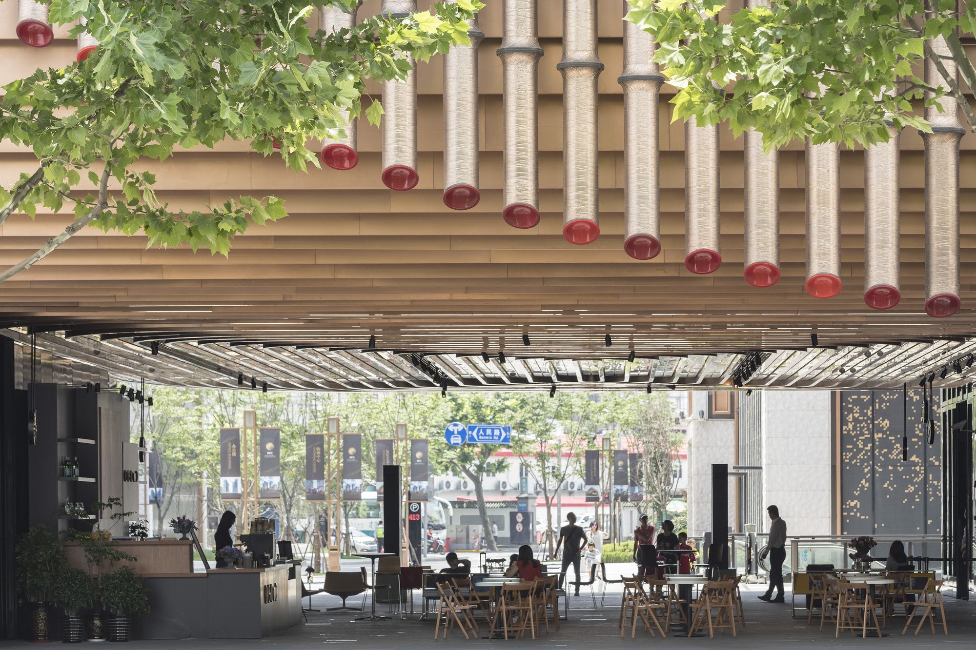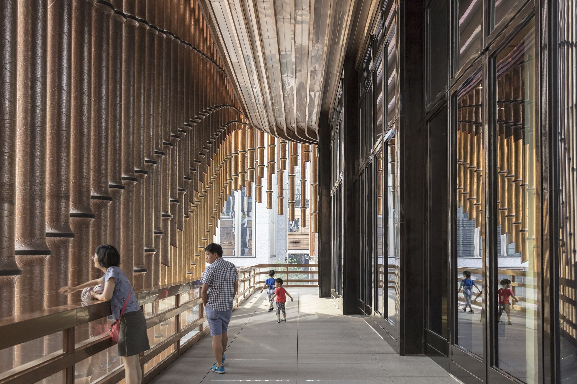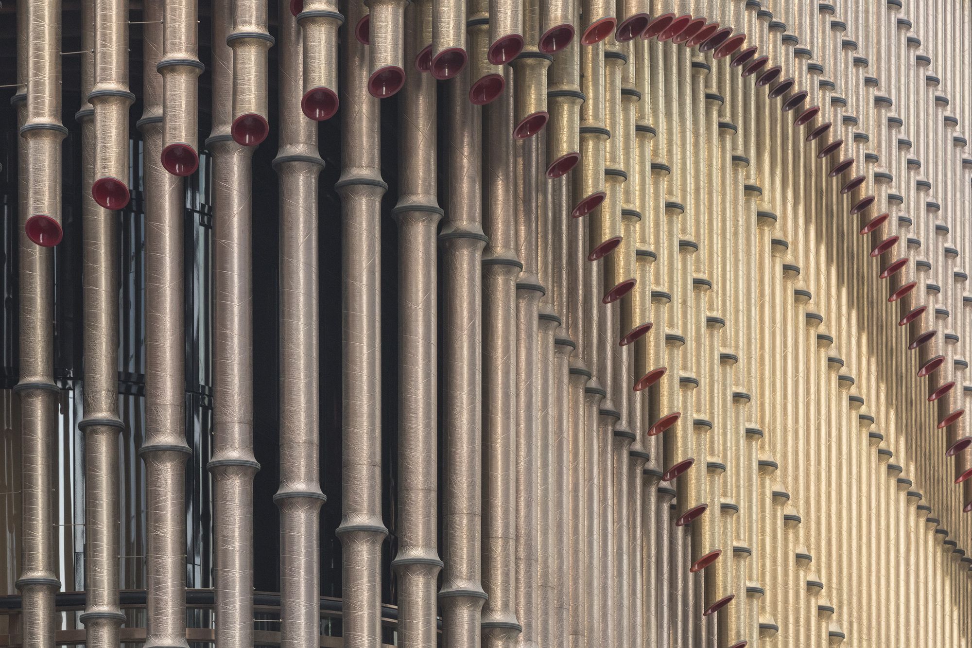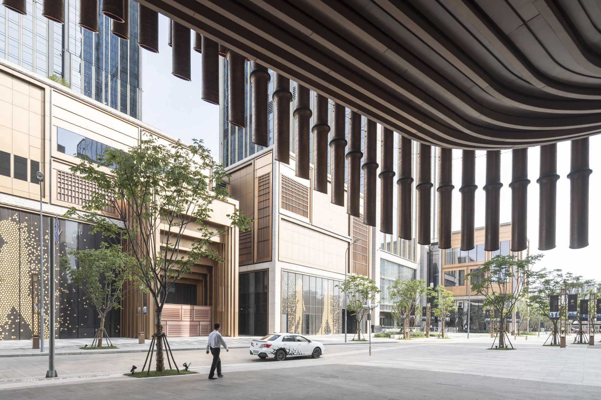 Developed in collaboration with local engineers Tongji University, the façade is a veil organised along three tracks and made up of layers of 675 individual magnesium alloy ‘tassels’ – a reference to the traditional Chinese bridal headdress. The tassels range in length from around 2 metres to 16 metres so that as each track independently moves, the veil rotates with the tassels overlapping and producing different visual effects and levels of opacity.