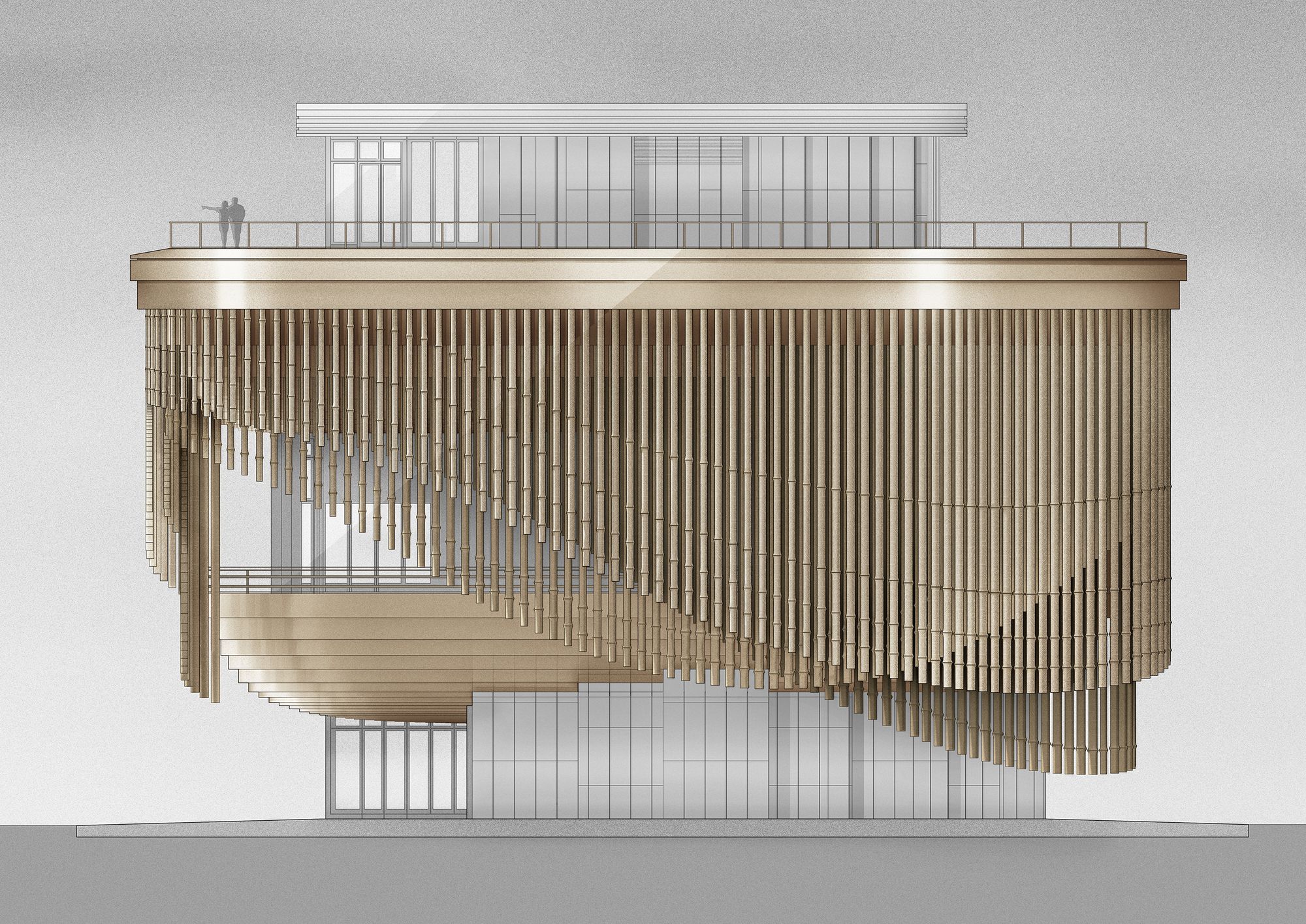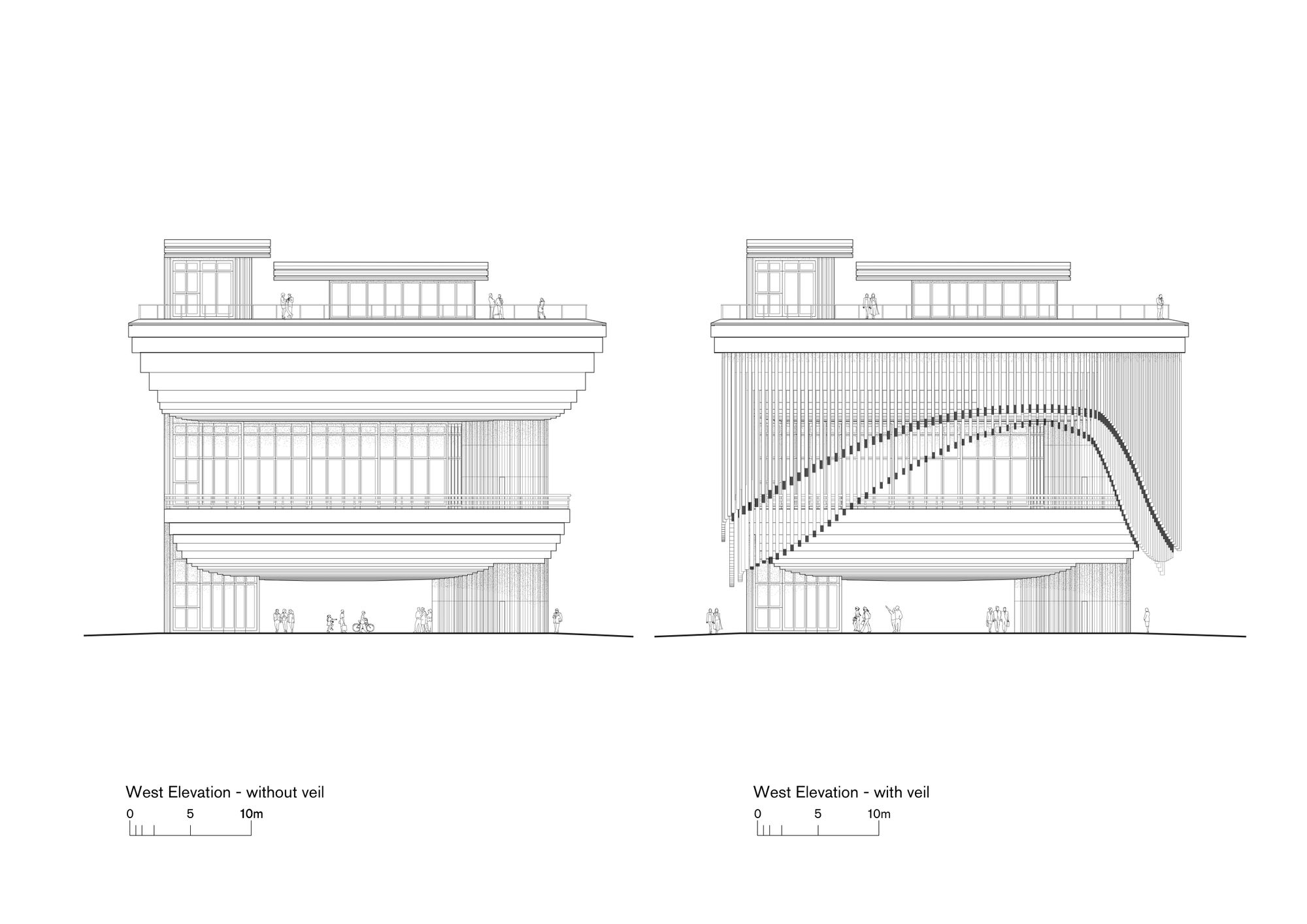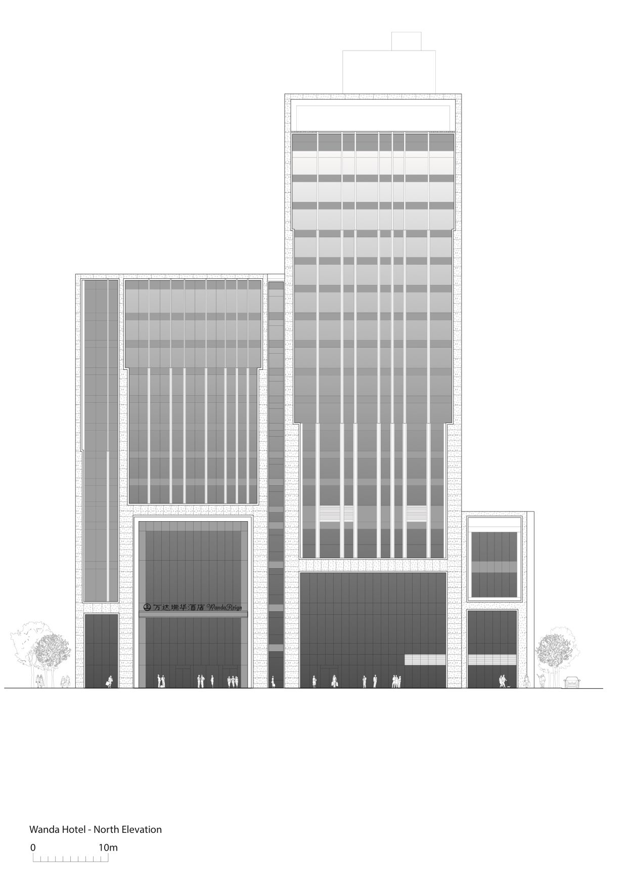 The retail spaces are vertically layered with boutiques, concept stores for international brands, a luxury shopping mall and restaurants. A palette of crafted stone and bronze details gives the buildings a jewel-like quality. The edges of each volume are made of richly textured, hand-crafted granite and become slimmer as they rise, giving the impression of solidity at the base and transparency at the top. The social focus of the scheme is the cultural centre, conceived as a platform for international arts and cultural exchange, as well as a place for brand events, product launches and corporate functions. The building is encircled by a moving veil, which adapts to the changing use of the building and reveals the stage on the balcony and views towards Pudong.