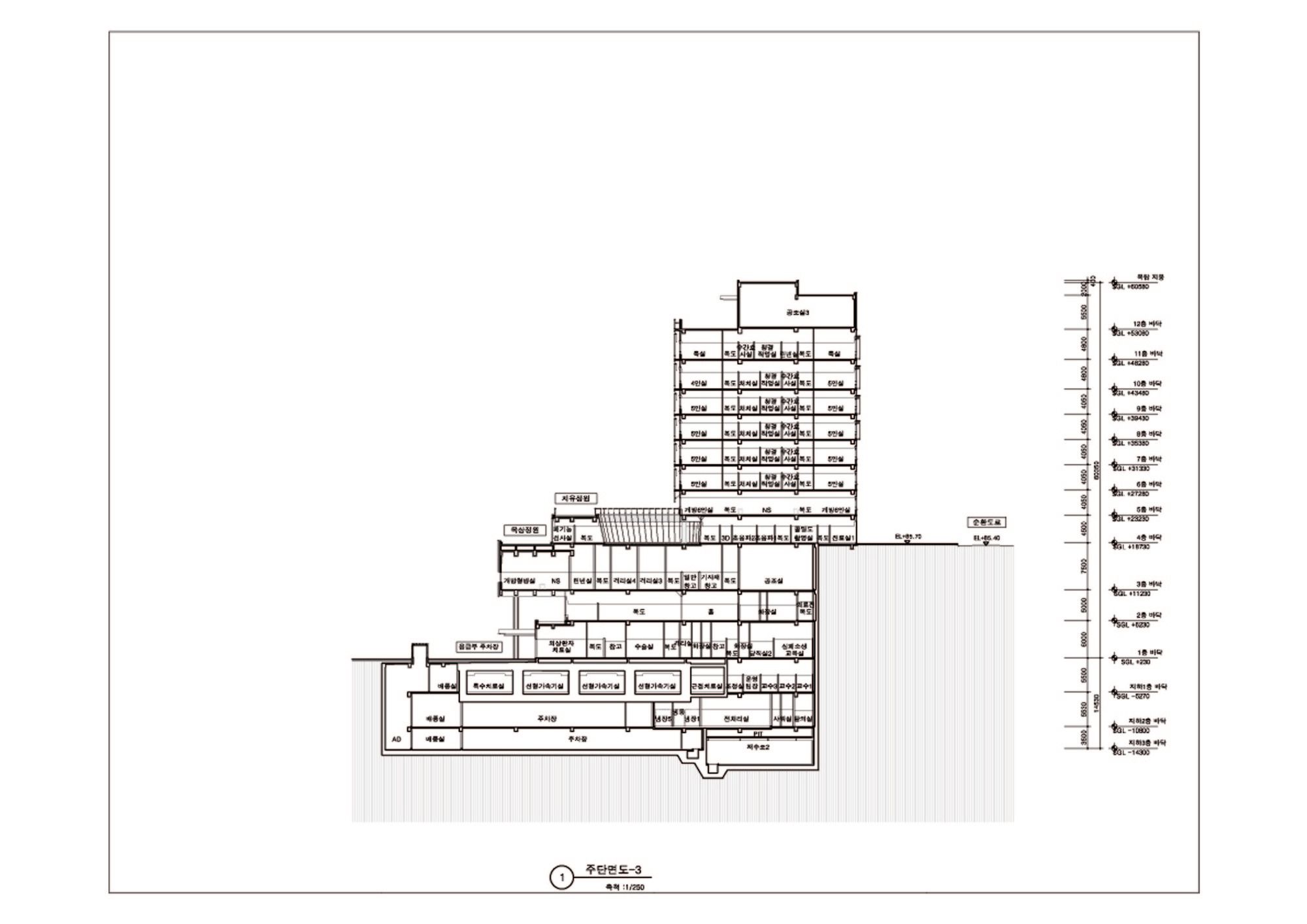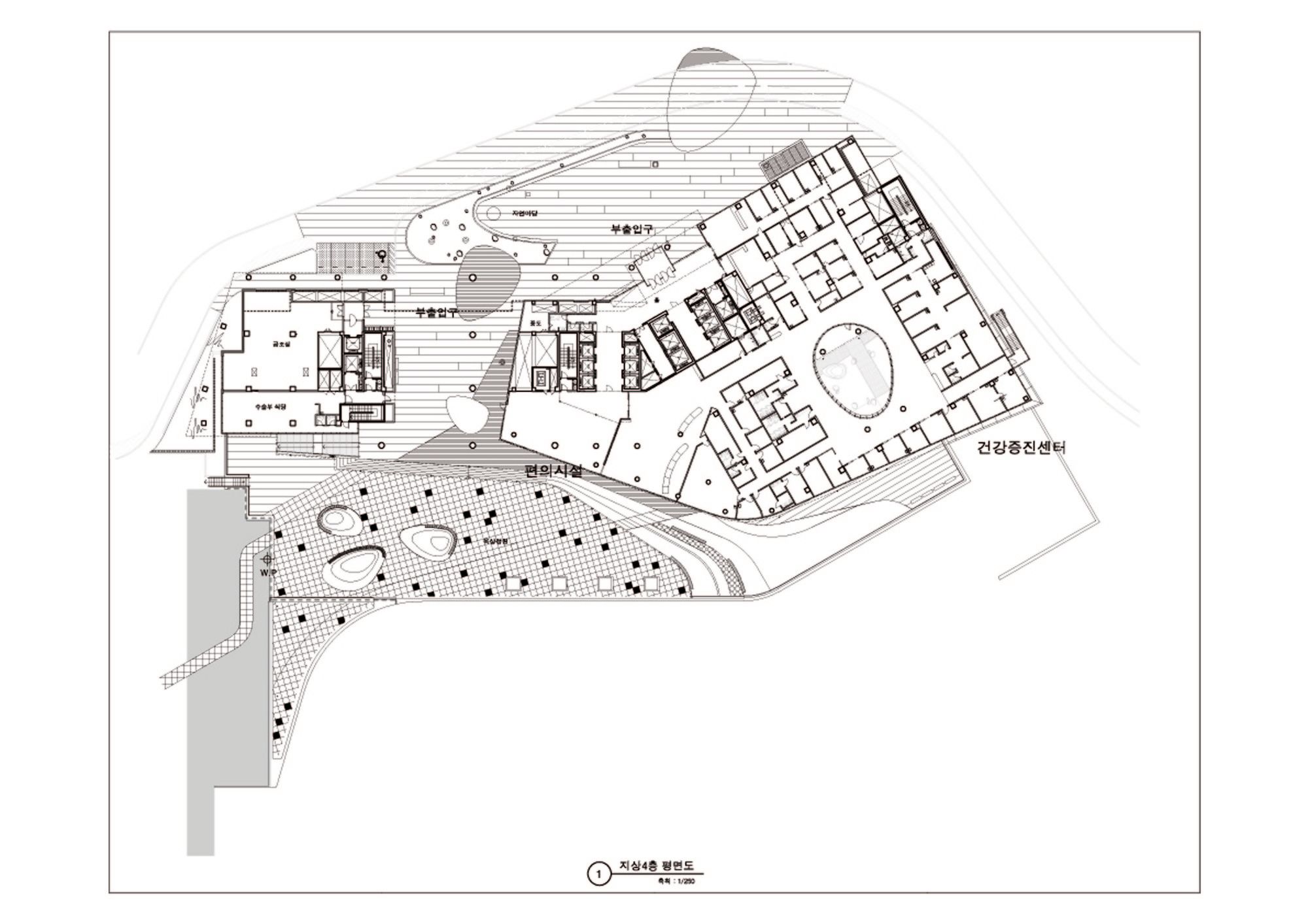 The new building’s backyard faces Bulgok Mountain and the wind from Bulgok Mountain blows past the Health Promotion Center, passing through two-stories-high Piloti and blows to the roof garden and Tancheon. The new building has enough open space and harmonizes with the surrounding environment through the nature-like image creation, and makes an eco healing environment by containing nature in the outdoor garden, front square, Piloti and indoors.