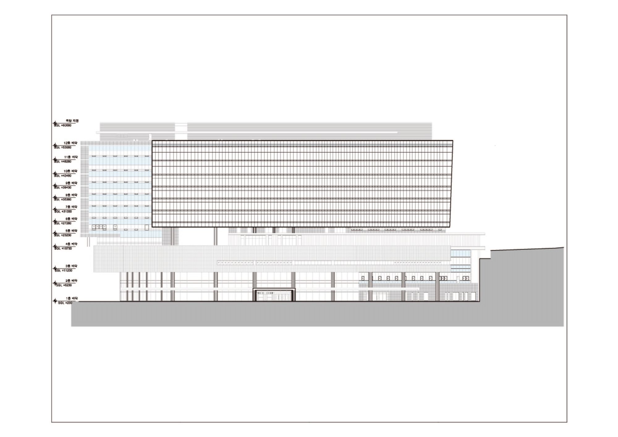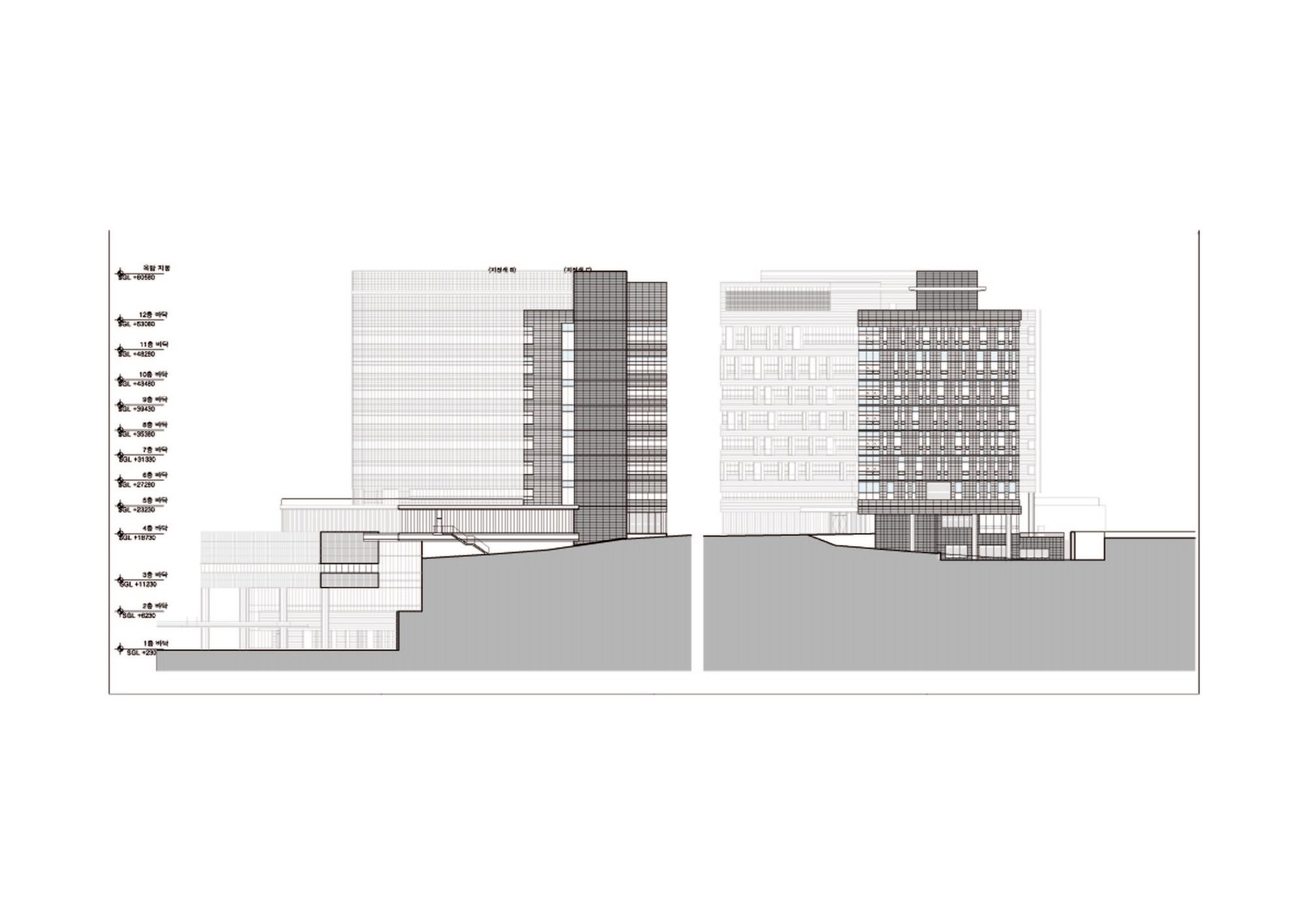 The new building is located on the right slope from the entrance to Bundang Seoul National University Hospital. The site is adjacent to the main building and inclines towards the west. We faced constant questions and concerns until the last second when the final proposal was confirmed, due to discord about issues such as a connection with the existing main building, the shape of the land and a consideration of direction.