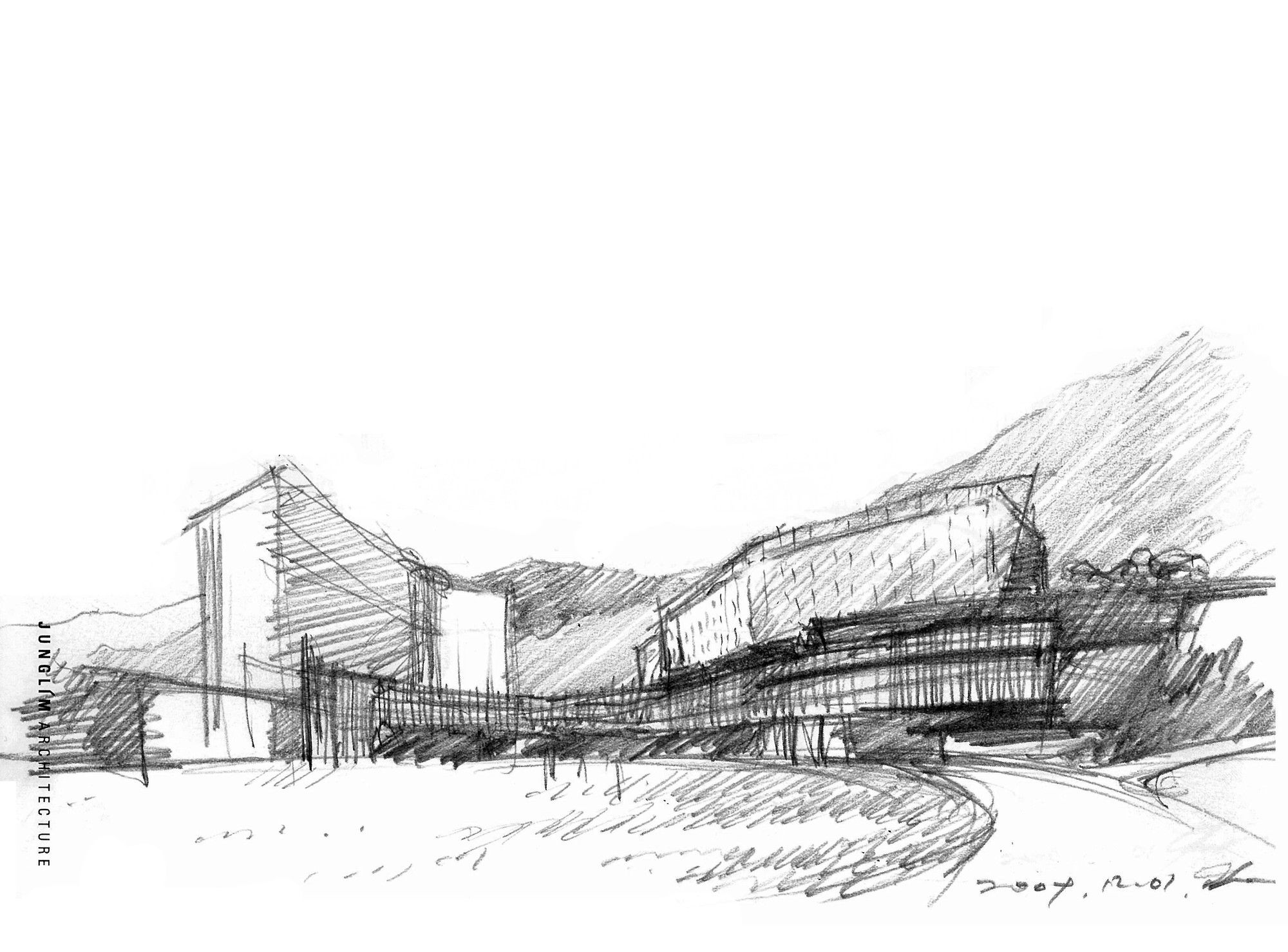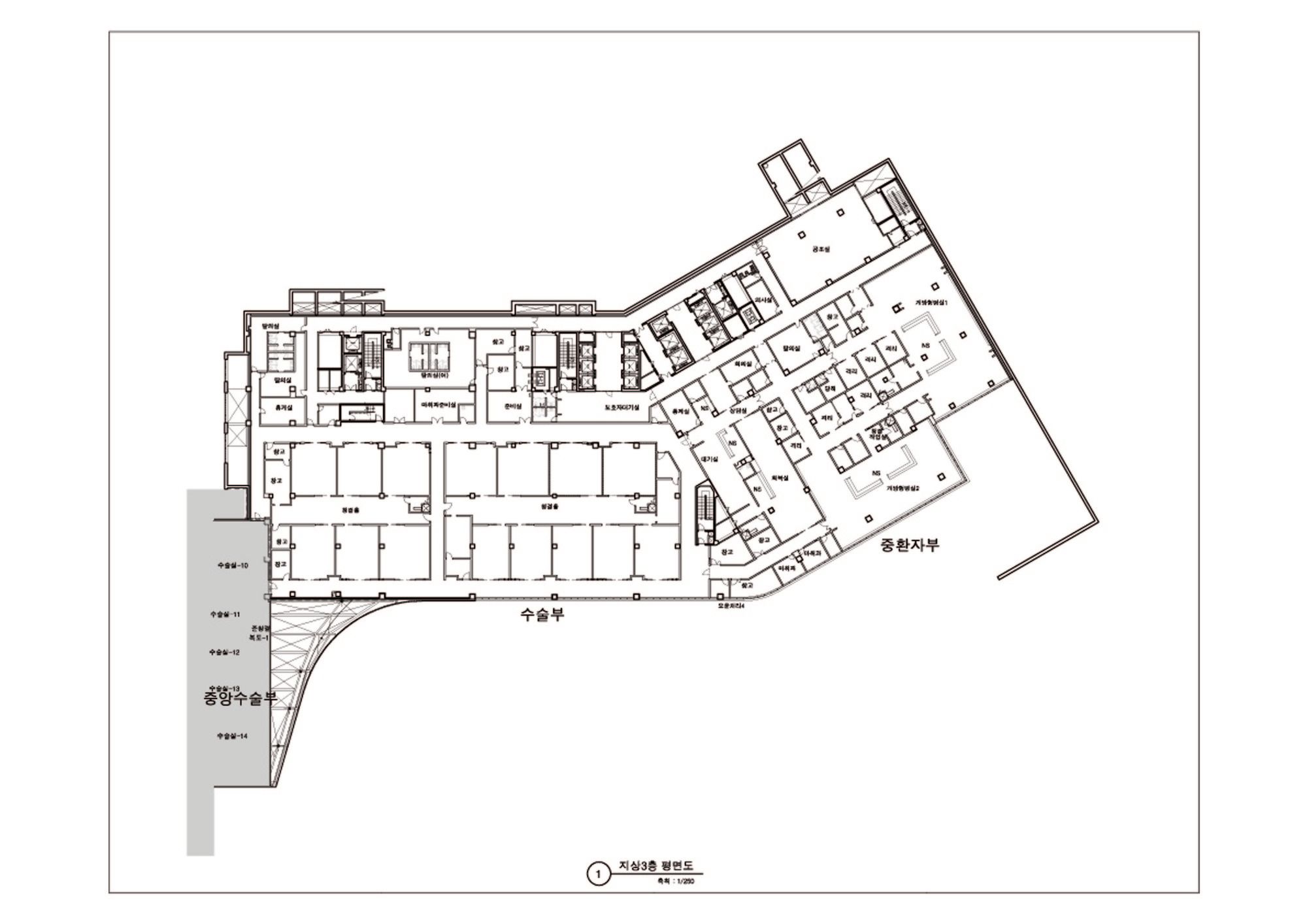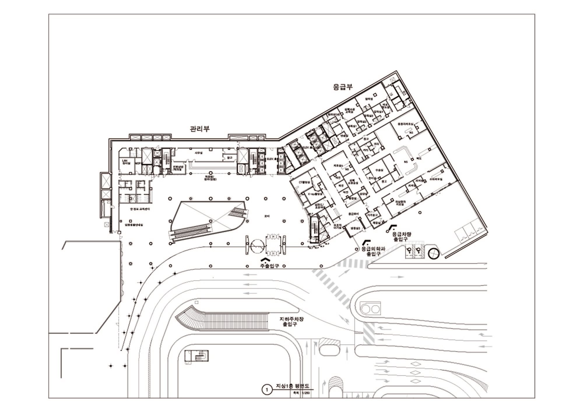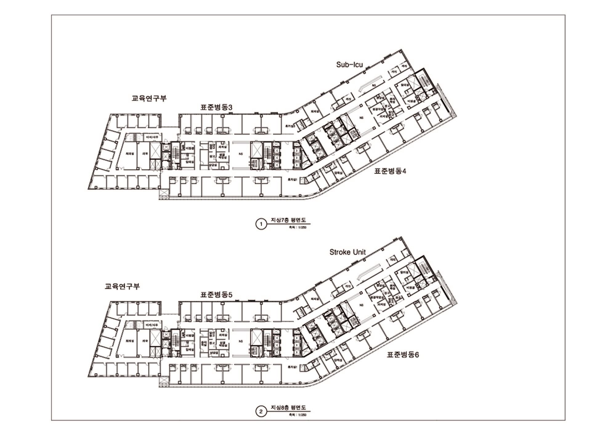 The upper floor’s ward should have an advanced image of the future andexpress the new hospital’s image. However, because it is placed at the entrance, it is likely to impede the main building’s representation and to deter the hospital’s awareness. Therefore, we designed it with the shape of going back gradually by approach line in order to minimize the visual interference with the main building. We also made the layout along the outdoor transition zone flow and tried to maintain the independence of each by properly separating from the main building’s wards.