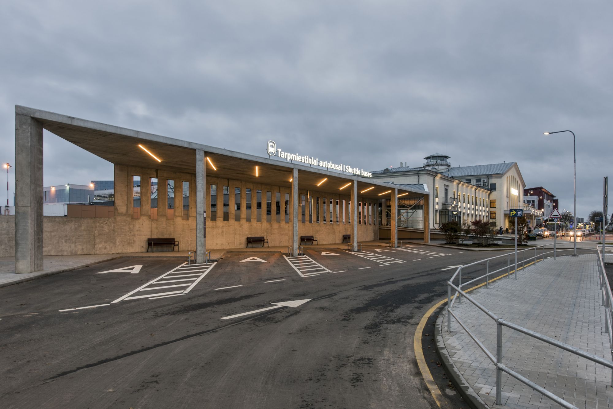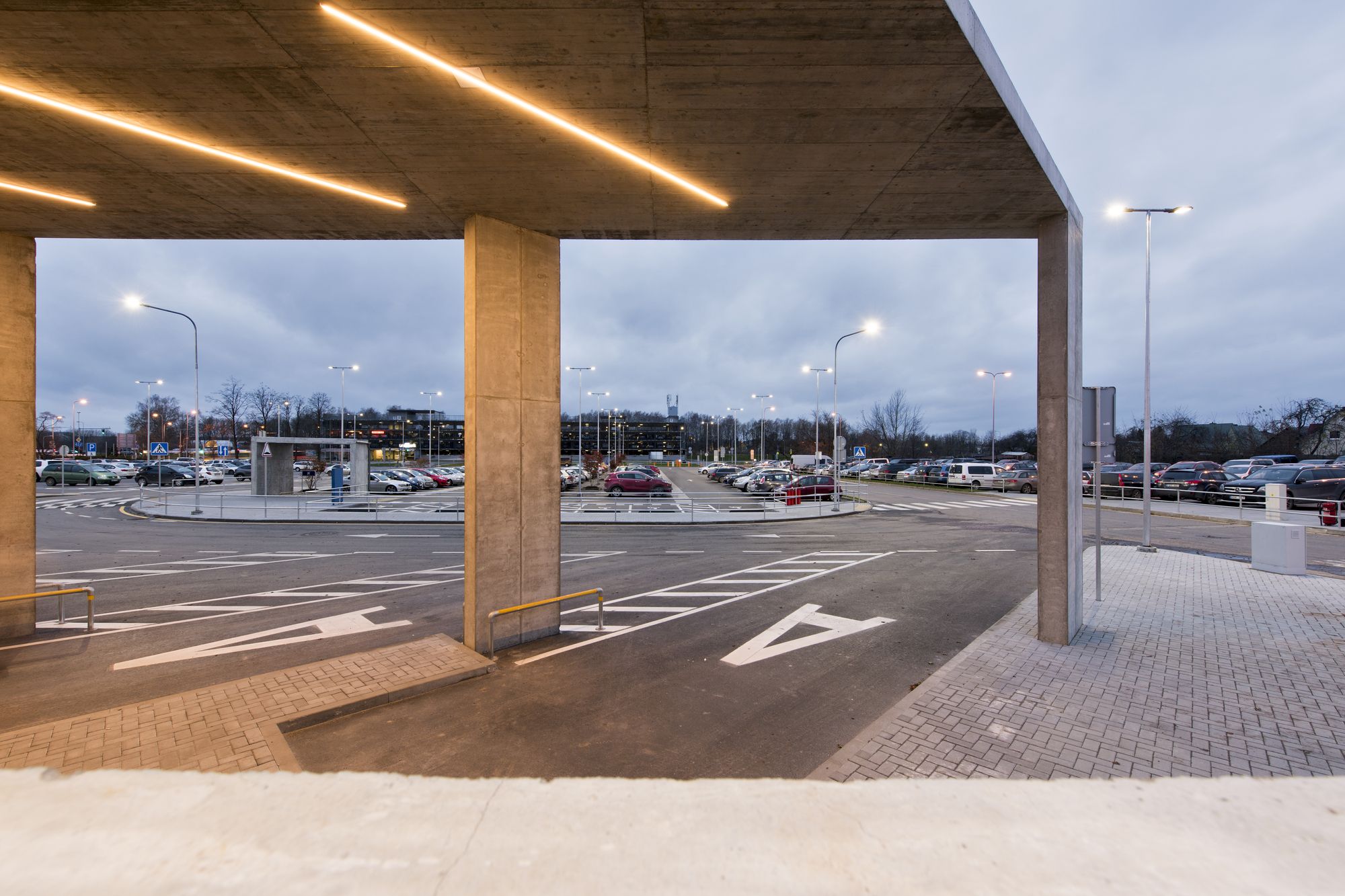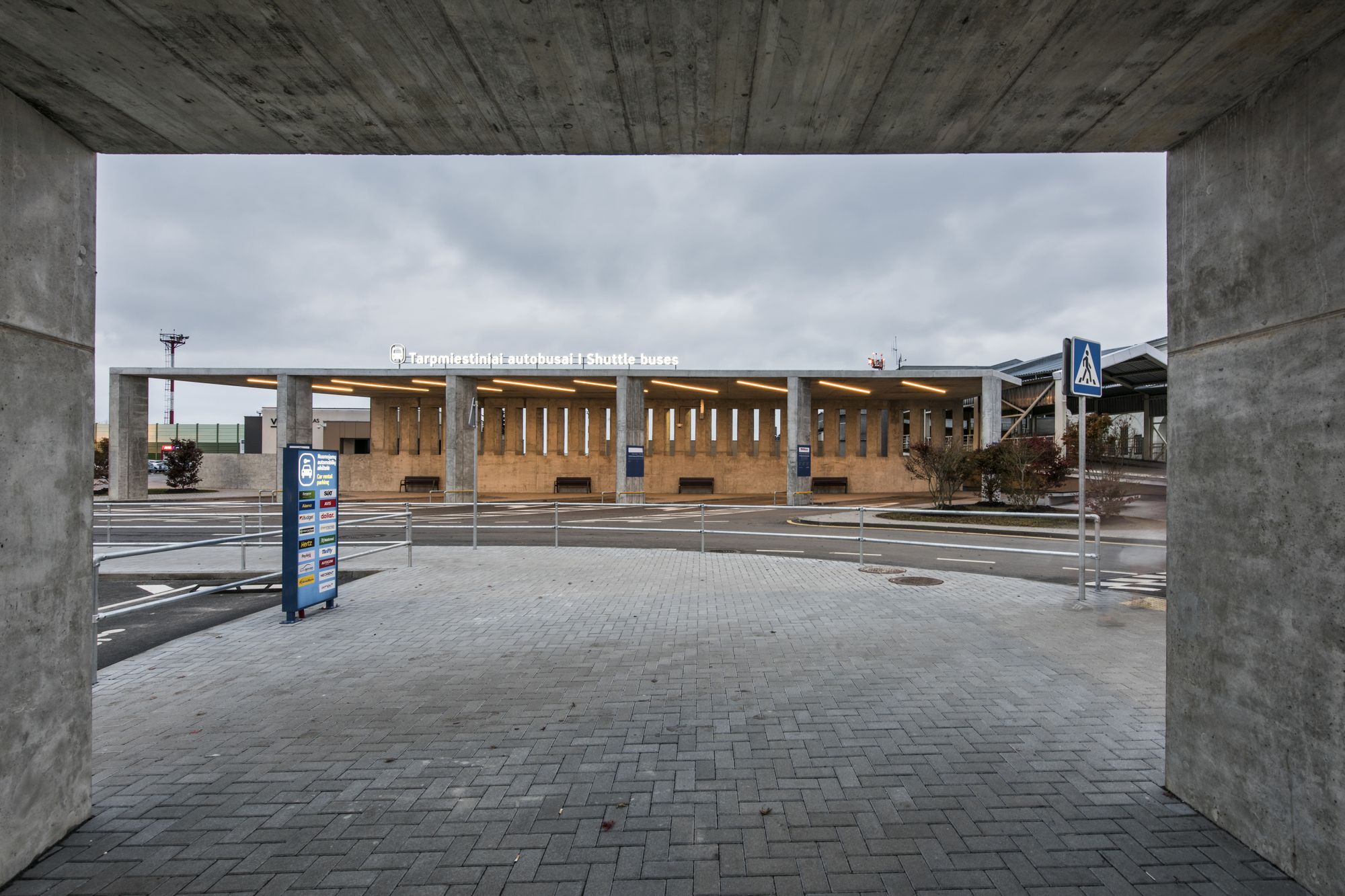 Designed by Vilniaus architektūros studija, According to the need of parking spaces and shuttle bus stop at Vilnius international airport, more than 150 additional car parking spaces and 11 bus parking spaces were designed, including five bus parking spaces under this new shed. Vilnius international airport terminal was originally designed during the period of Soviet occupation of Lithuania, by architects Dmitrij Burdin and Genadij Jelkin and built in 1954 by war prisoners. Later the terminal building was reconstructed several times and some cells, including a new terminal and car ramp, were built.