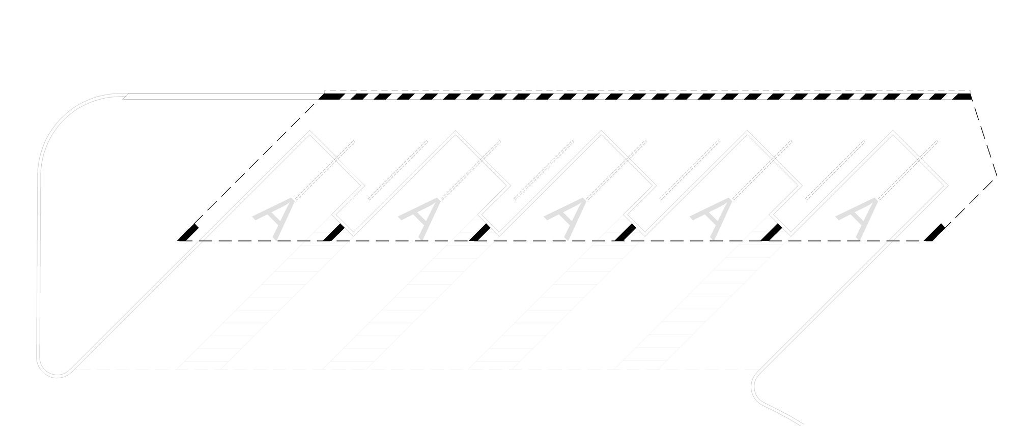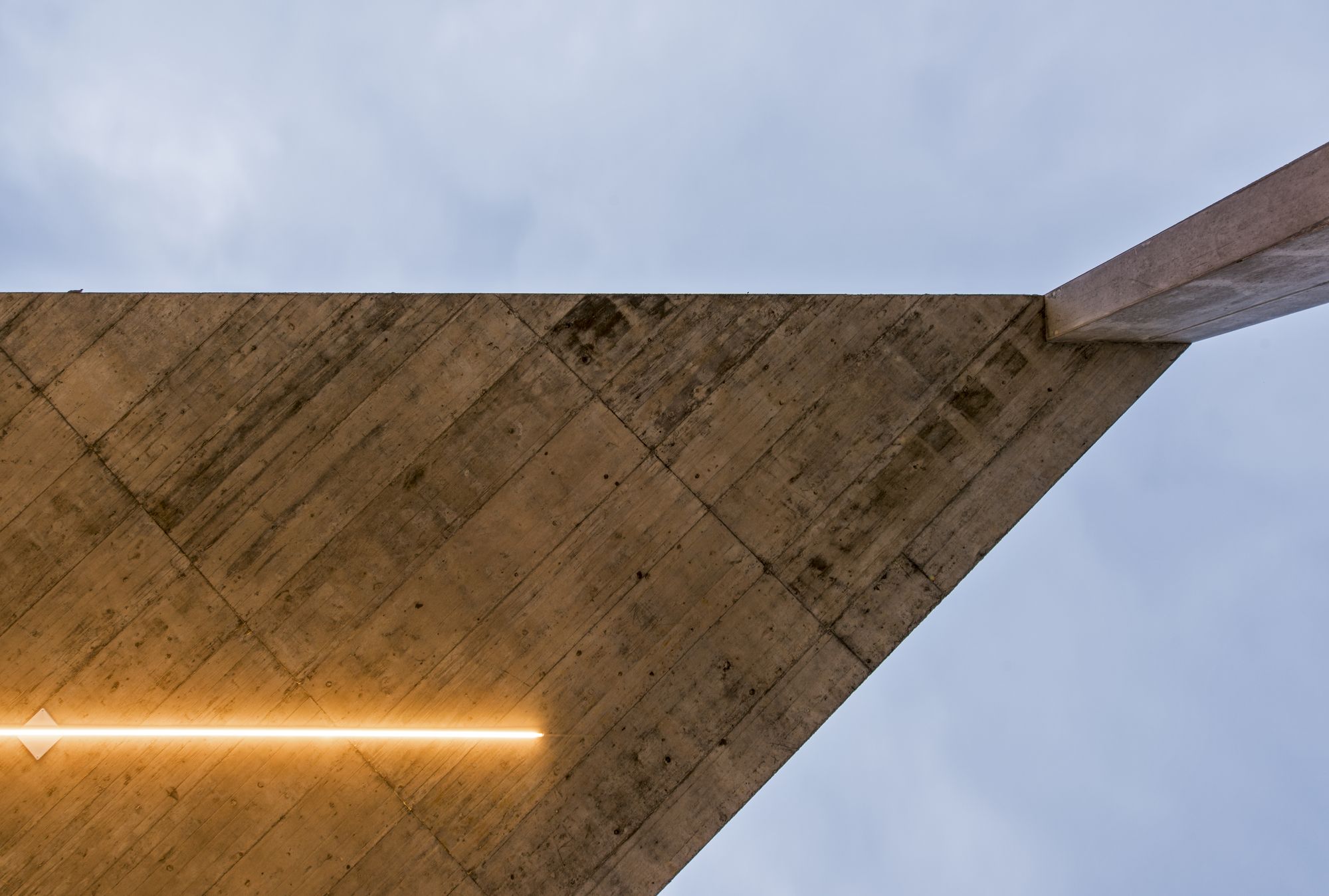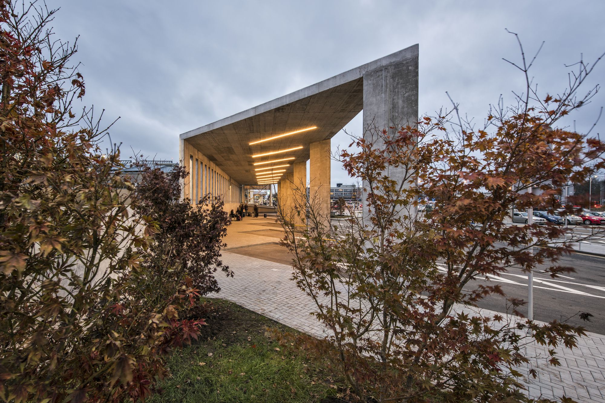 Its sculptural form with all of its plan elements is compositionally orientated diagonally – towards bus arriving direction. Its rear wall is built to separate public transport and VIP zones and lets in some natural sunlight from the southeast side at daytime through narrow vertical openings. At nighttime cold concrete surfaces of the inner shell of the bus, stop shed is highlighted by the warm light of diagonally orientated luminaries.