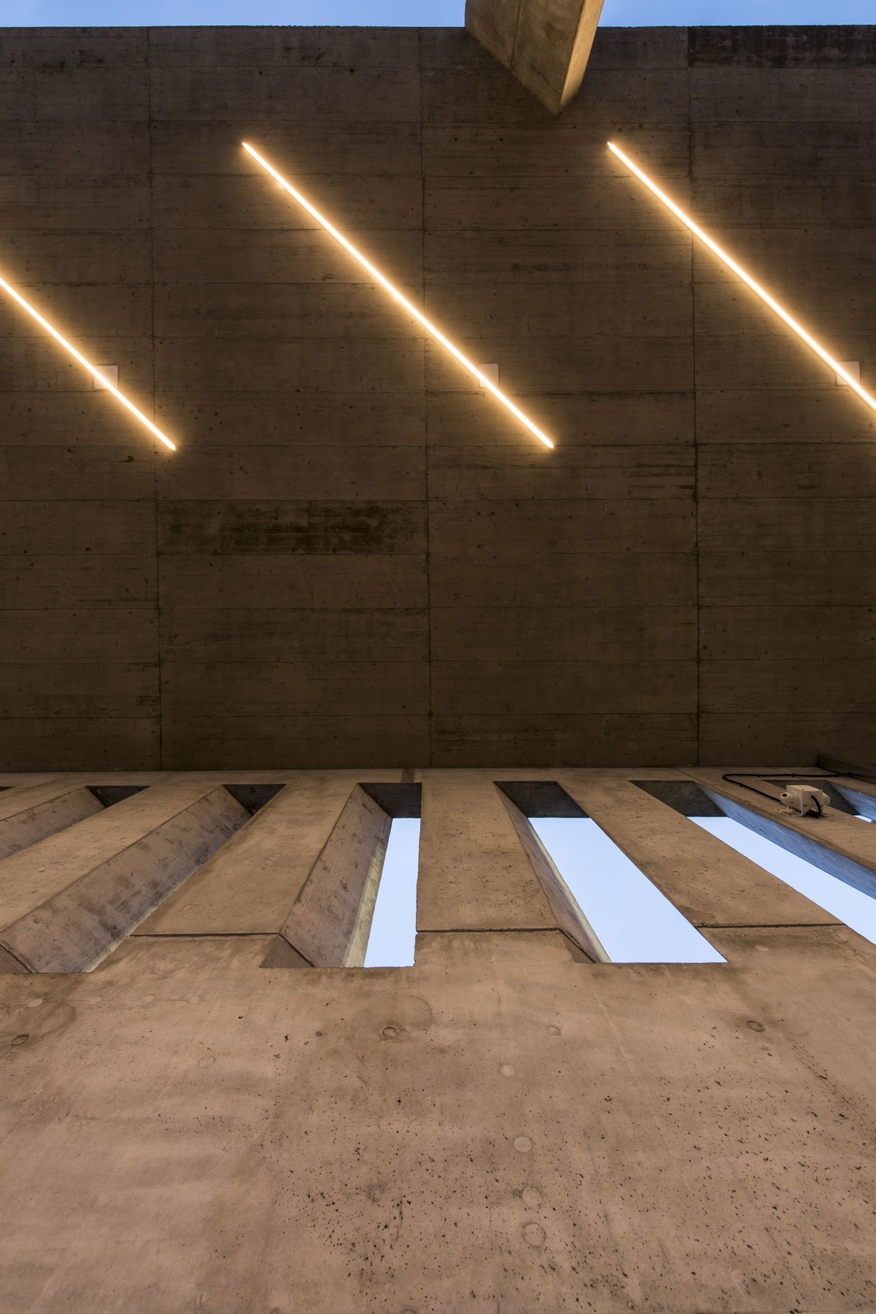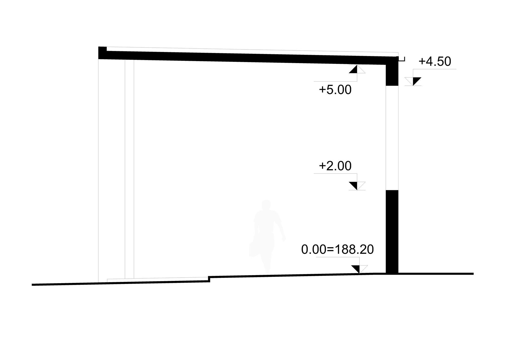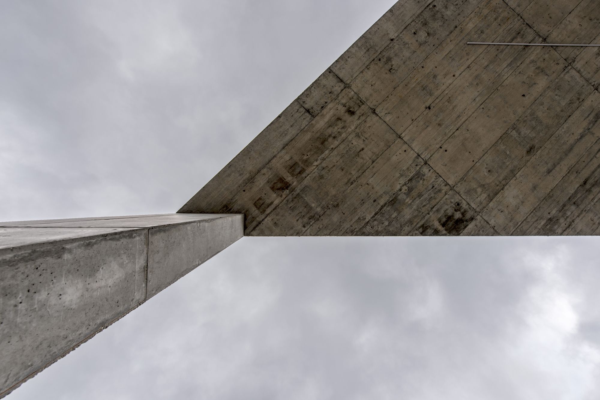 Its sculptural form with all of its plan elements is compositionally orientated diagonally – towards bus arriving direction. Its rear wall is built to separate public transport and VIP zones and lets in some natural sunlight from the southeast side at daytime through narrow vertical openings. At nighttime cold concrete surfaces of the inner shell of the bus, stop shed is highlighted by the warm light of diagonally orientated luminaries.