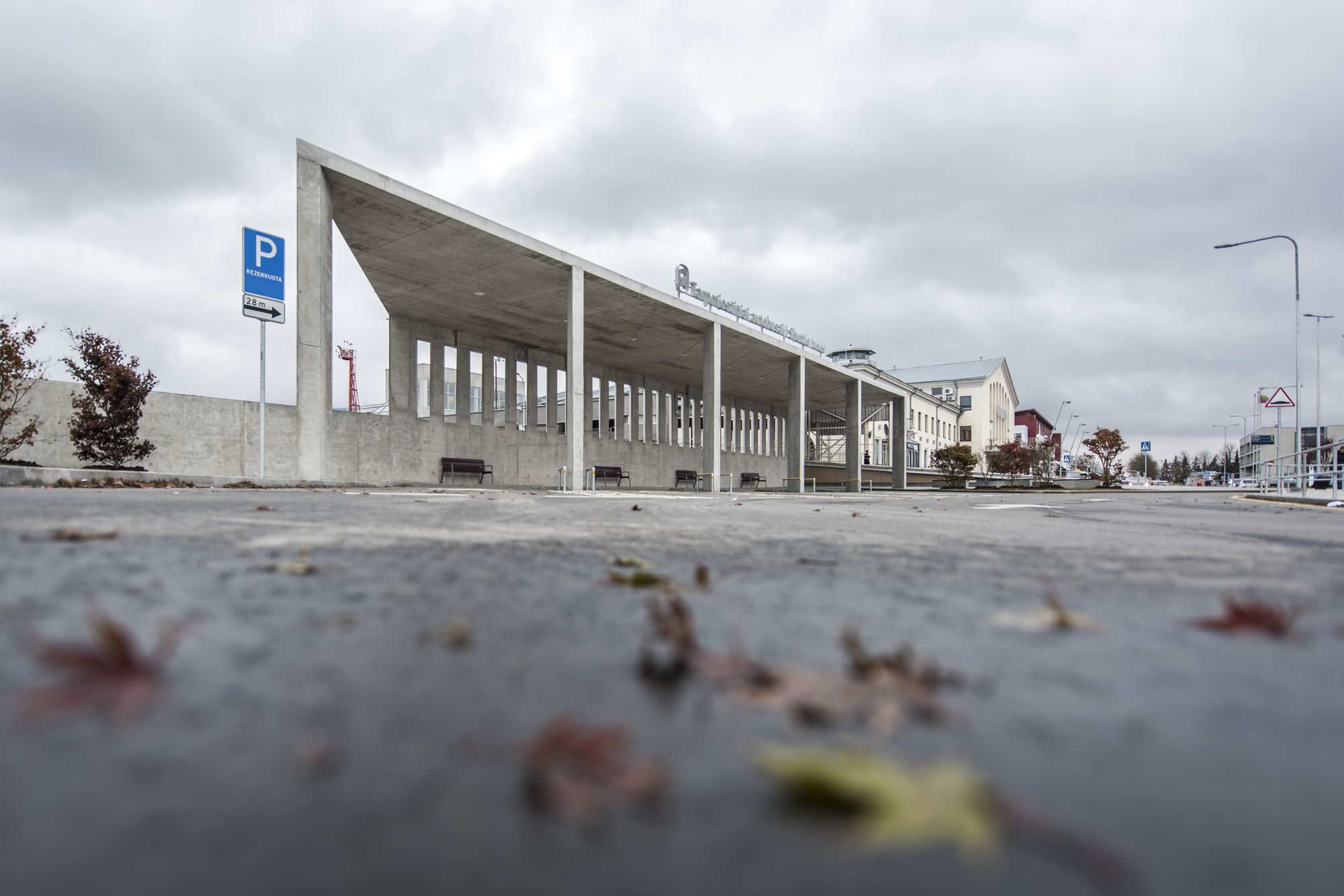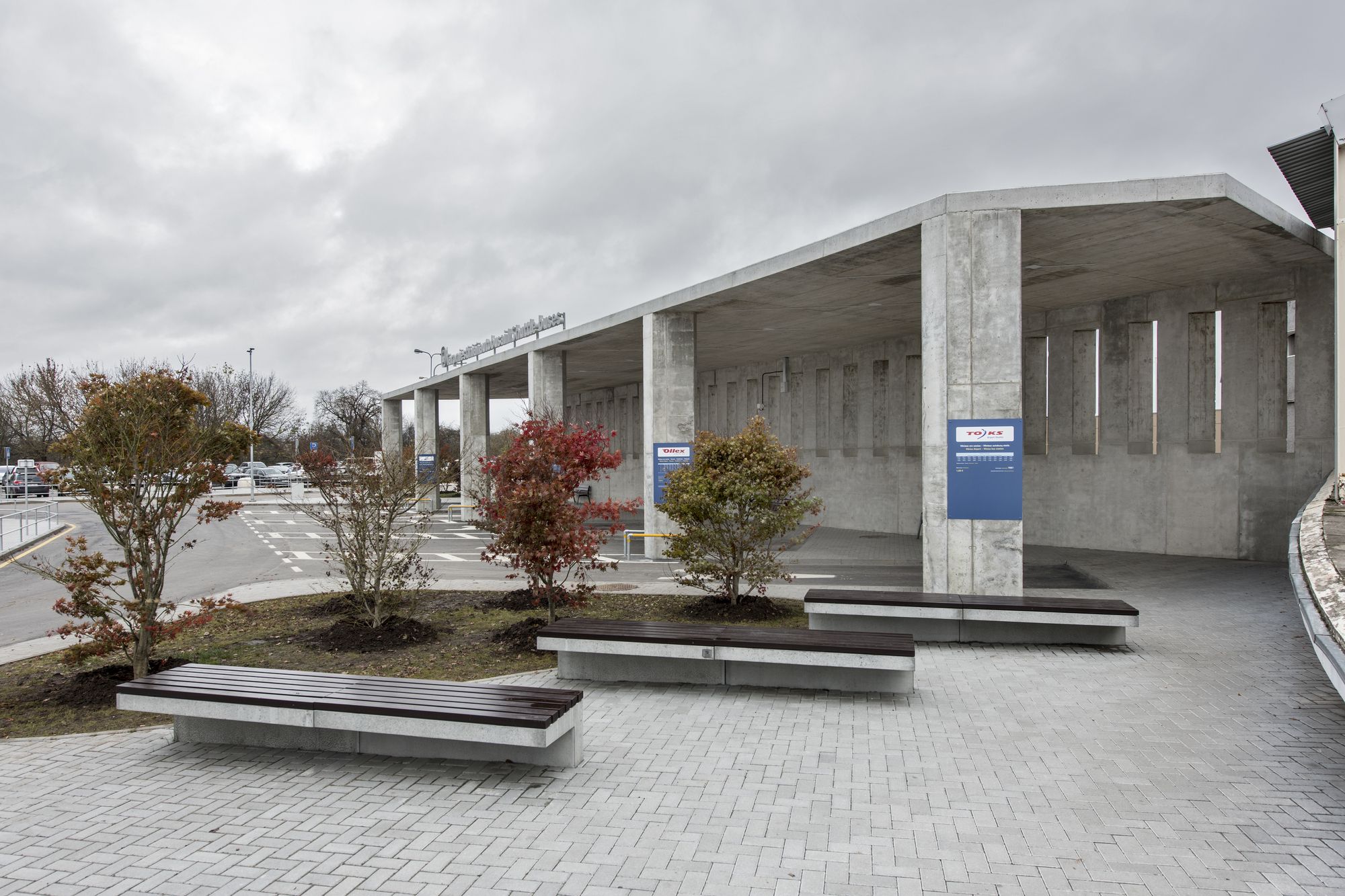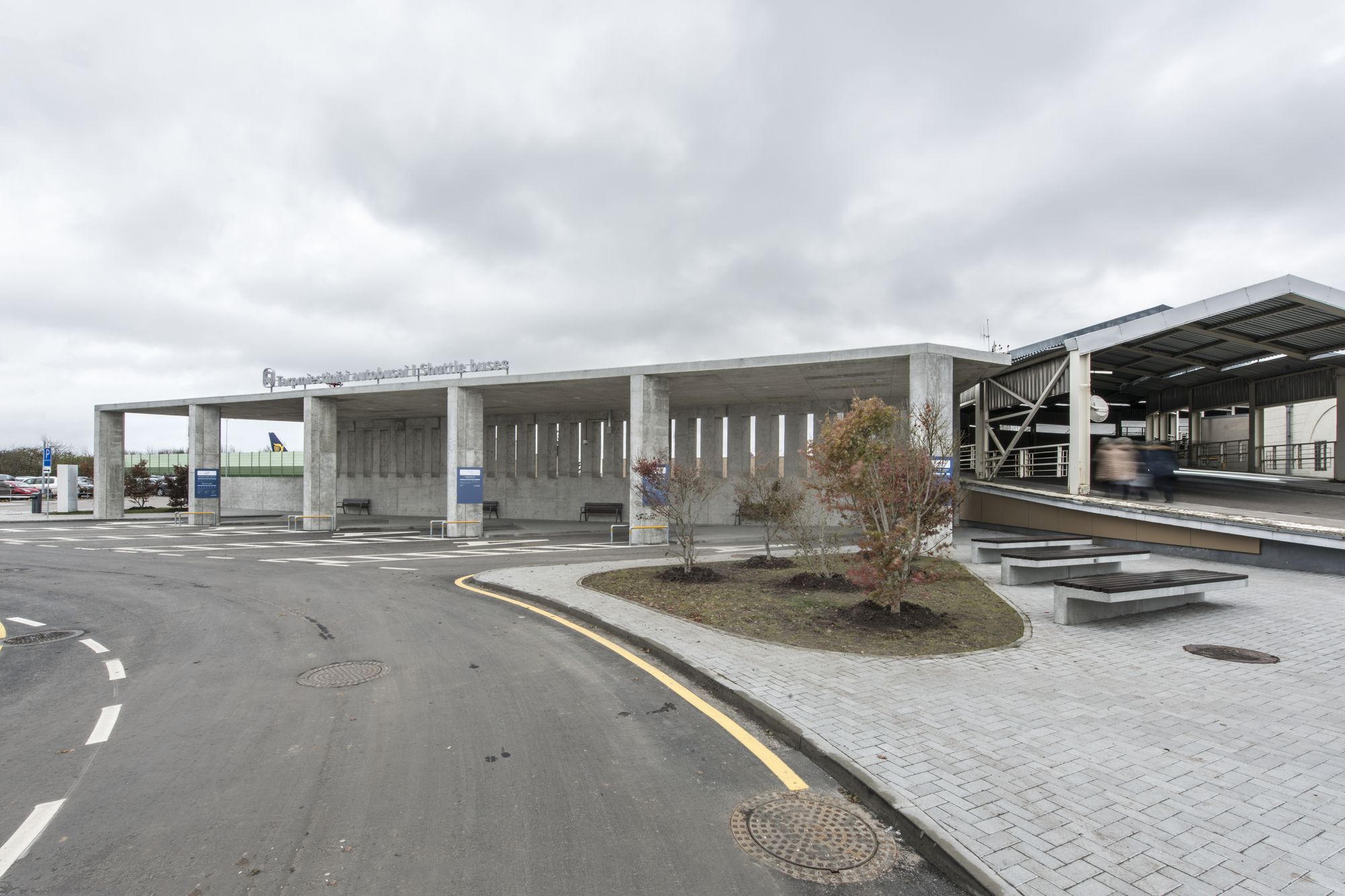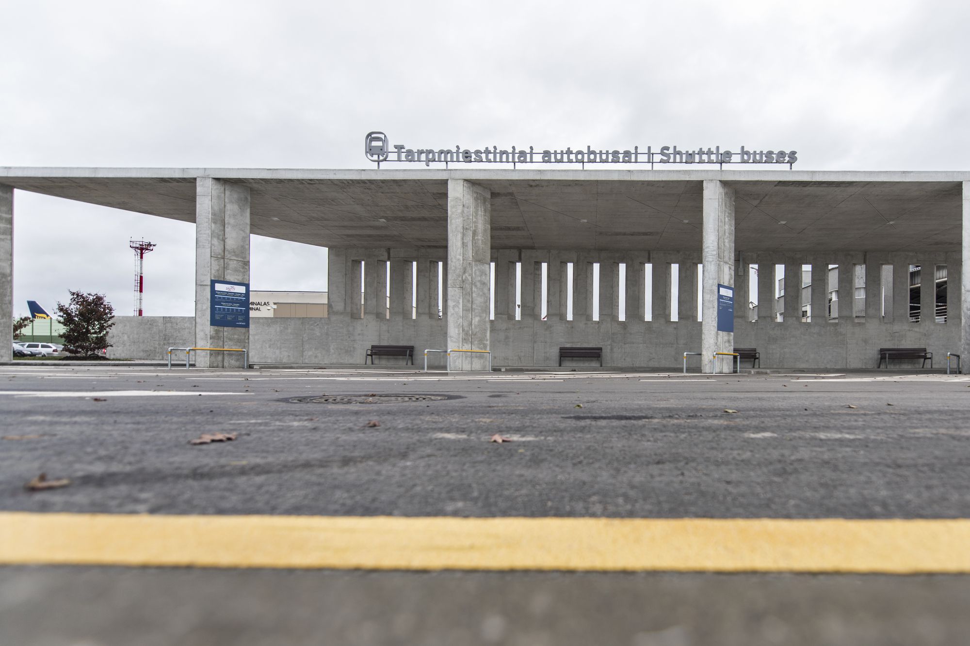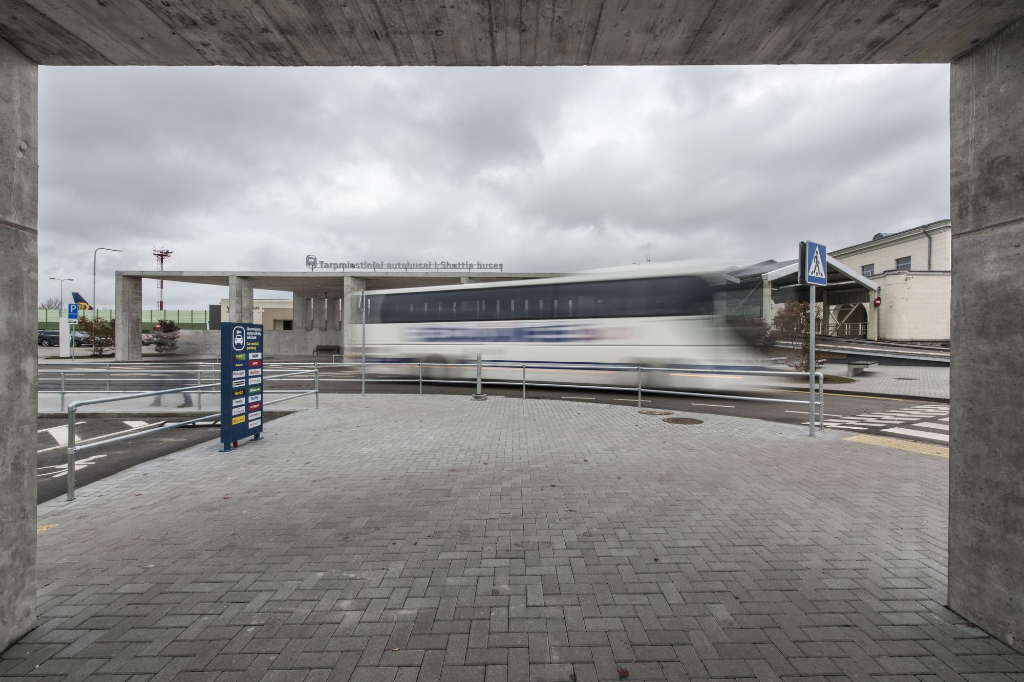 The place for the new bus stop was chosen according to the customer approved site transport scheme, so the bus stop shed ended up situated on the left side wing of the terminal building and one end of it appears to be almost attached to the car ramp. In order to avoid domination or false striving to adapt to existing different architecture terminal buildings, minimalistic form and neutral raw concrete material were chosen.