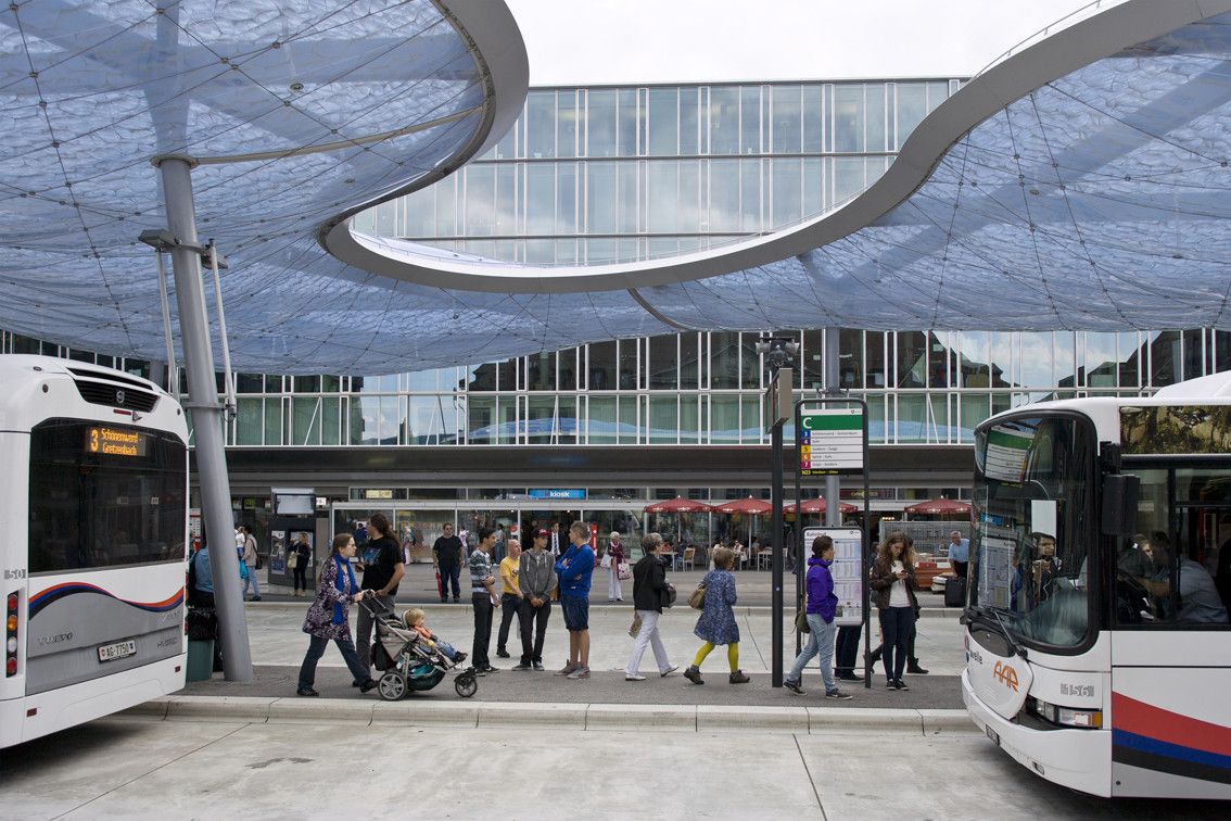 The wave-like, umbrella structure constructed above the bus terminal and railway station in Aarau Switzerland was developed by Vehovar & Jauslin Architektur. The design also highlighted and emphasized previous pedestrian pathways and underpasses.