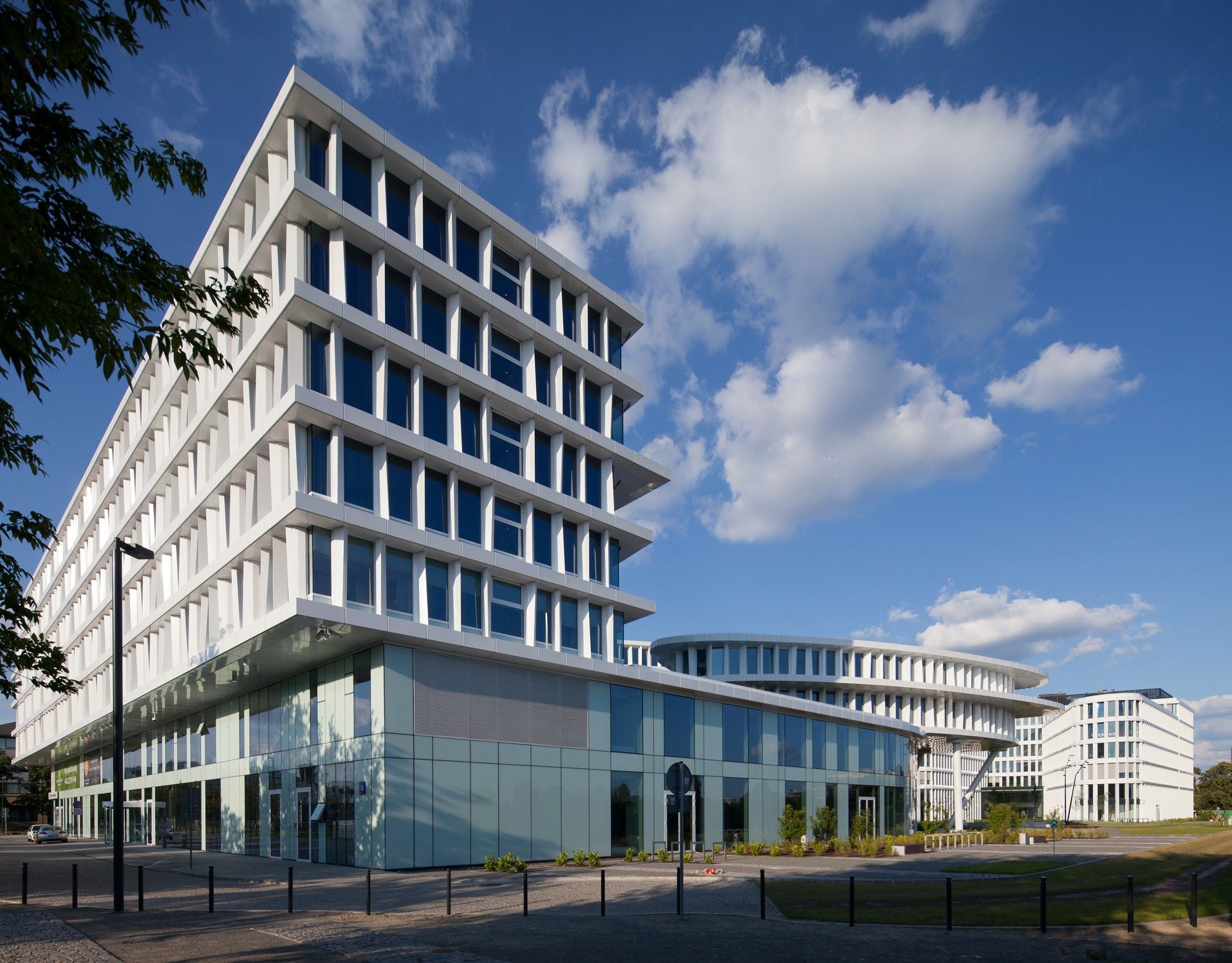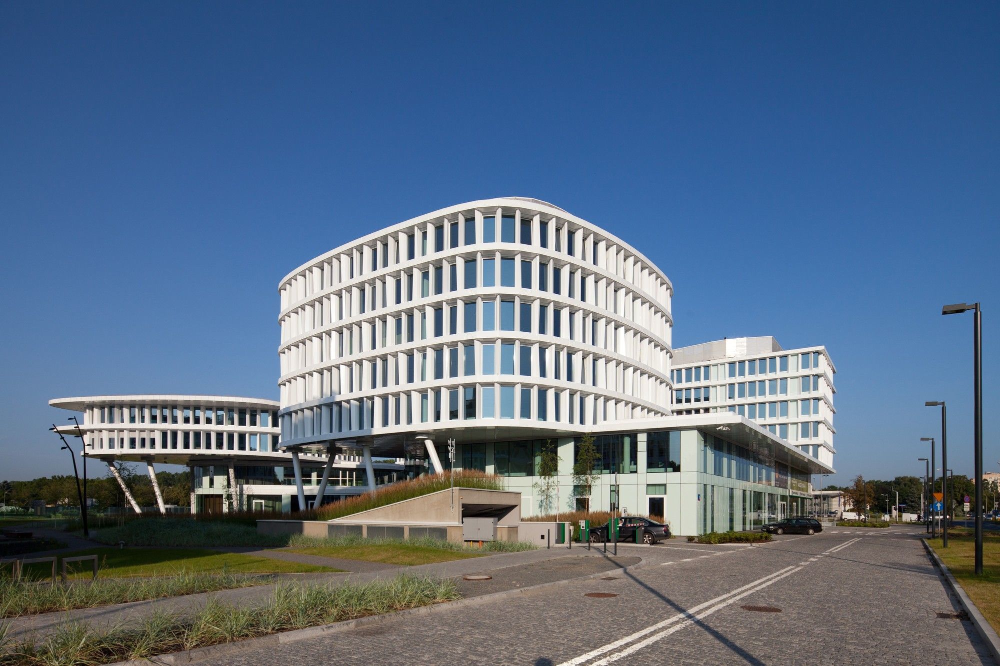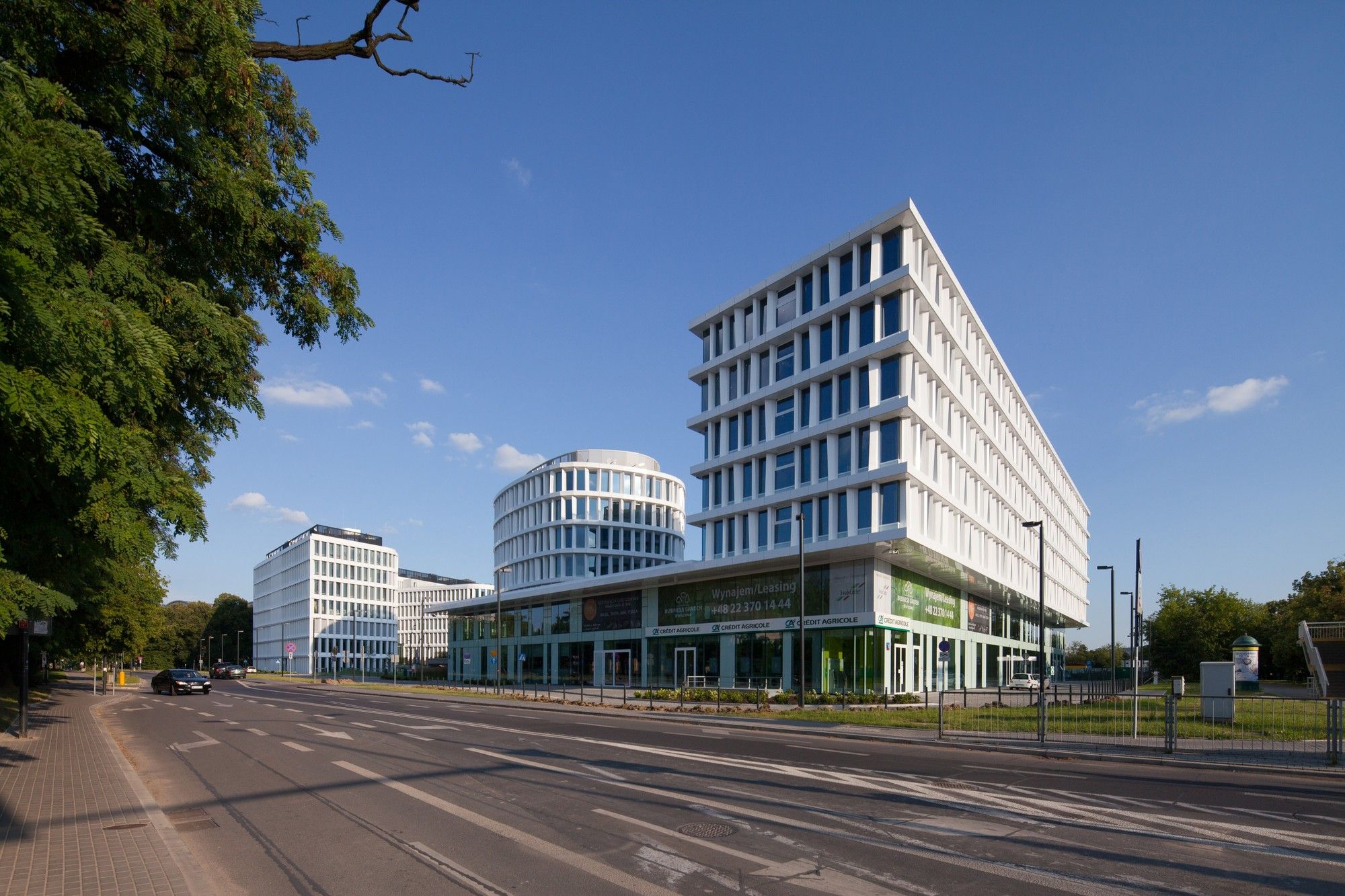 A sculptural volumetric strength showing the different functions which had to be integrated in the design process are the basic idea of the complex while taking care about the surrounding aspects of the closer cityscape of Warsaw and the idea of the central Wisniowy Garden Park. The facades towards streets are straight, while the façade lines towards the park are moving slightly.