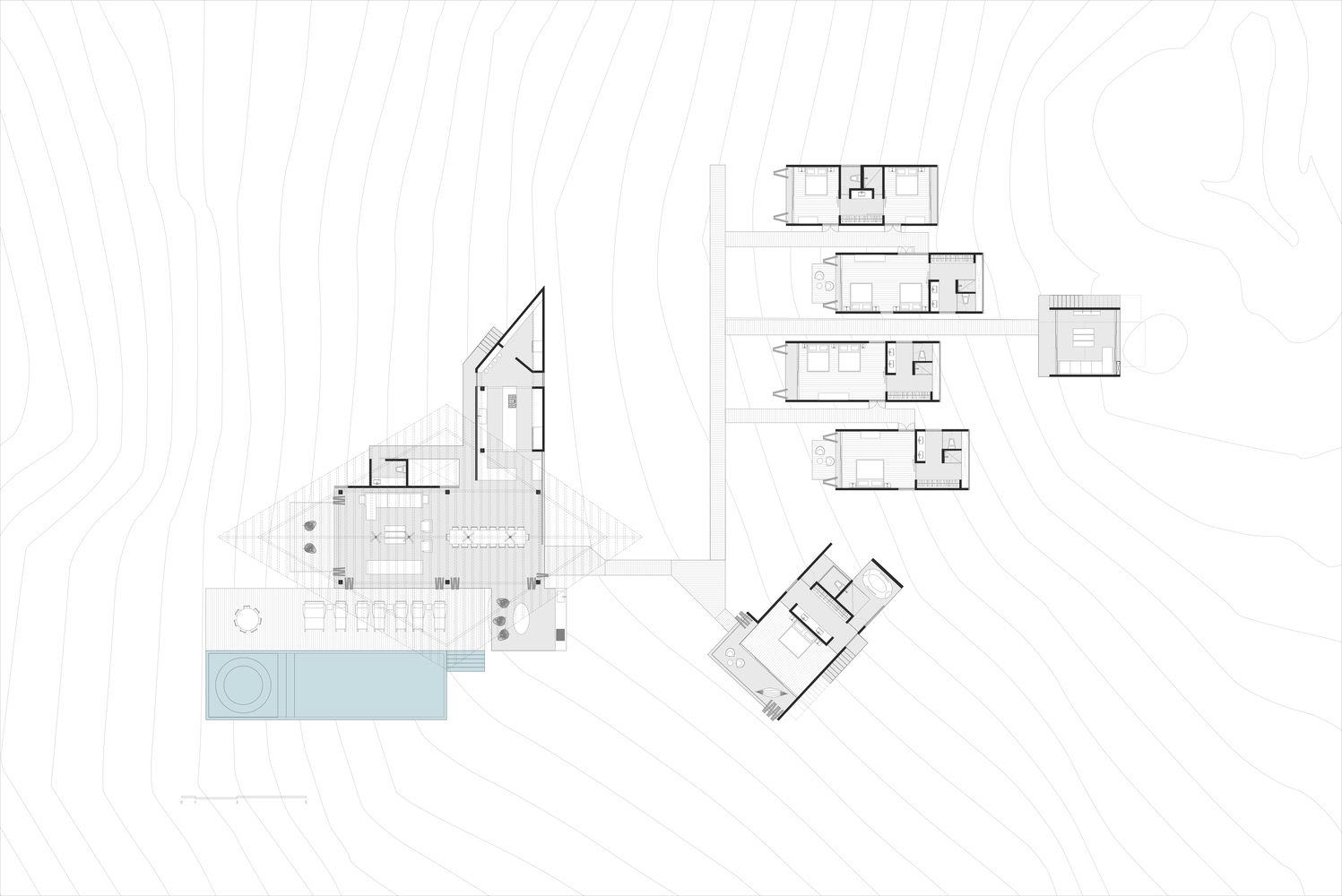 The primary challenge for the design team was to create a harmonious design that blended seamlessly with the existing vegetation while providing all the necessary facilities without imposing on the natural surroundings. To achieve this, the design team embarked on a journey to deconstruct the living spaces into eight distinct modules, each serving a specific purpose – from housing the palapa-pool-kitchen to the social tower, workers’ area, and parking lot.