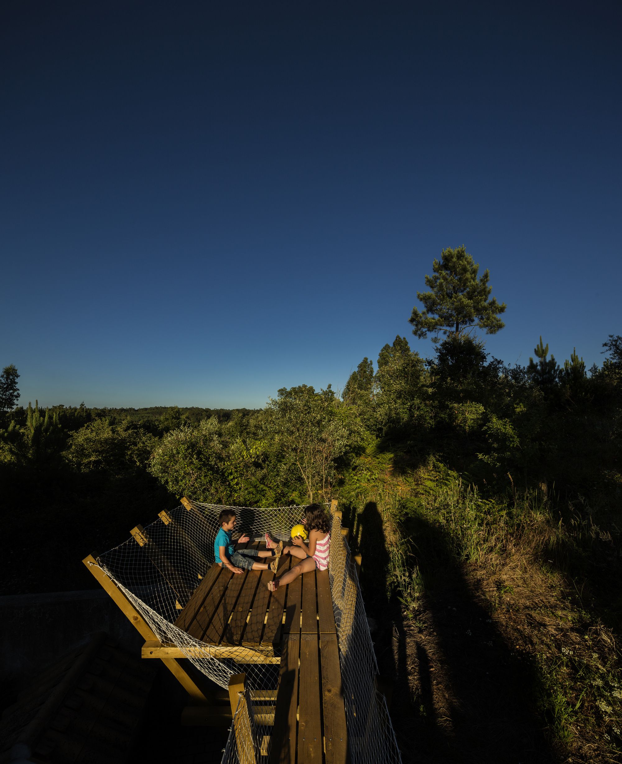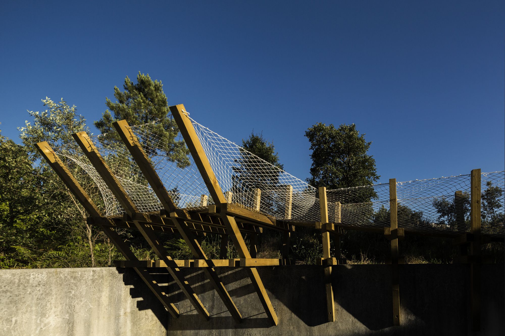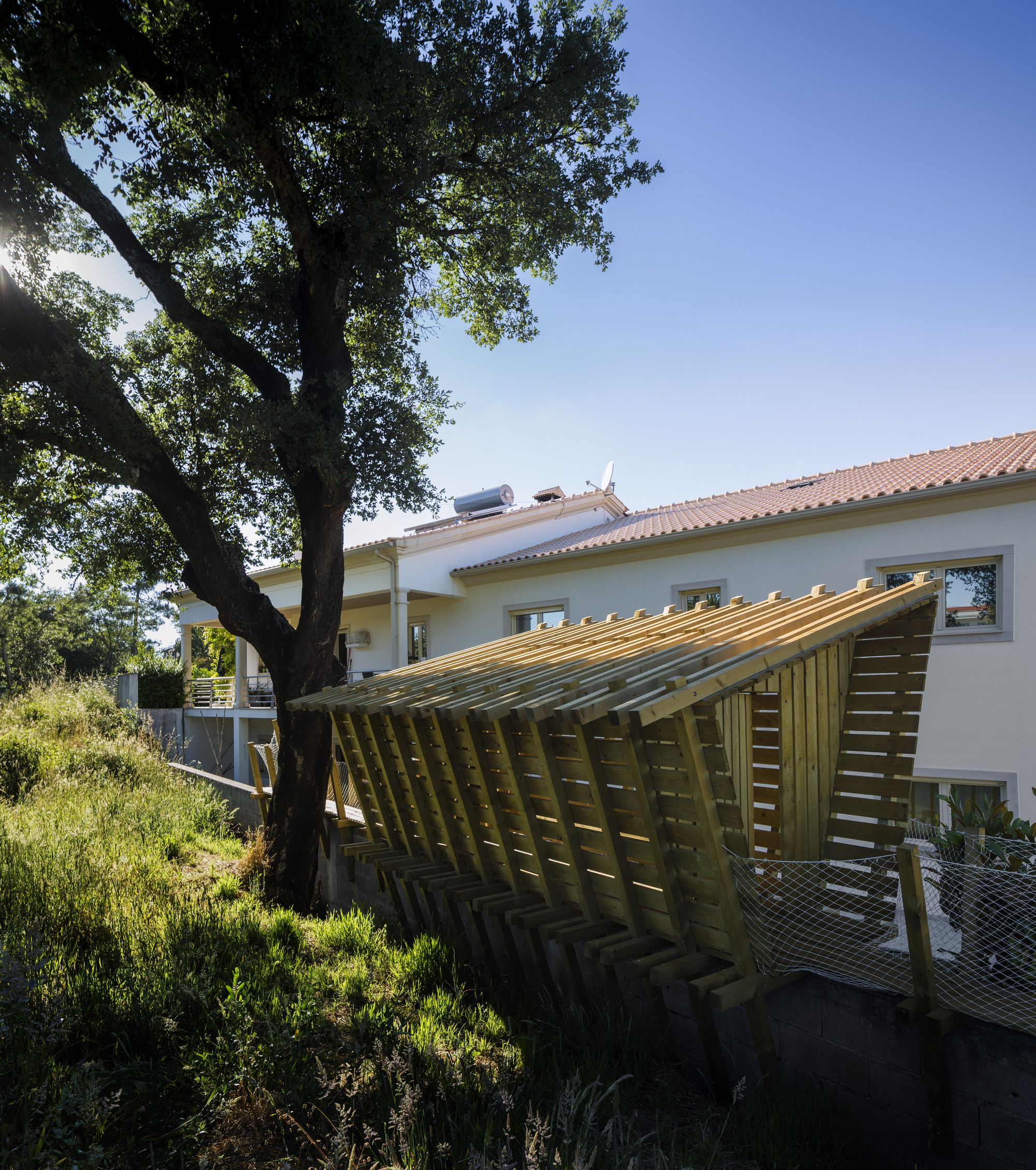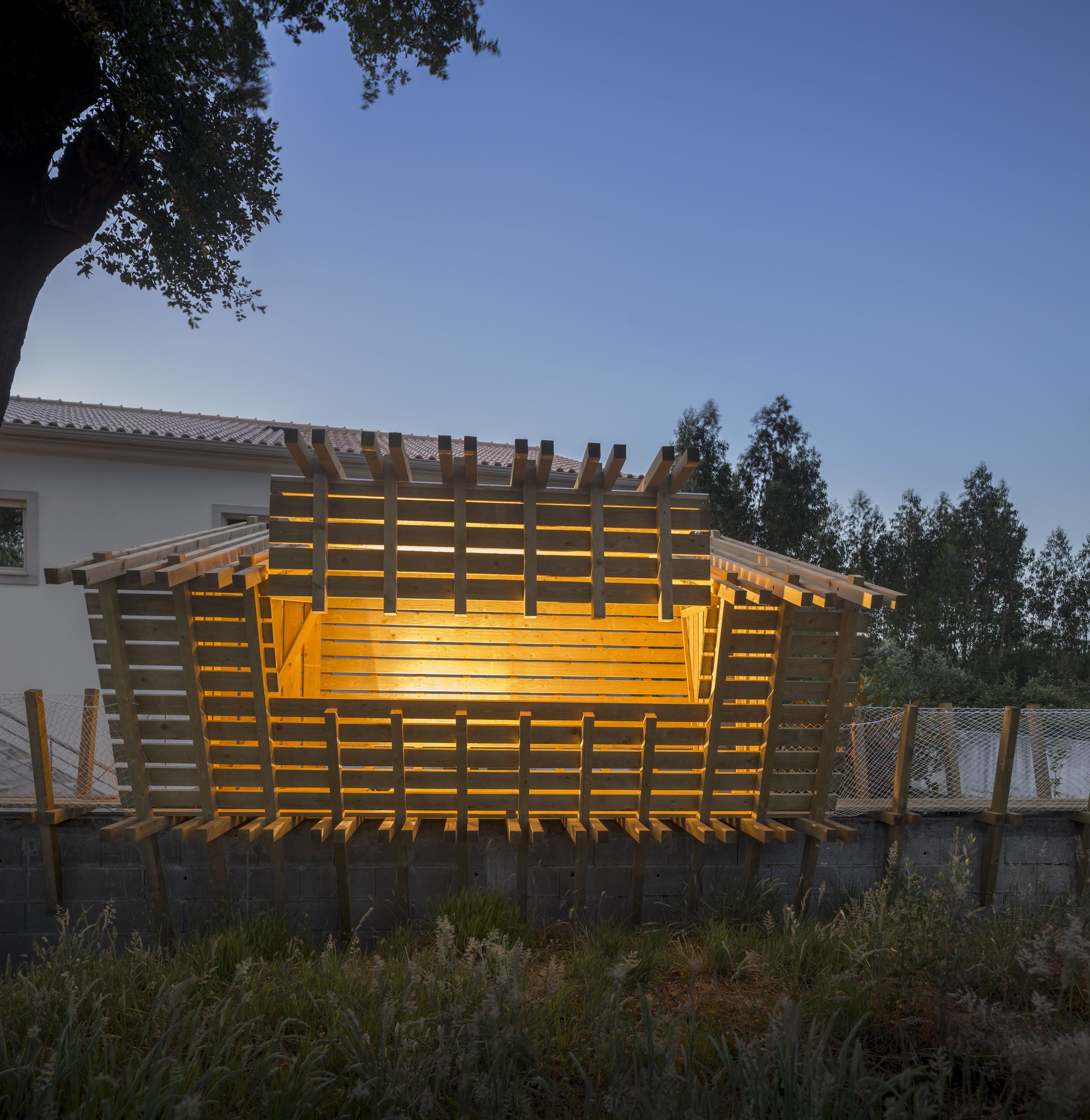 Behind the project «casa no muro» there is the promise of a father to his children, to build them a treehouse. But the tree overhanging the enclosure wall was on the neighbors land: So how could we answer to the children’s request to build this dreamed cabin? To rising off the cabin from the ground, we install it on the wall to keep the idea of floating space. Constructed in wood, the cabin can open on nature by a big wood shutter, invisible when it is closed. The project is accessible using a ladder integrated on a footpath: a large platform ends the boardwalk offering a view of the pinewood landscape. Fishing nets are fixed all along with the constructive system in «v» shape, for the children’s safety. The concept of laminated facades is thinking with tightened boards, on the lower part of the cabin, and increasingly spaced boards in the higher part. It creates outside views, filtering light, and keeping the child- ren privacy at their level small size. Because of a low budget, this cabin is a project made with the participation of the village carpenter, customers, neighbors, and architects. This is a local pine wood: an autoclave treatment has been applied to make resistant this outdoor construction.