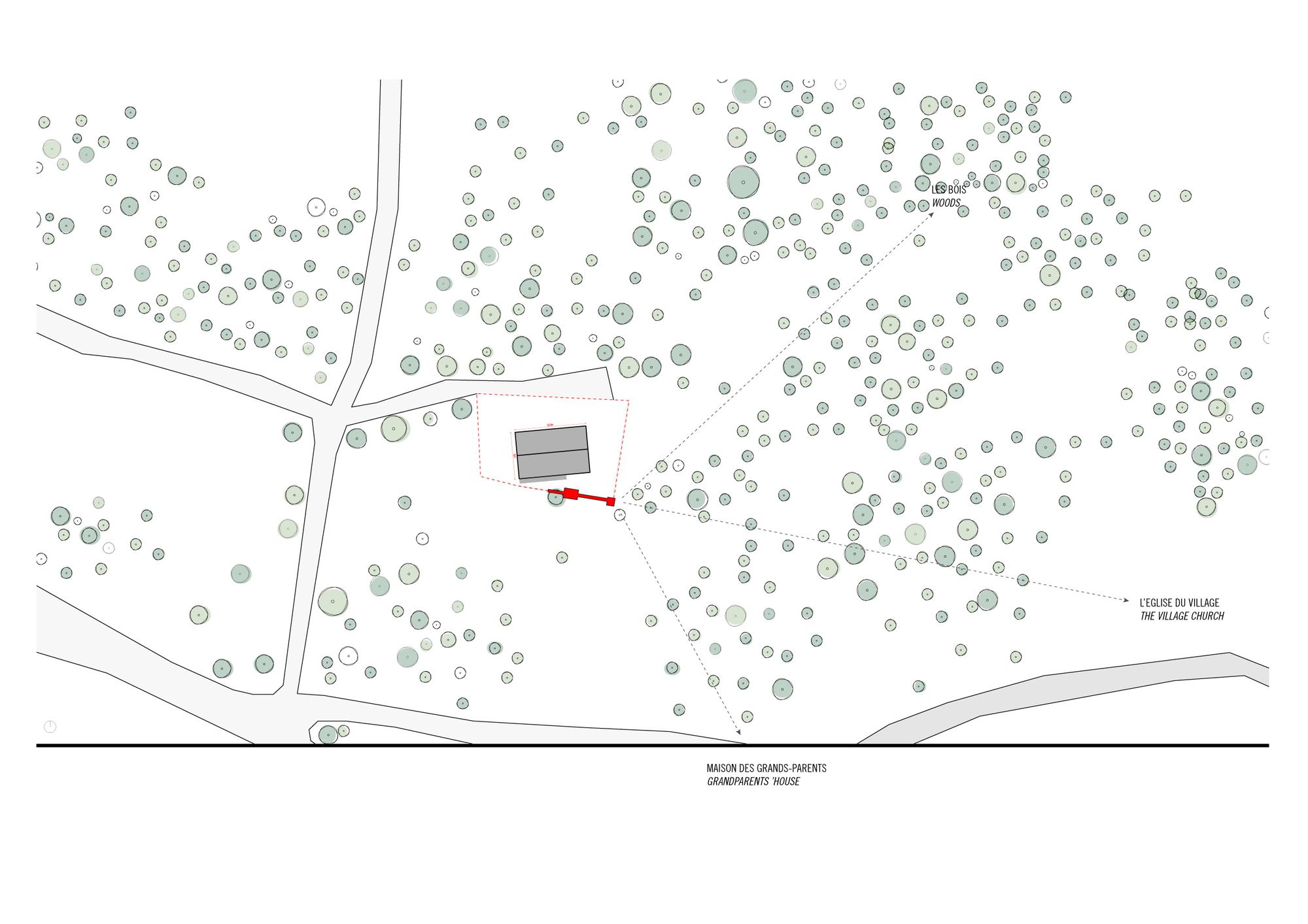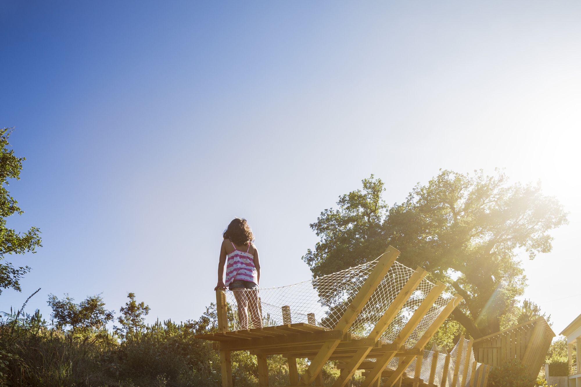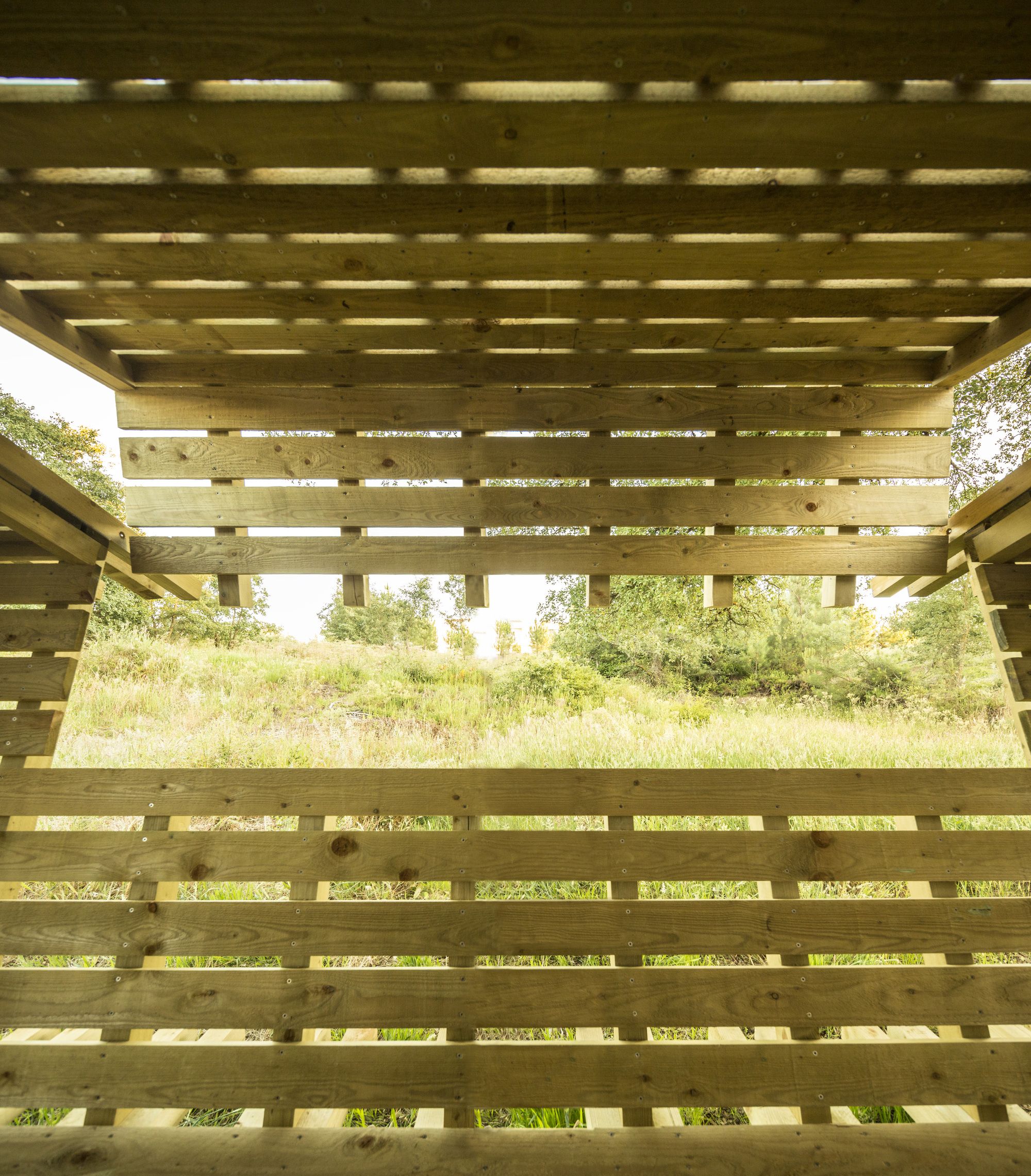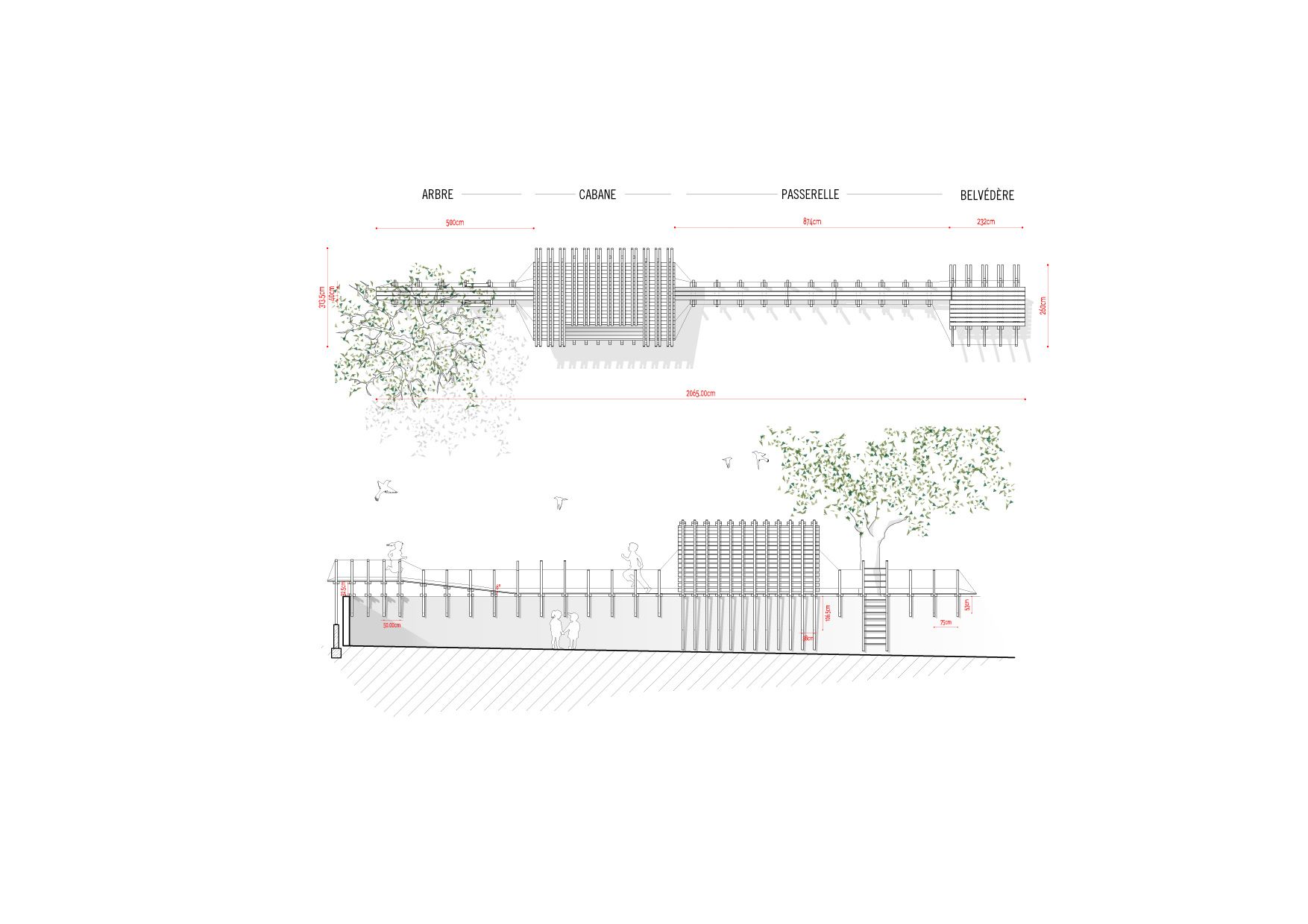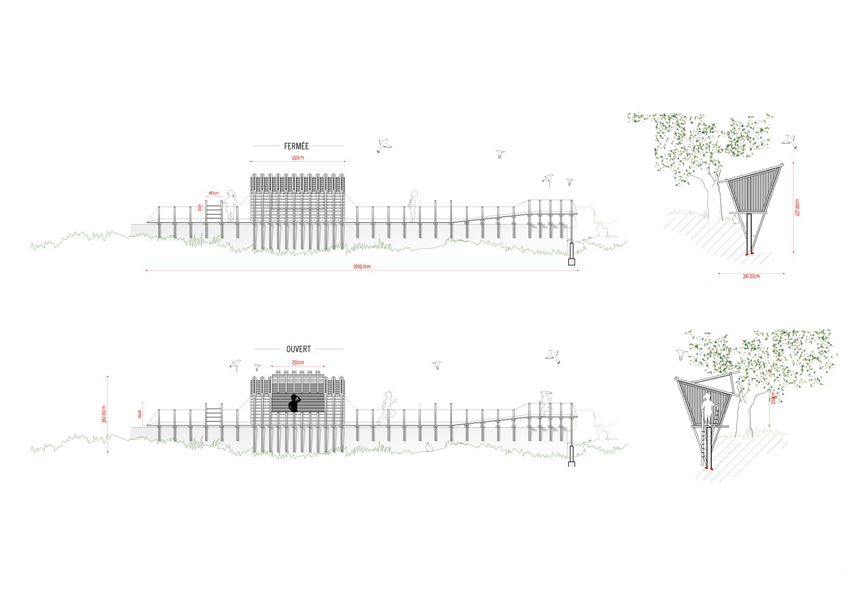 Behind the project «casa no muro» there is the promise of a father to his children, to build them a treehouse. But the tree overhanging the enclosure wall was on the neighbors land: So how could we answer to the children’s request to build this dreamed cabin? To rising off the cabin from the ground, we install it on the wall to keep the idea of floating space. Constructed in wood, the cabin can open on nature by a big wood shutter, invisible when it is closed. The project is accessible using a ladder integrated on a footpath: a large platform ends the boardwalk offering a view of the pinewood landscape. Fishing nets are fixed all along with the constructive system in «v» shape, for the children’s safety. The concept of laminated facades is thinking with tightened boards, on the lower part of the cabin, and increasingly spaced boards in the higher part. It creates outside views, filtering light, and keeping the child- ren privacy at their level small size. Because of a low budget, this cabin is a project made with the participation of the village carpenter, customers, neighbors, and architects. This is a local pine wood: an autoclave treatment has been applied to make resistant this outdoor construction.