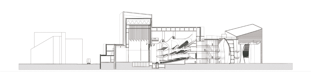 The 1,800-seat main hall is designed to host musical concerts, classical theater plays, and various other large-scale performances. It has the same curved piles as those bordering the grand entrance gallery, which here supports fan-shaped balconies. It reinterprets the horseshoe “opera” shape while respecting the qualities of frontal vision and seats a larger number of spectators.