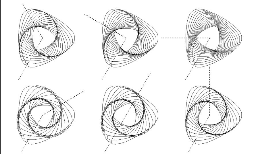 It is shaped like an equilateral triangle with smooth edges derived from two tangential curves. There are two variables that shaped the profile: The radius of the large circle and its location to the center of the equilateral triangle.