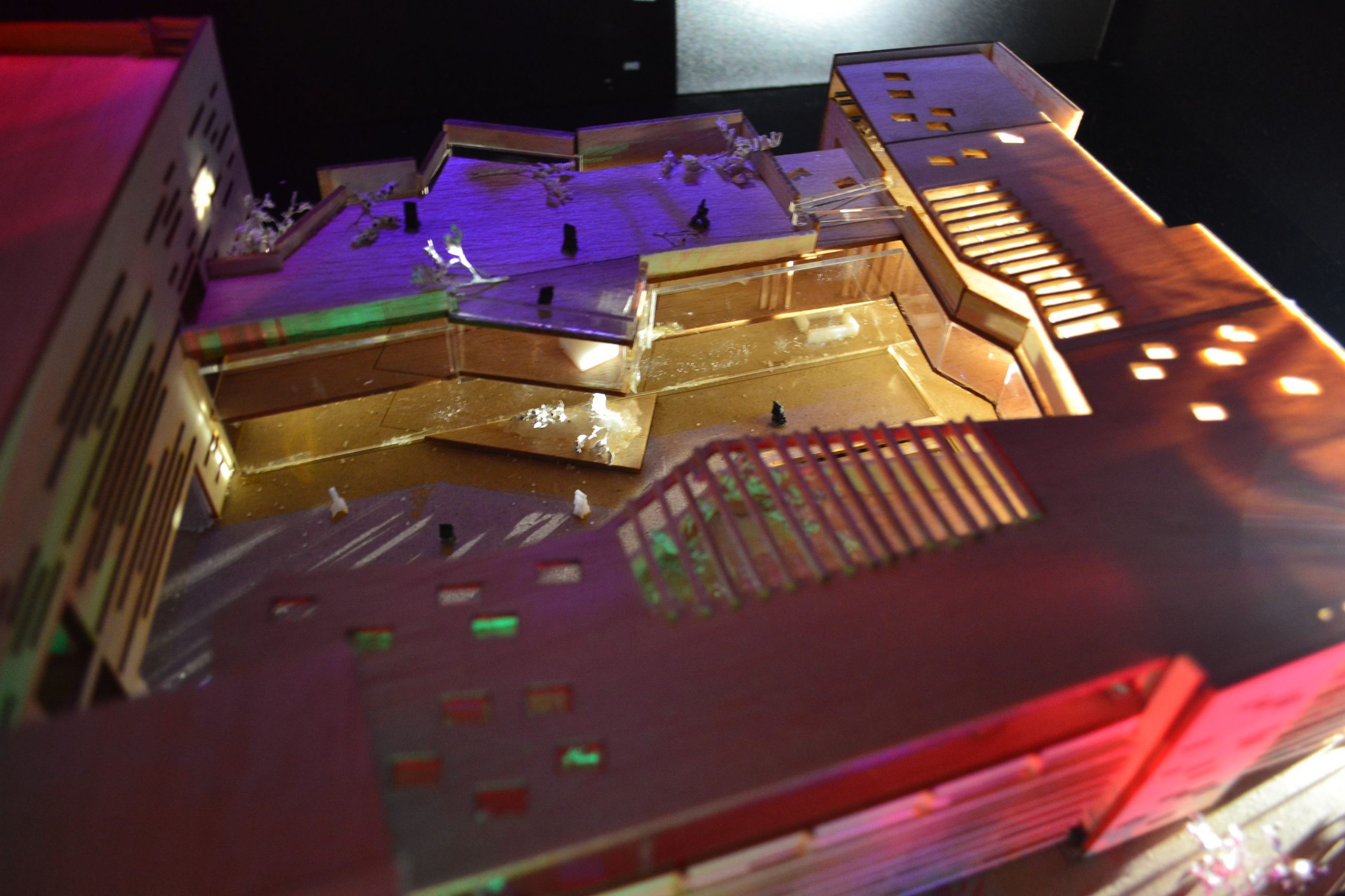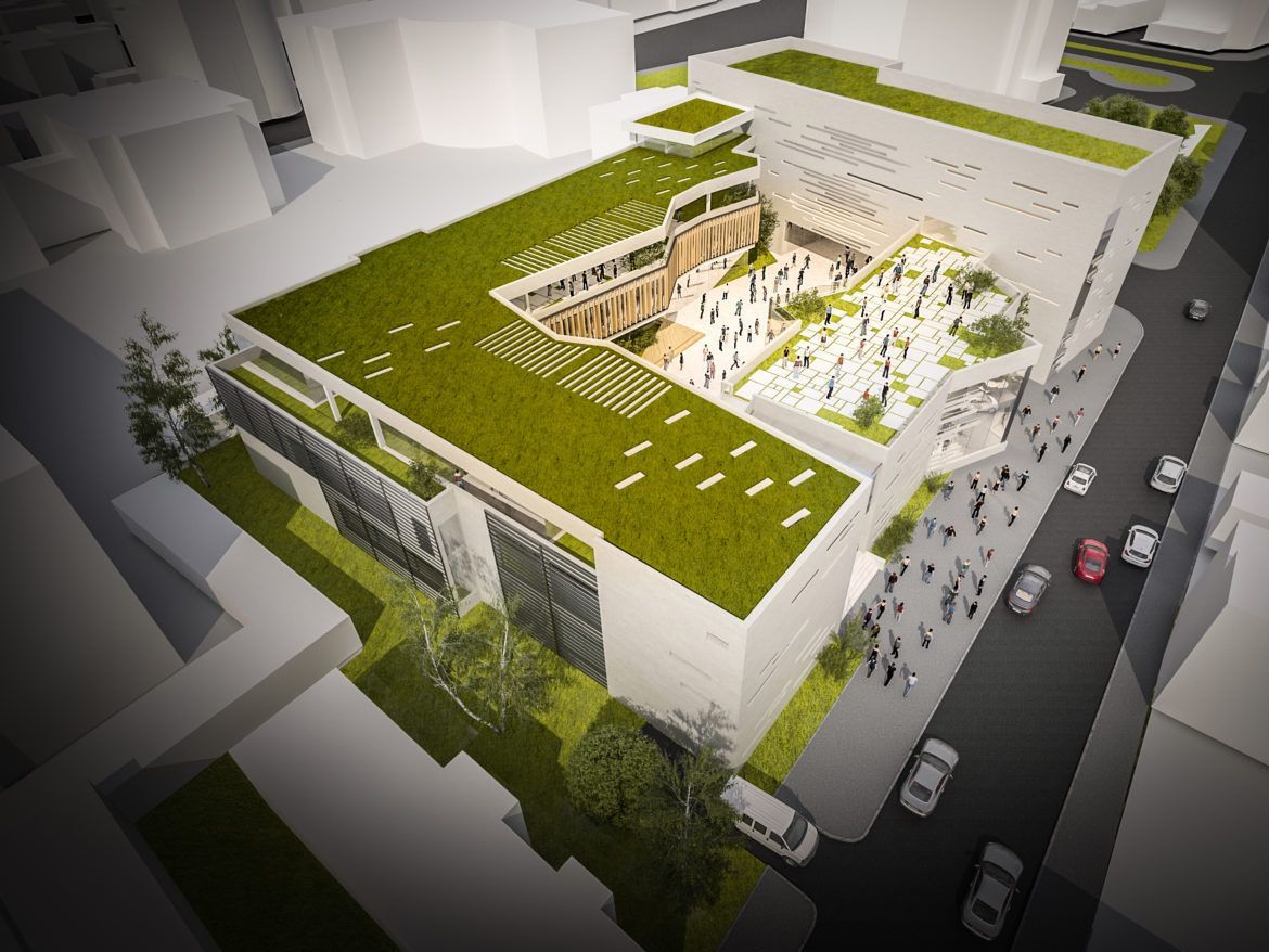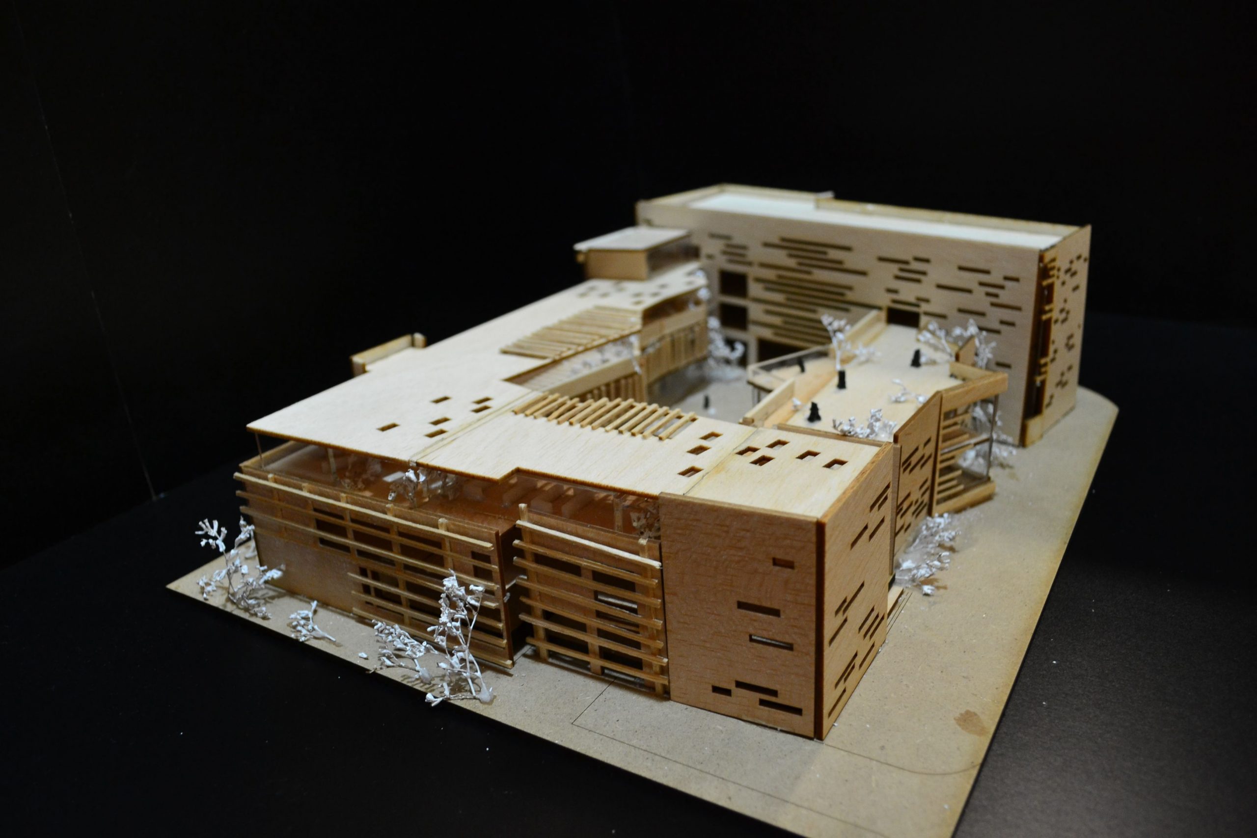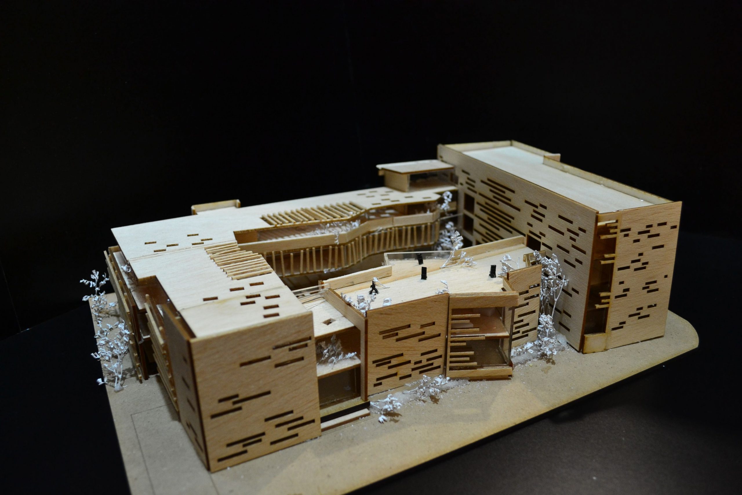 The building has an introverted character and decreases with height as it enters the island and fragmenting, relating to the surrounding tissue. The main facade is designed to screen the City Hall, and takes the idea of the passageway which is found on the site. Also, the greenery shapes my building, penetrating building in various forms.