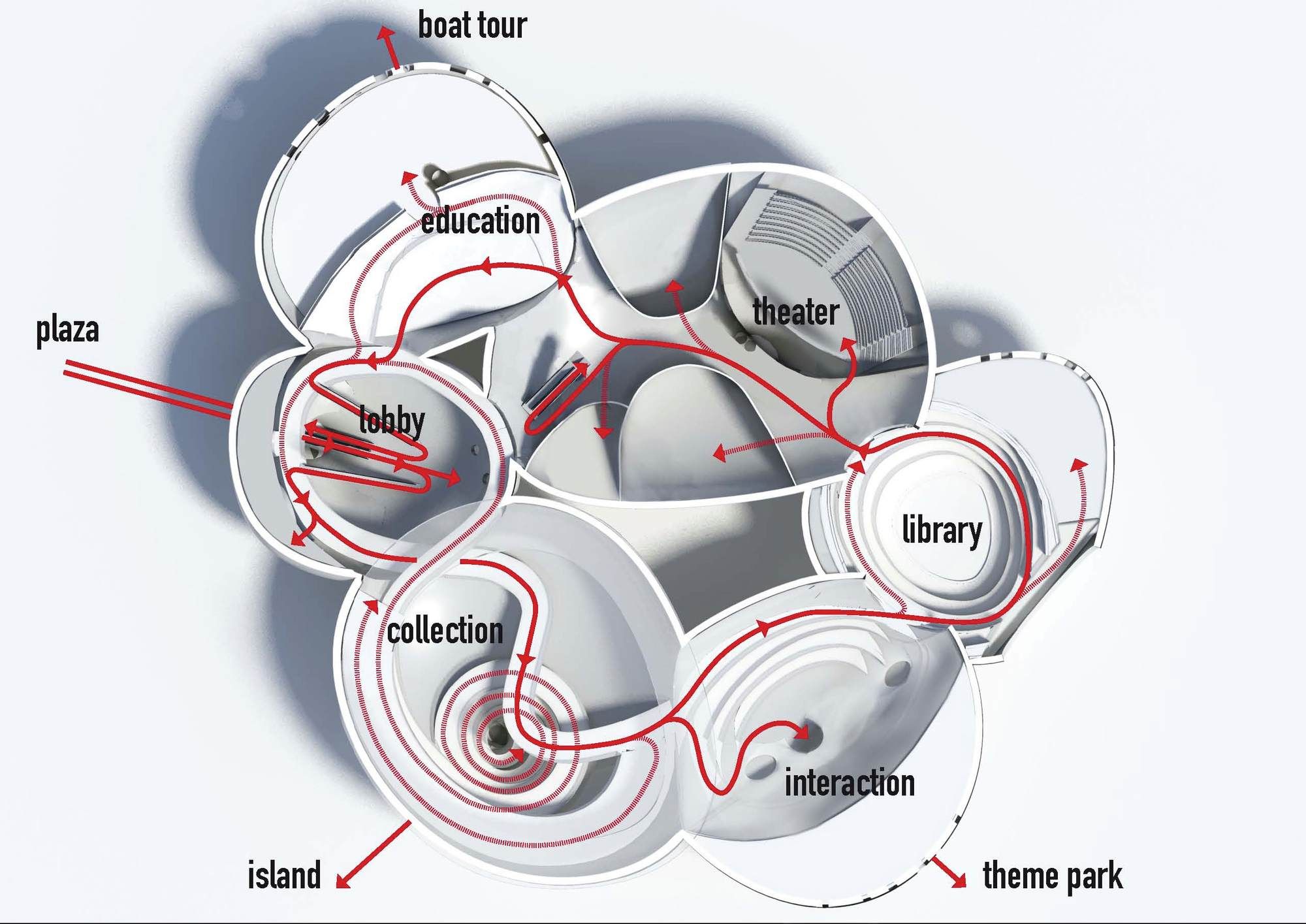 The 30.000m2 are distributed over eight volumes which are interconnected allowing for a circular tour of the entire program. Services such as the lobby, education, three theatres/cinemas with in total 1111 seats and a comic book library occupy each their own balloon. If two balloons touch in the interior a large opening allows access and views in-between the volumes. The balloon shape allows for versatile exhibitions, the permanent collection is presented in a chronological spiral whereas the temporary exhibition hall offers total flexibility. Amsterdam based exhibition architects Kossman.deJong tested the spaces and designed exhibition configurations which appeal to different age groups and allow large crowds to visit the exhibition. One of the balloons is devoted to interactive experience in which visitors can actively experiment with all sorts of animation techniques like blue screen, stop motion, drawing, creating emotions etc. The core attraction of this space is a gigantic 3D zoetrope. The routing of the museum permits short or long visits, visits to the cinema, the temporary exhibition or the roof terrace restaurant. The façade of the museum is covered in a cartoon relief referring to a Chinese vase. The monochrome white concrete façade allows the speech balloons to function: texts can be projected onto the façade. The relief was designed in collaboration with Amsterdam based graphic designers JongeMeesters…
