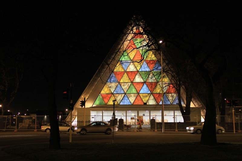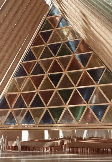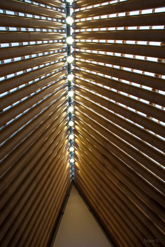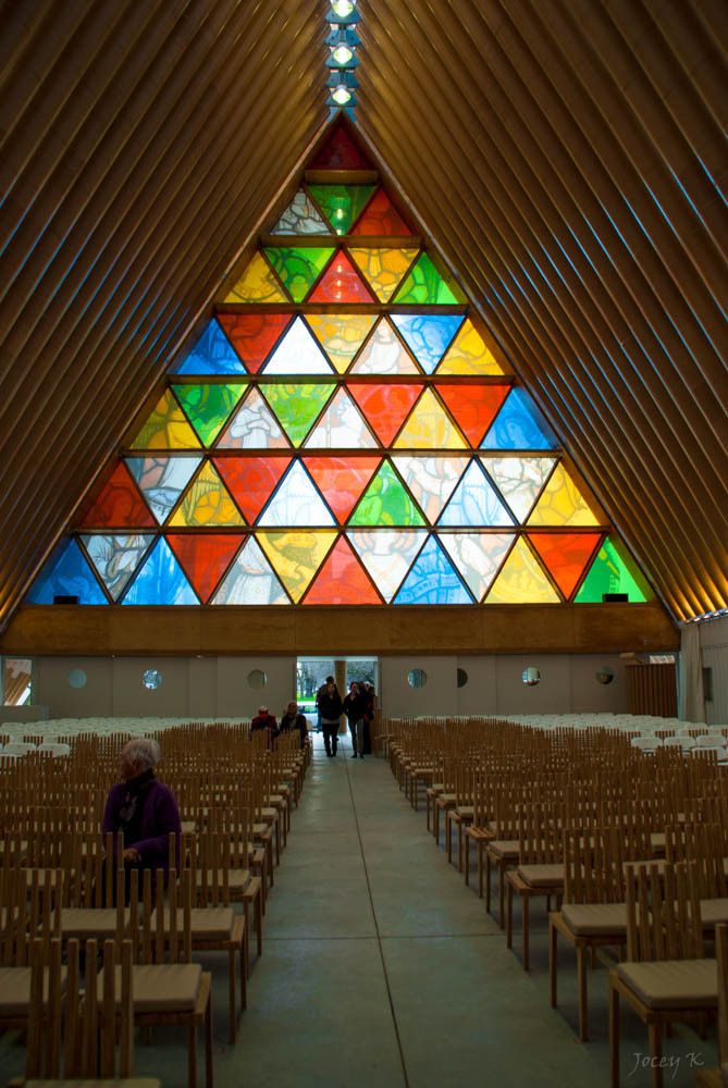The structure is made of 600mm (24inch) diameter cardboard tubes that are coated with waterproof polyurethane and flame retardants. The introduction of colored glass adds a beautiful, cheerful and almost mystical air to the building.