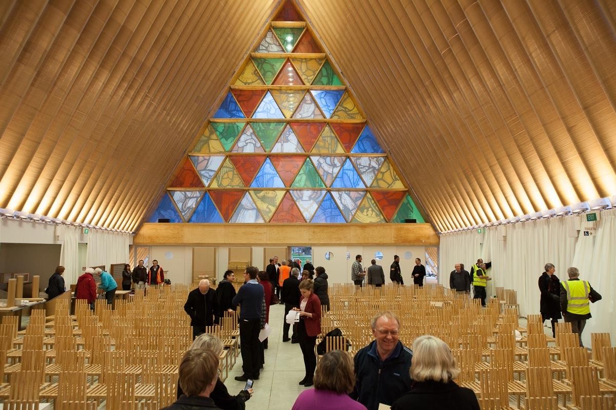 Shigeru Ban Architects has received public recognition due to his transitional cardboard cathedral in earthquake-devastated Christchurch. In the wake of a 6.3 earthquake the gothic revival church was destroyed beyond repair, needing urgent replacement, Ban was commissioned to create a temp construction; he proposed a simple A-frame construction that can hold up to 700 people.