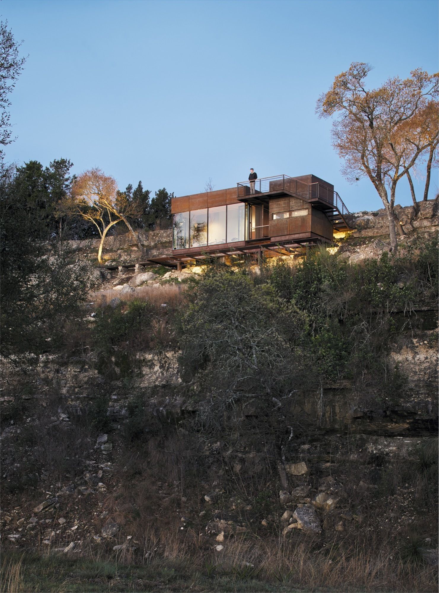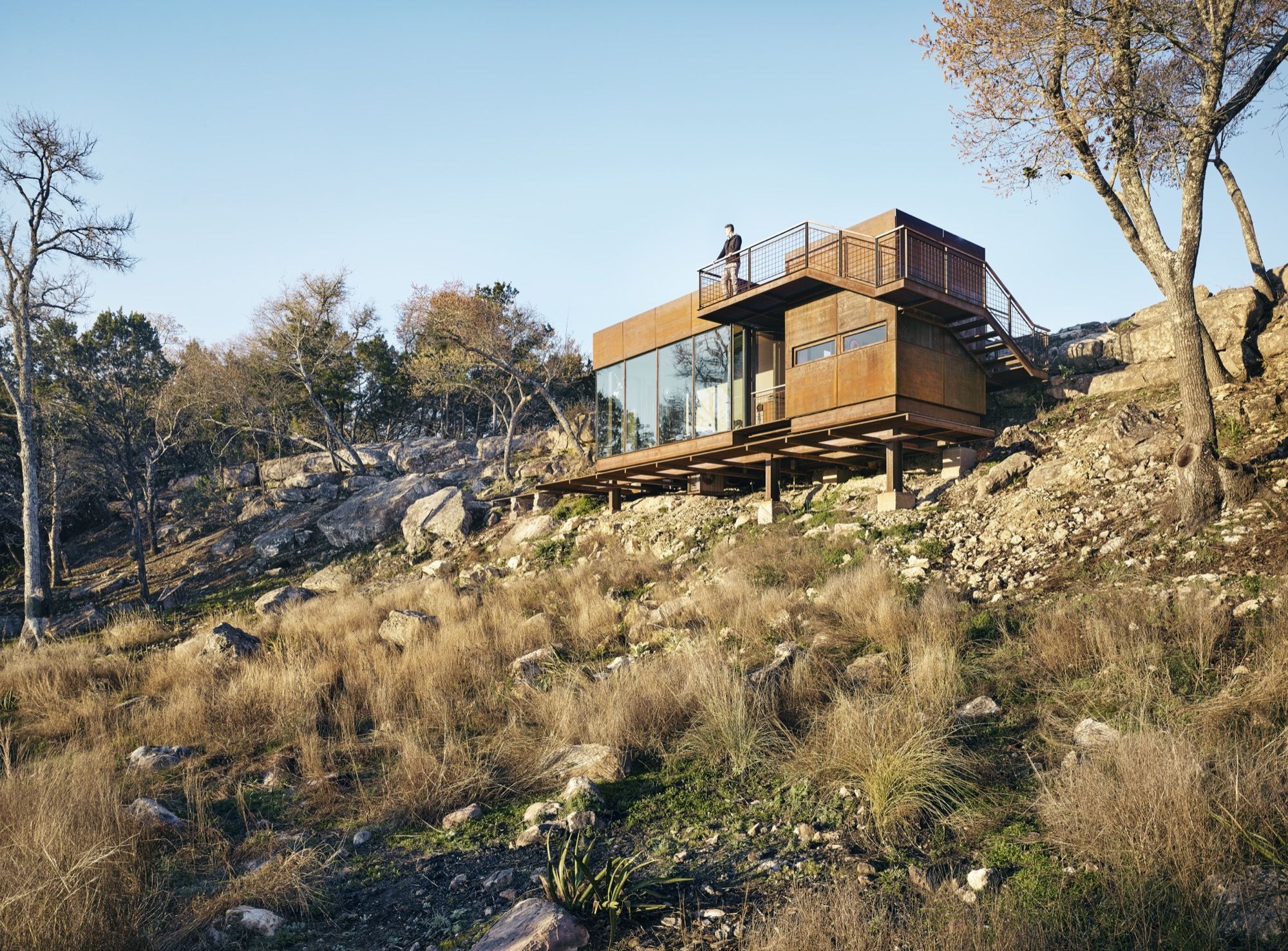 The site was specifically chosen for its views by the owner after years of slowly traversing and mapping the wooded cliff edge. The modern form contrasts with the Hill Country vernacular used on the rest of the 1,000 acre West Texas ranch. Naturally weathering steel was chosen to age with the surroundings and to pay homage to the owner’s youth spent welding oil tanks
