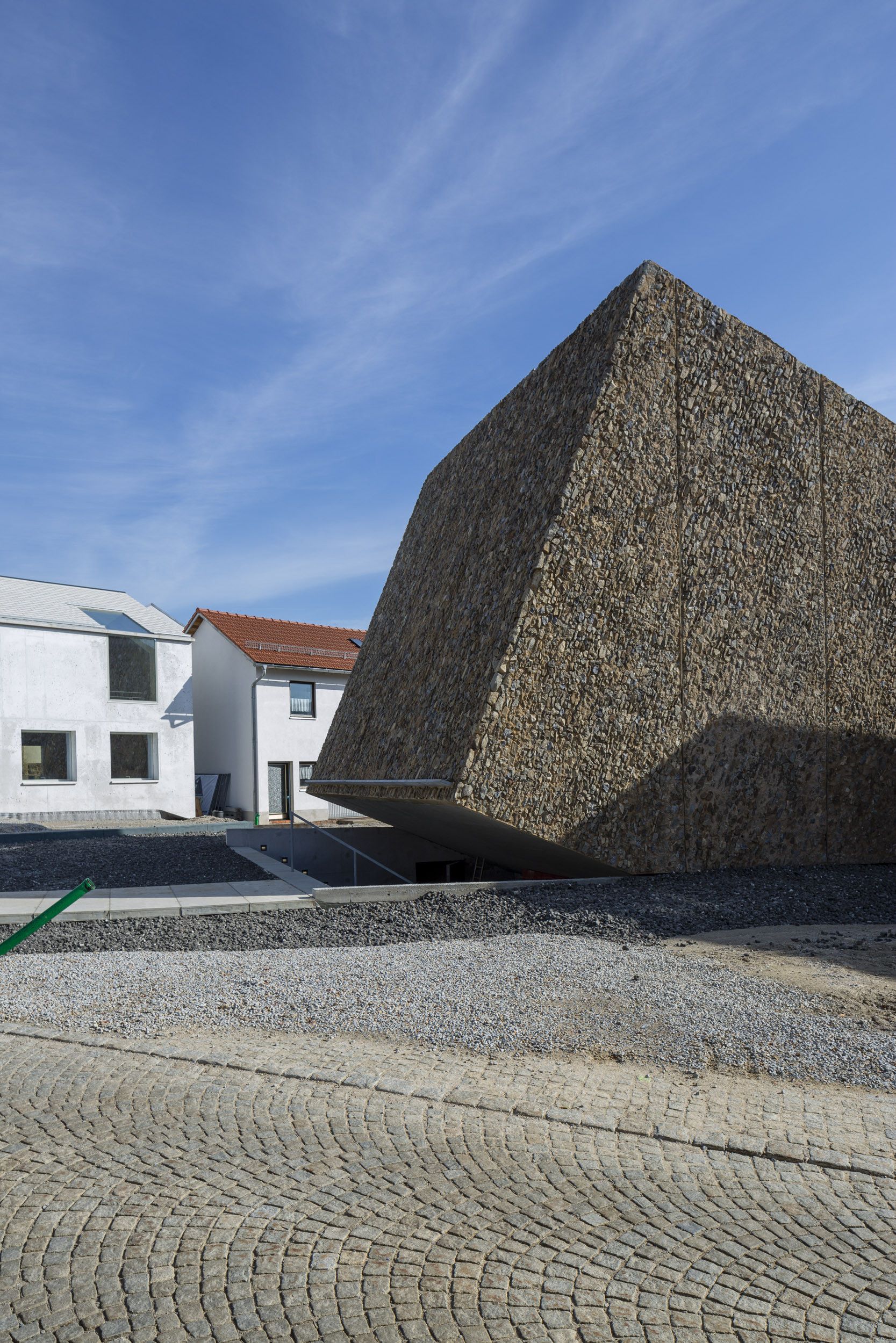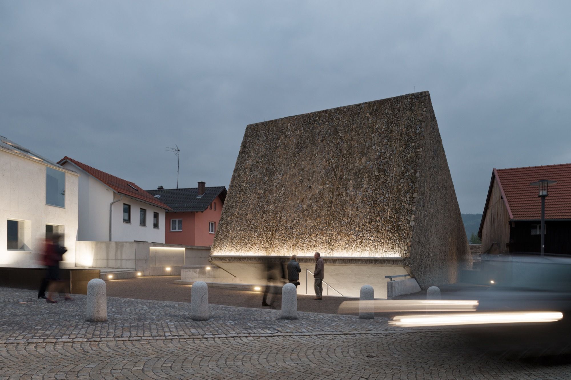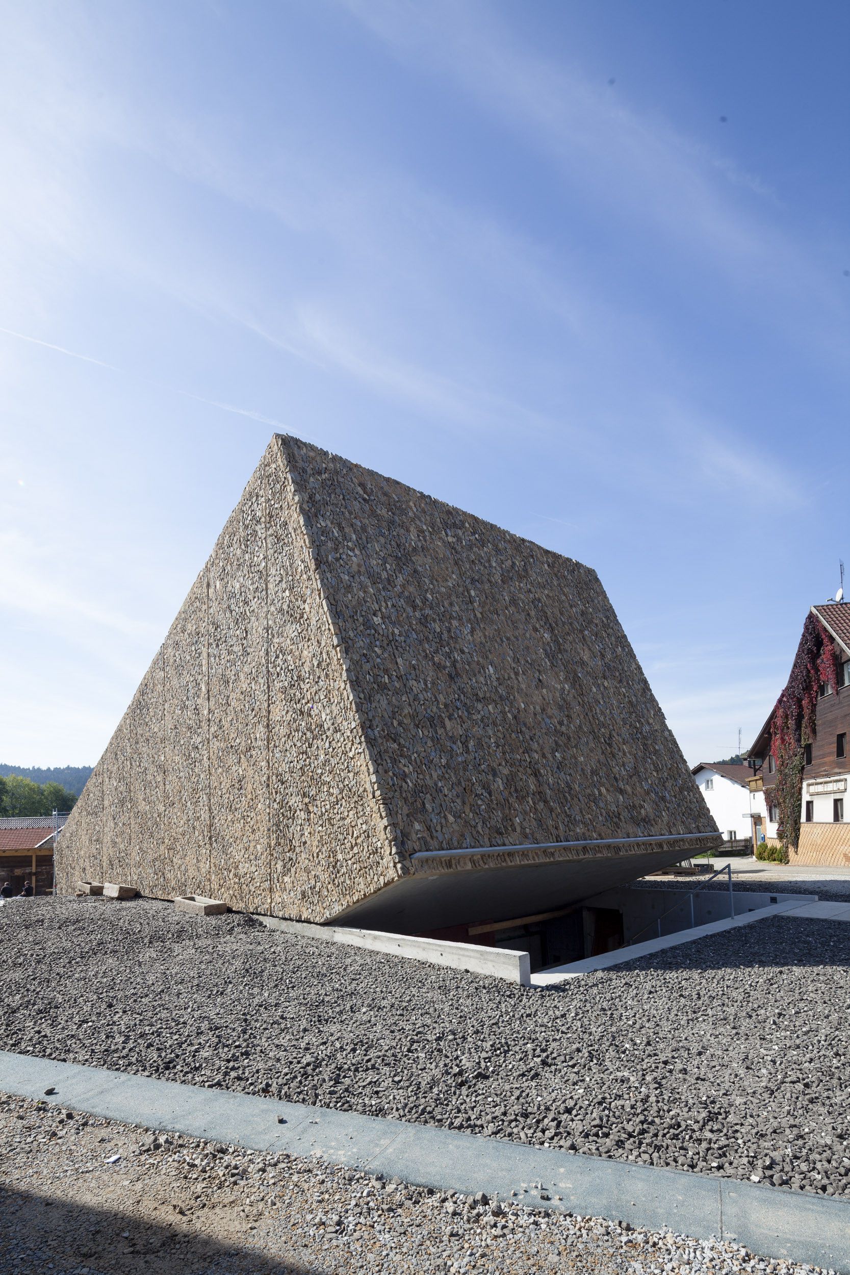 Designed by Peter haimerl.architektur, The concert hall represents the heart of the urban development to revitalize the new center of Blaibach. It is located next to the new community center and complements the space of a new village square that was realized with funds of the state urban development support. The concert hall is a solitaire of concrete with an inclination above the slope in the village center following the topography and linking with its granite facade to the stone carver tradition of Bailbach.