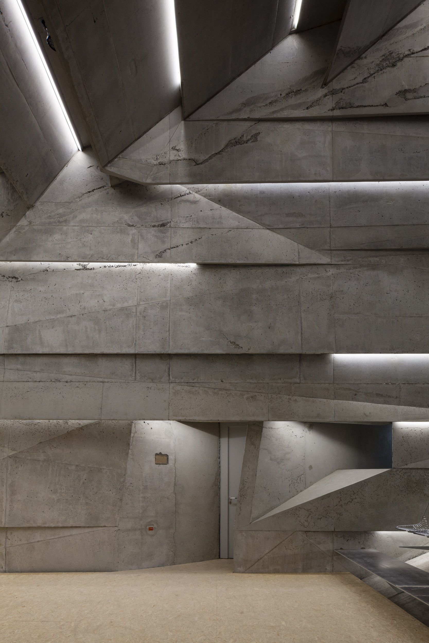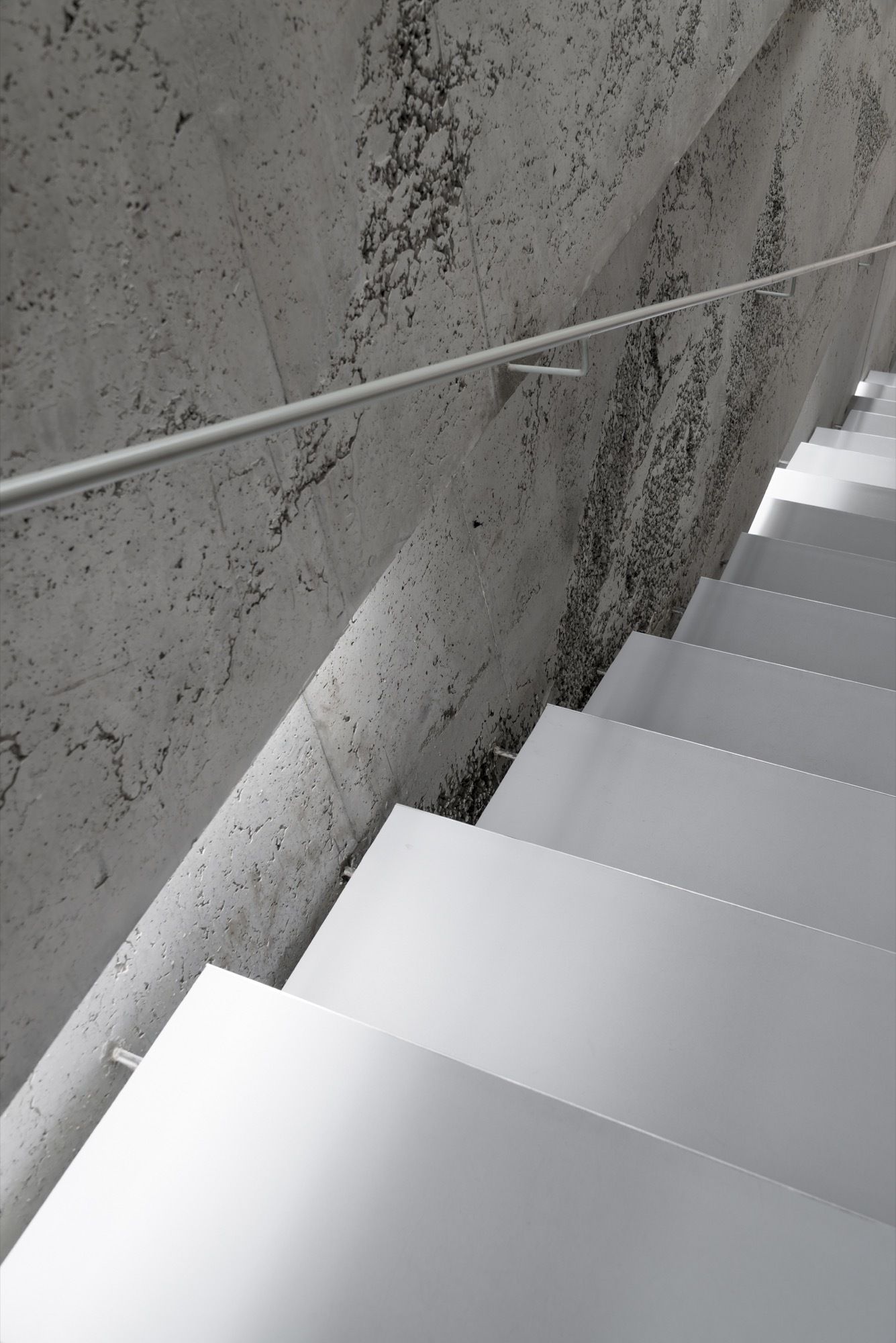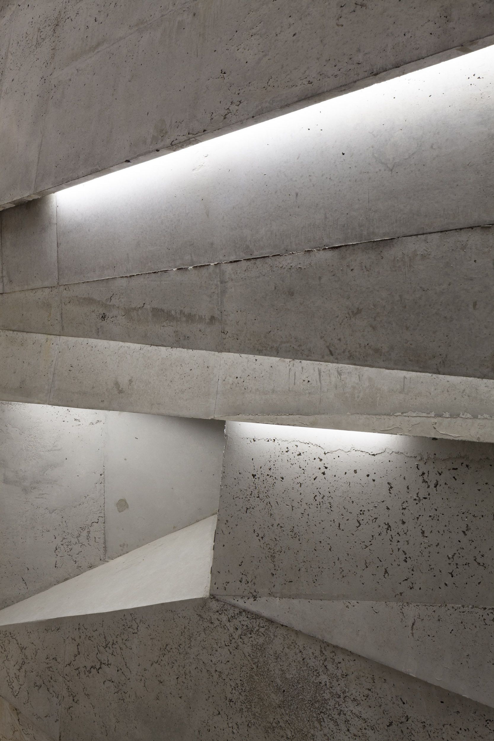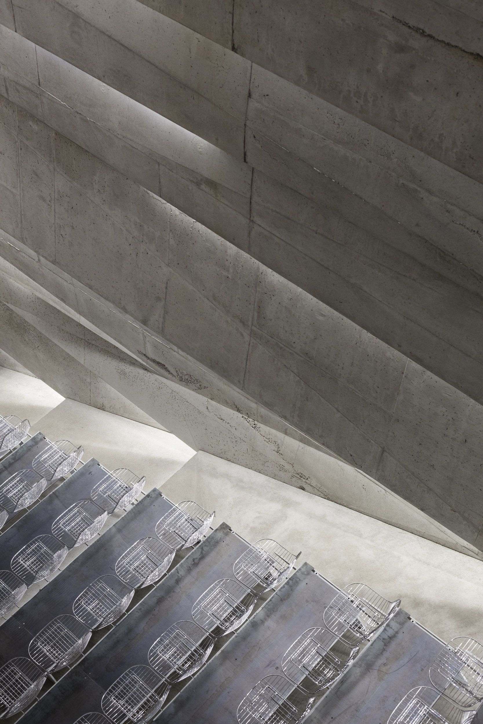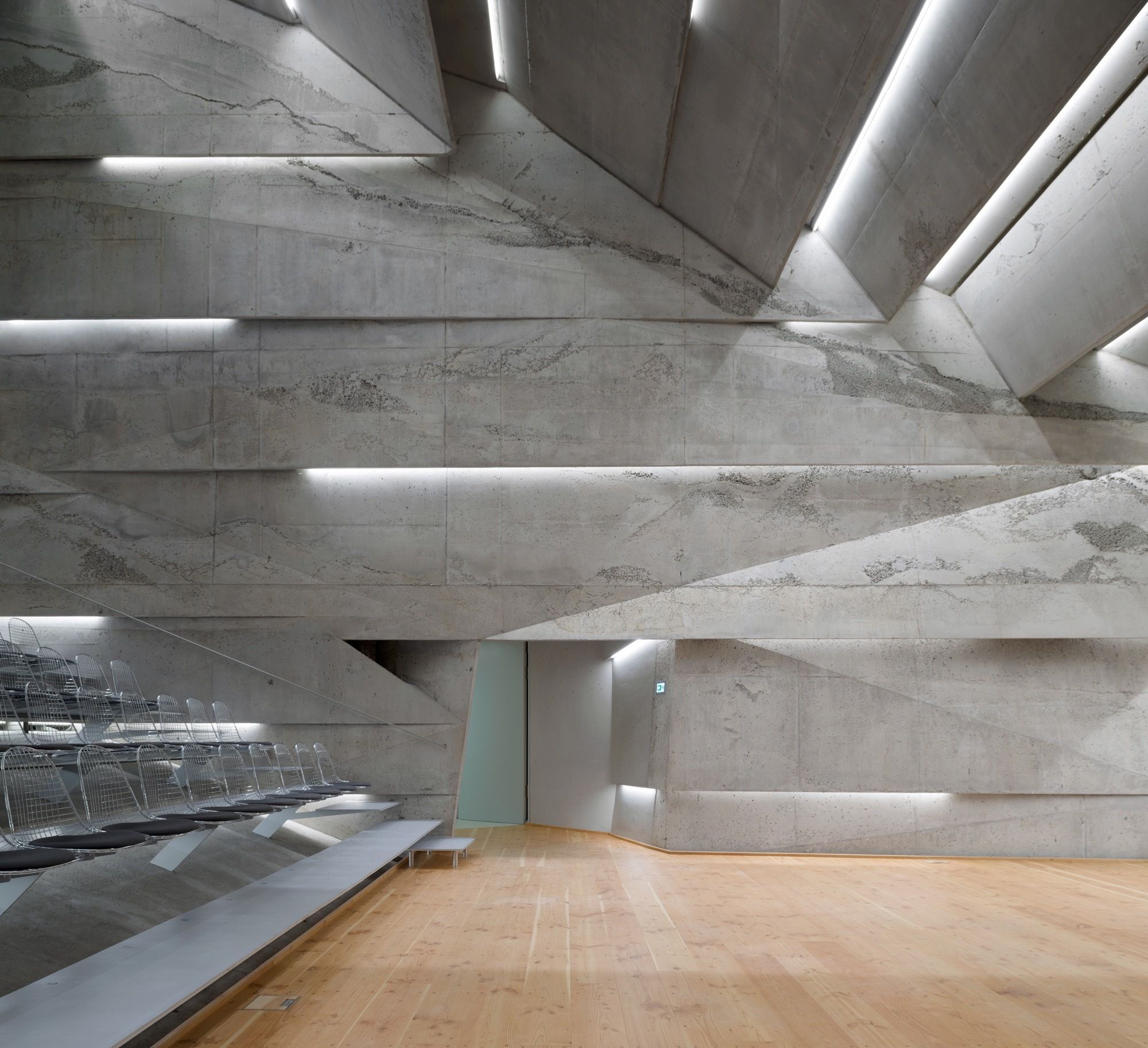 The hall unfolds its acoustics within the seemingly light building. While the precise light slits illuminate the space. The building body is made of pre-cast concrete and only a highly intricate constructed formwork made the realization of the difficult form possible. The dominant tilted surfaces of the concert hall are based on acoustic specifications and include besides LED-lights also bass absorber behind the light slits as well as underneath the steps for optimal acoustics. The concrete in the hall is untreated. Its lively surfaces help to absorb the medium-height tones.