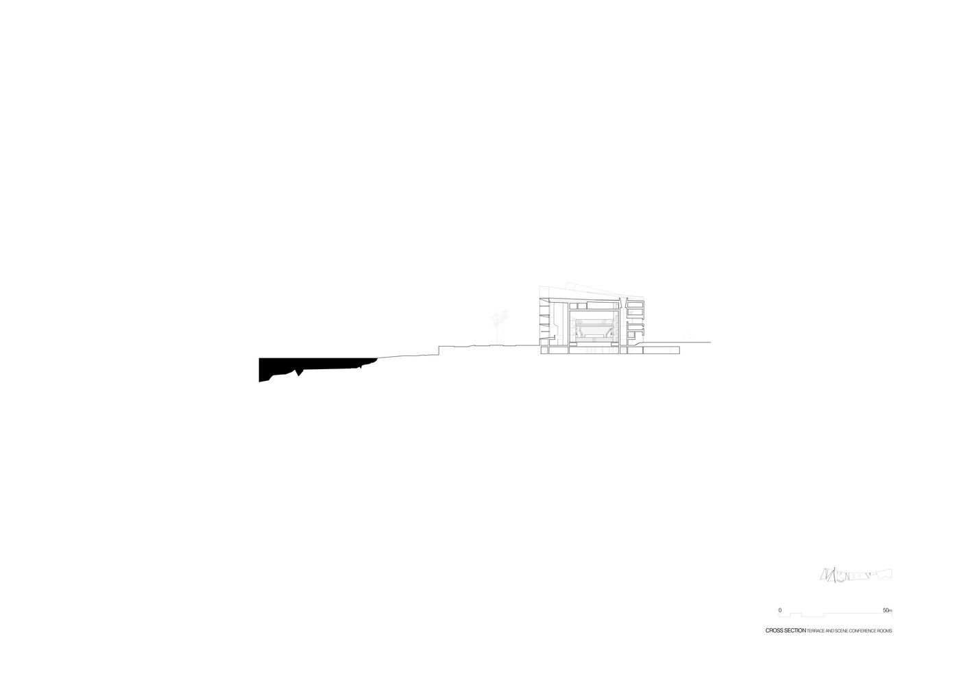 On the raised floor, connected to the hotel by a footbridge that serves to unify the complex, are the more everyday uses, the smaller convention rooms, and restaurants, along with a large terrace that, viewed in perspective, can be taken to be a prolongation of the sea.