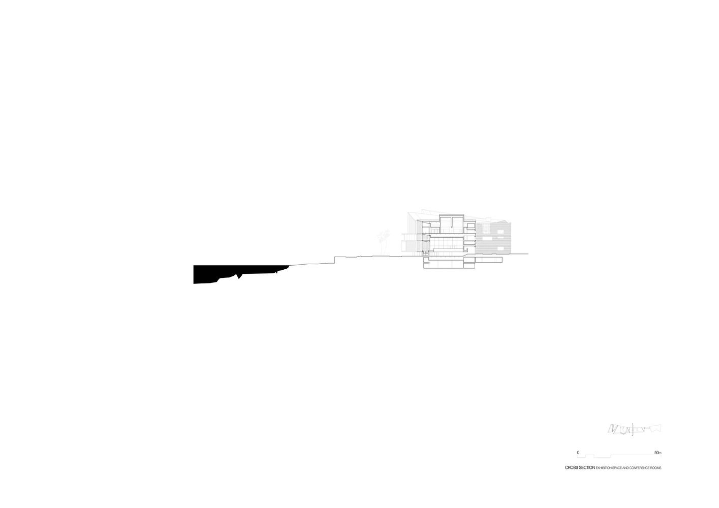 The building looks toward the sea, and this seaward looking is summed up in a thick facade—five meters wide and erected with techniques of naval engineering—that besides keeping out direct sunlight contains the stairs and other elements connecting the different spaces and programs. As you go up the stairs, you see the sea through huge glass panes.