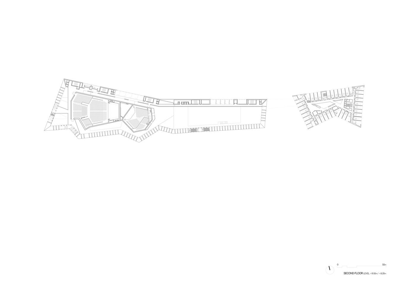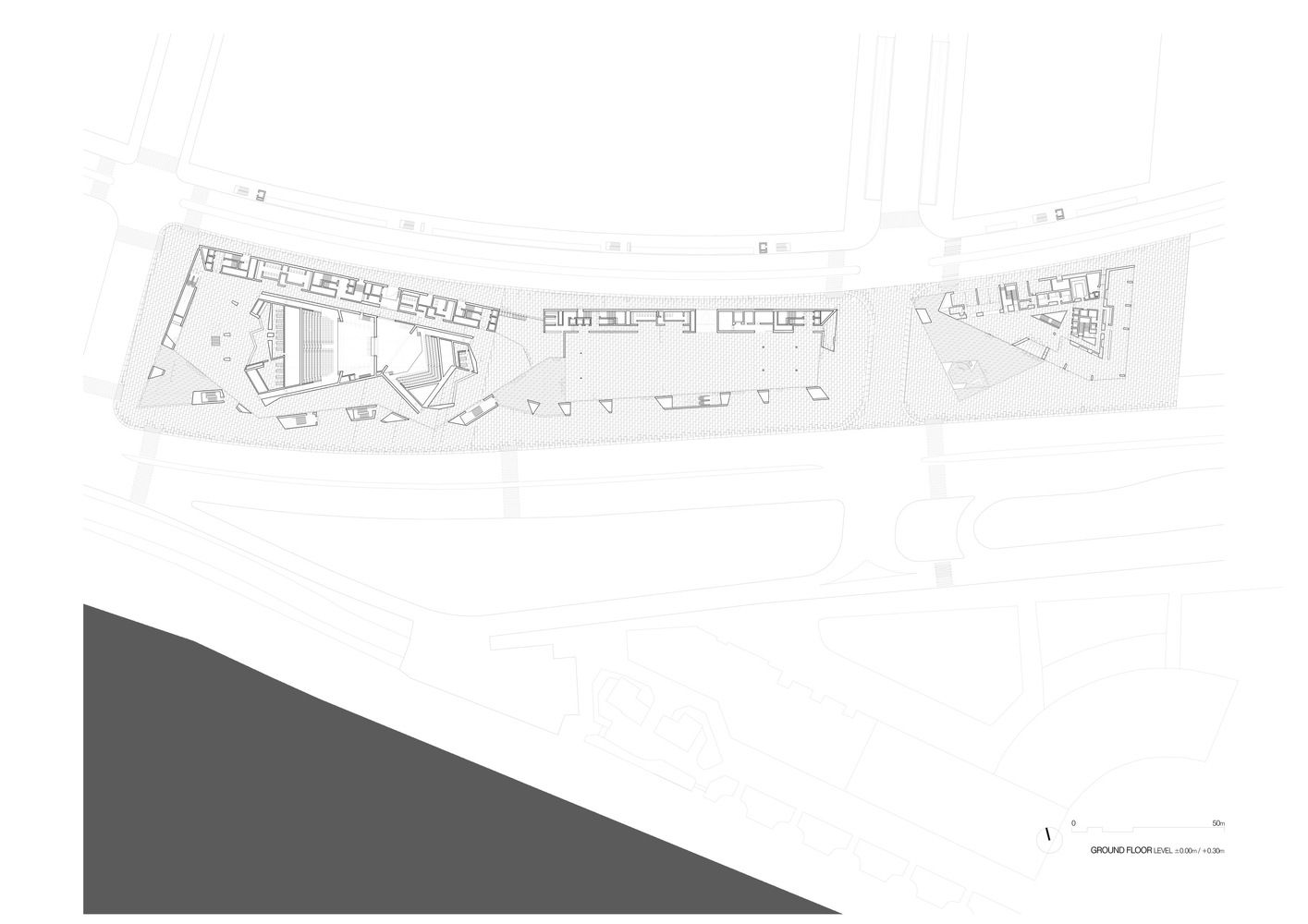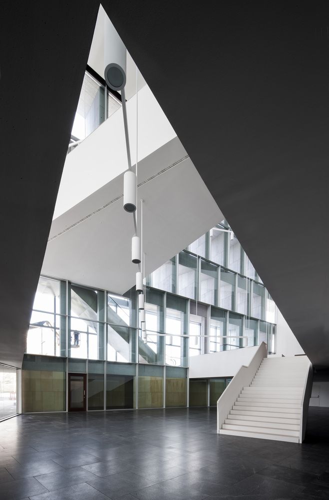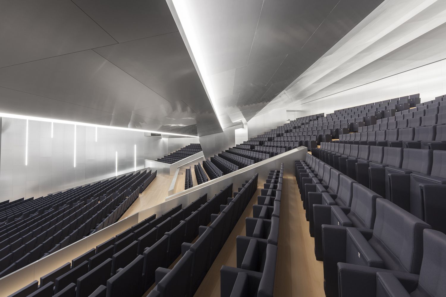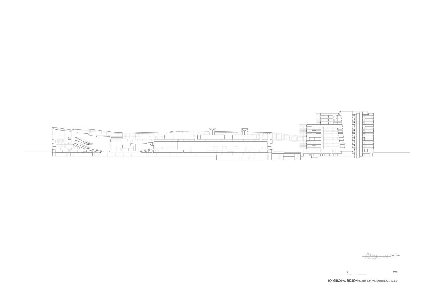 The ‘alter ego’ is the north facade, whose thickness is formed by the building’s more ‘server’ spaces. The result is a comb-shaped double scheme: in functional terms, public to the south and private to the north. Inside, different congress and exhibition halls follow one another. These are large but volumetrically expressive spaces, with voids around them that have hanging platforms and catwalks for looking out to the exterior.