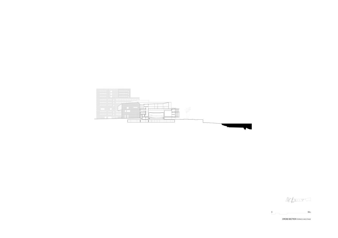 This facade is like a town wall with a path, dense but also open, and in its thickness, through ambiguous spaces that cannot definitively be considered interior or exterior, it is confused with the promenade itself.