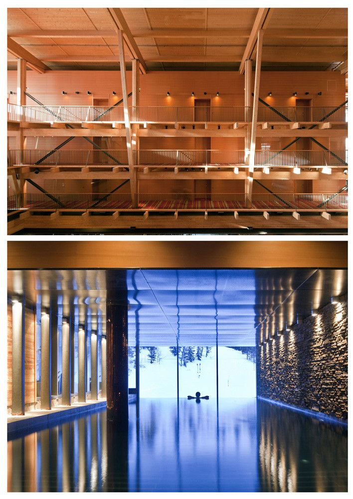 The hotel has 112 guest rooms and suites, conferencing facilities for groups up to 350 people, restaurants, a spa and health club, and related ski facilities. The atrium and roof are an articulated frame of pine that envelops two slim wings. These wings contain the suites, which were designed using a modular pattern that enabled offsite prefabrication and could be craned into place.