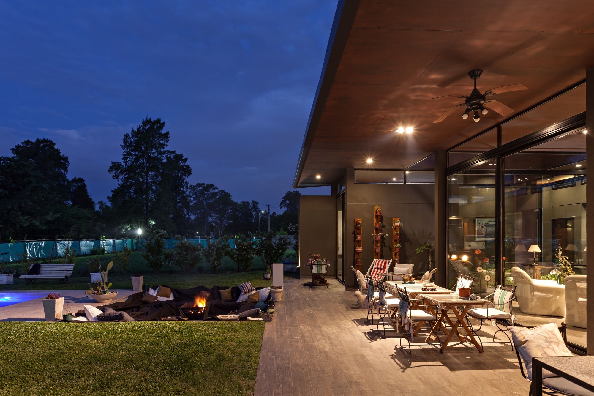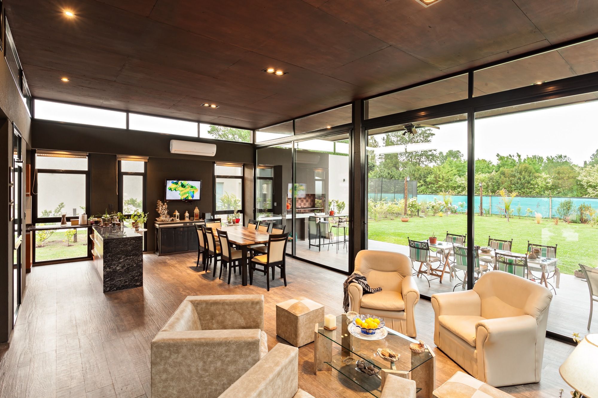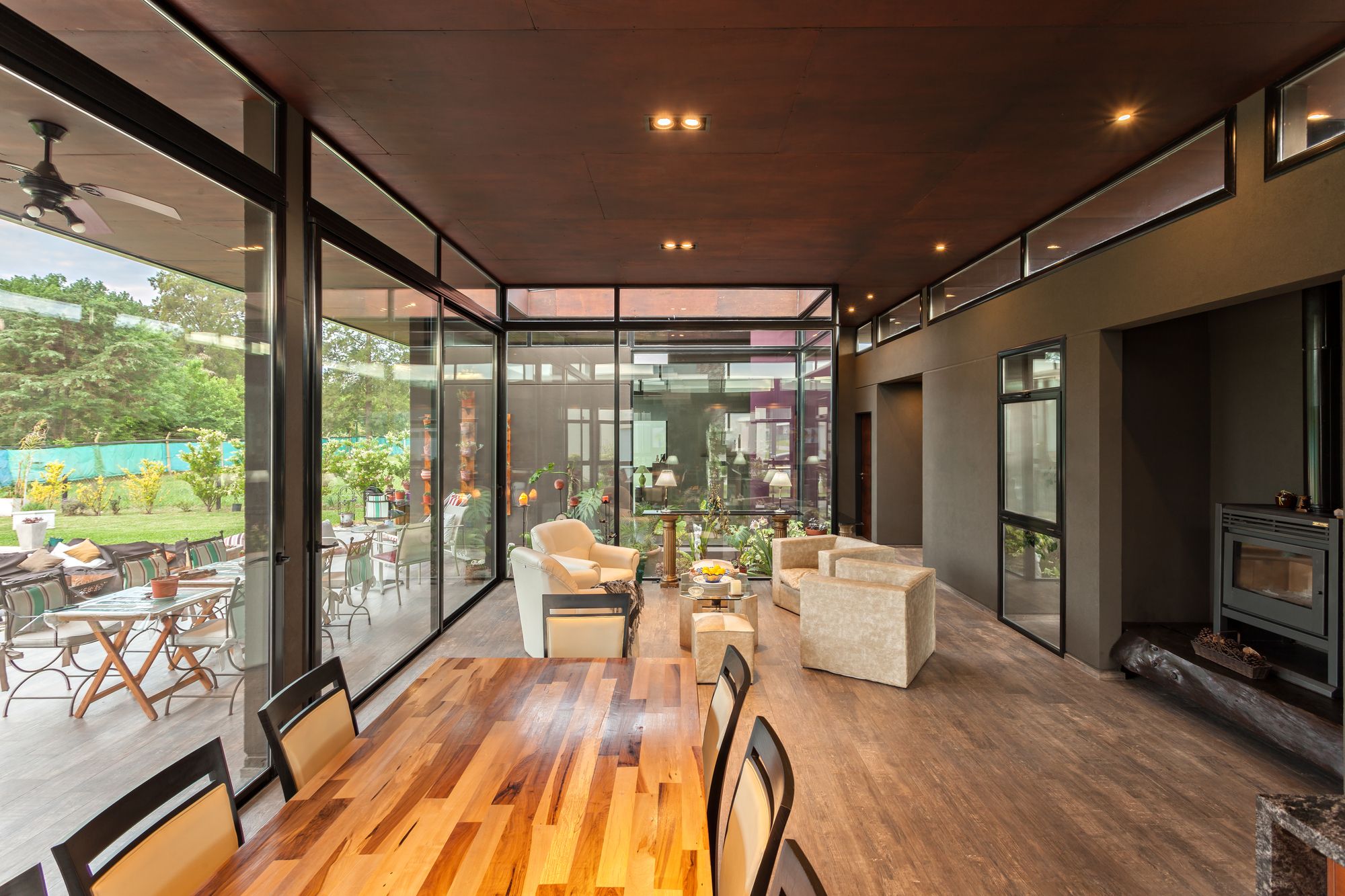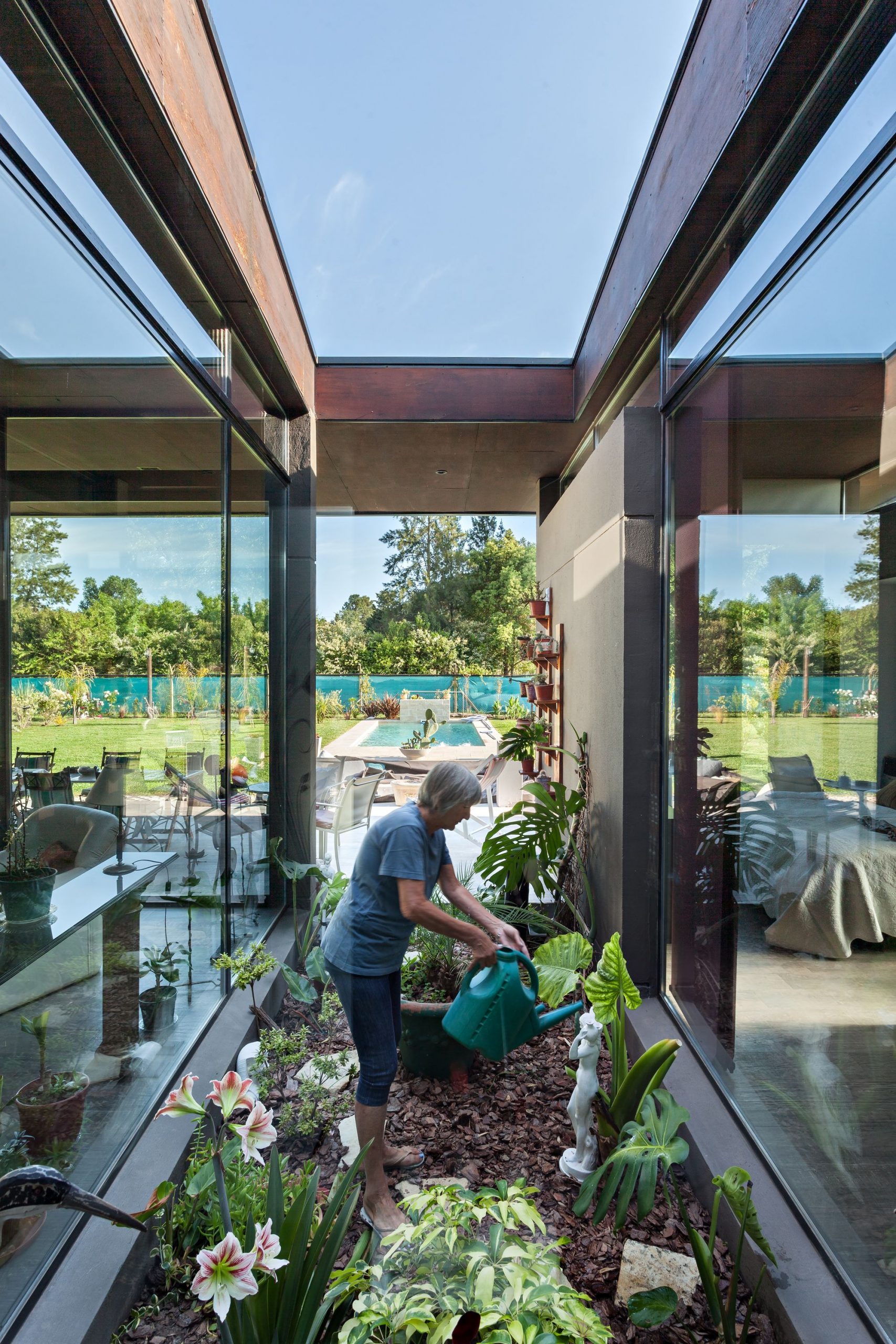 Life unfolds within a ring around the fully glazed central courtyard, colonized by a garden that organizes and articulates the different uses. A continuous metal roof that covers the entire extension of the plant, inside covered in wood phenolics, generates a contrast of light, color, and texture with the rest of the exterior that tries to pass to an austere plane. At the same time, it floats thanks to a glazed gap on four volumes on its front that are in contact with the ground, two of them surround the side faces, and form an envelope that embraces the large central interior space; leaving an open space towards the bottom where it culminates in a gallery with a total opening to the private park.