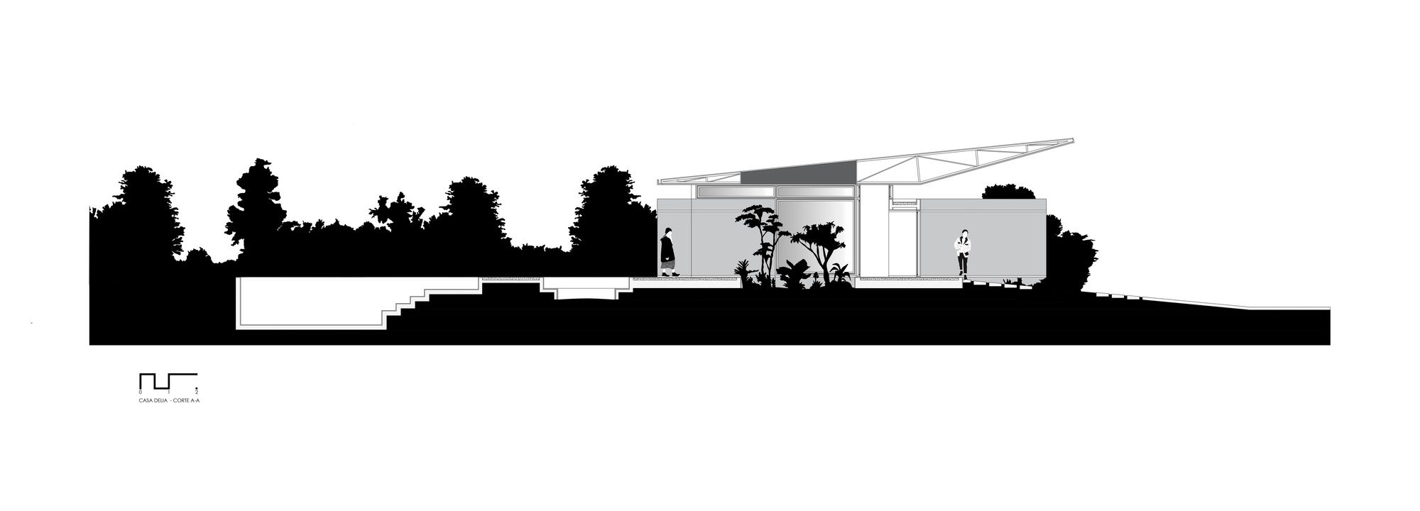A spatial sequence is proposed in the transition from public to private space. The visitor is invited through a large roof that at the access presents its largest scale, to then access the most secret and intimate part of the house. On the way to the entry point through the slope of the roof and the terrain, the spatial relationship begins to provide greater intimacy, continuing the sequence, once inside the patio becomes the protagonist, then all the spaces of the house can be observed connected to each other.