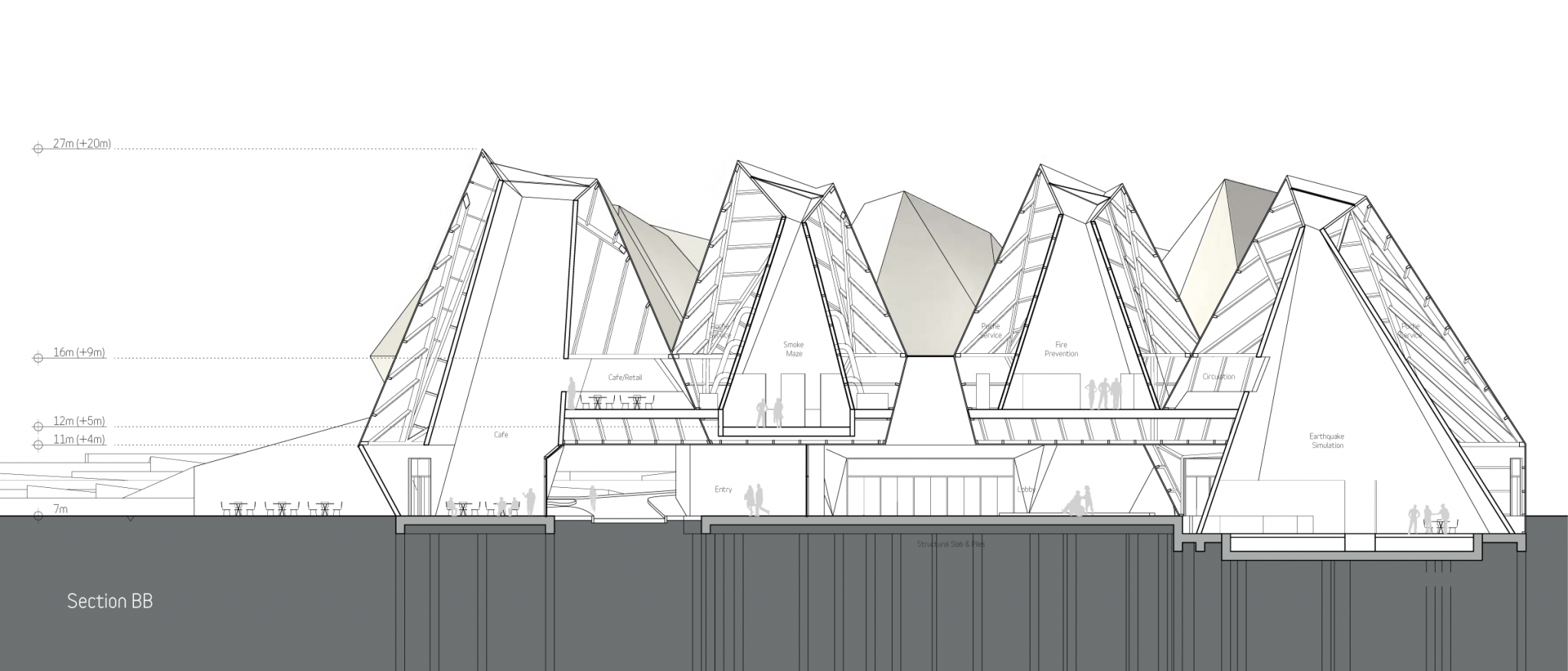 The building relies on connectivity from one “boulder” to another – the concrete and steel structure transfers load from one boulder to the next, creating a structure more stable than it would be normally required from the current building code. In the event of an actual disaster, the building can provide a safe space and even terraced and open spaces, which can host up to 1000 people.