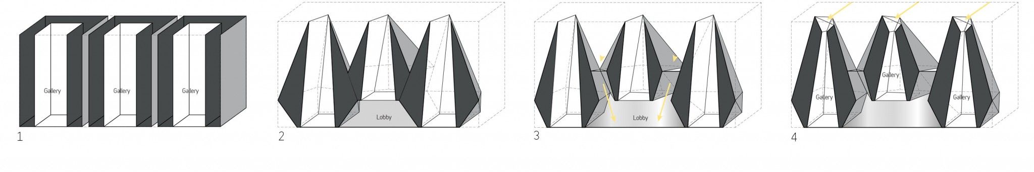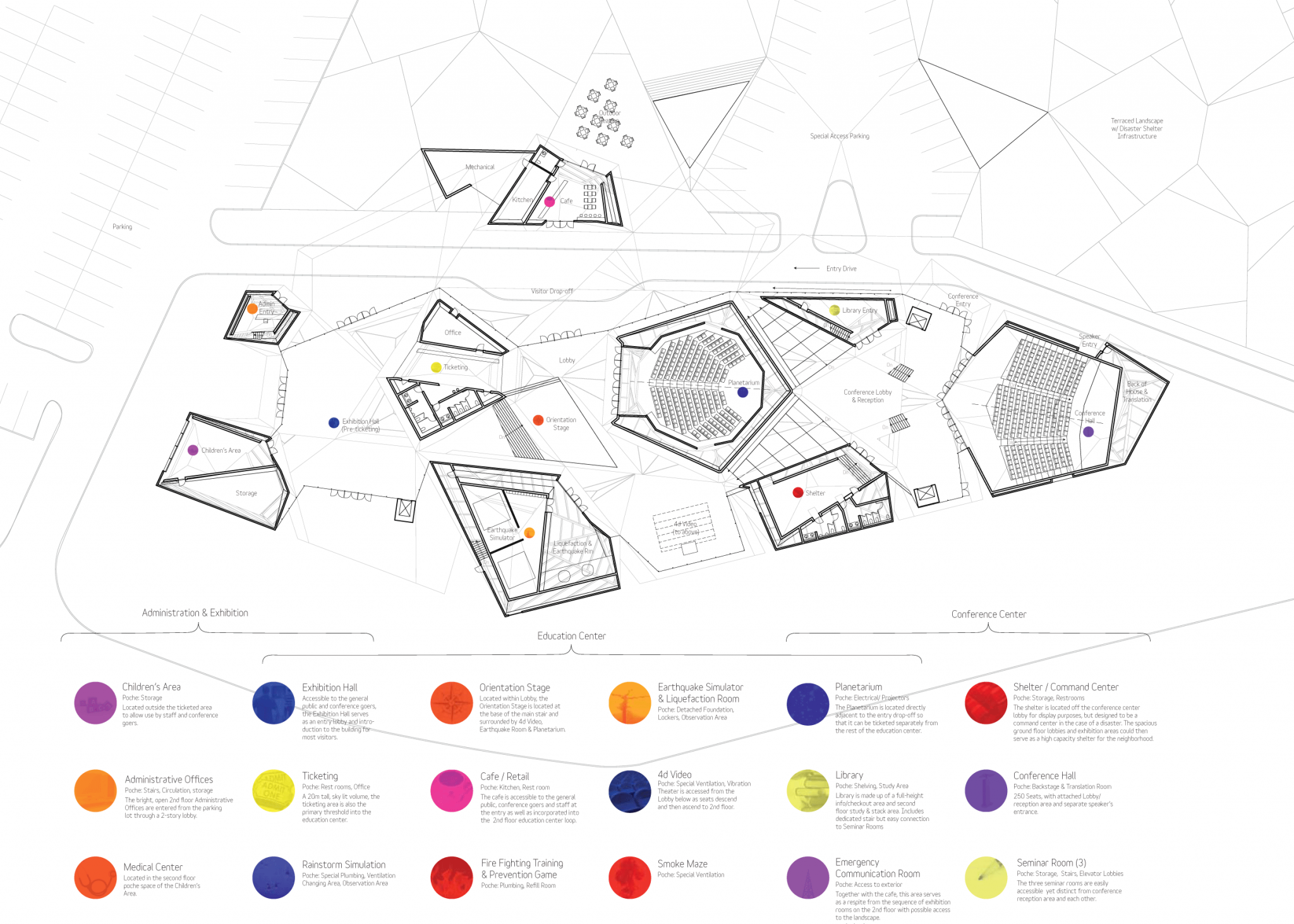 While usually science museum are designed to contain smaller scale exhibits, the center is created as a continuation of distinct spaces, with each exhibition creating a specific atmosphere, enhanced by structural, mechanical and electrical infrastructure.The exhibit spaces recreate the form of “boulders”, with singular central space, surrounded by circulation areas. The heart of each boulder is stressed through lighting and color, which fade out towards the lobby and reception spaces.