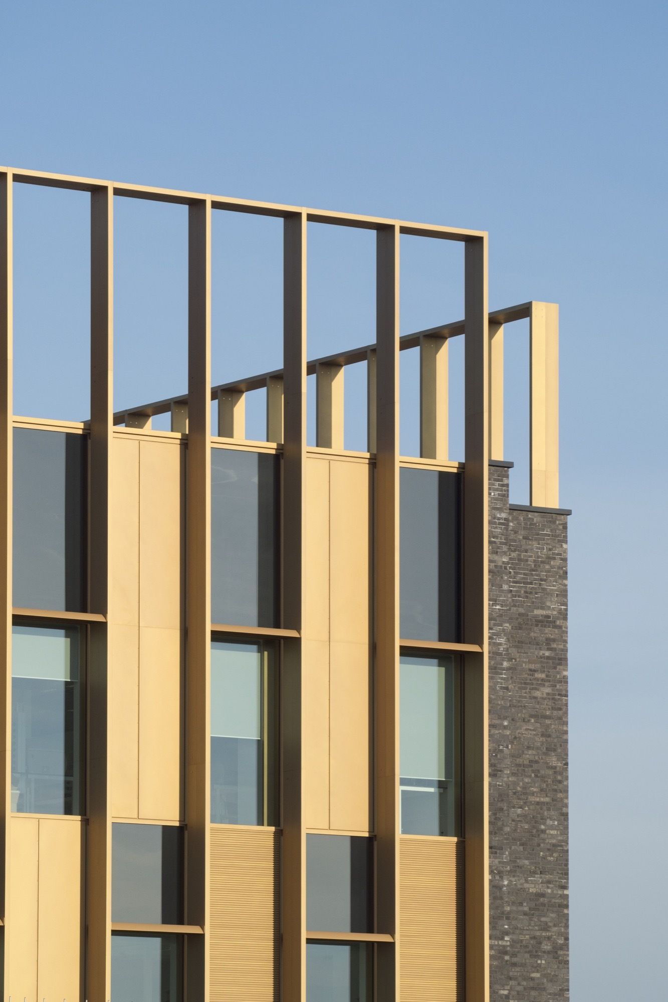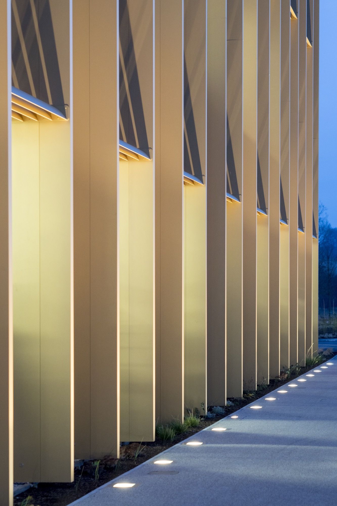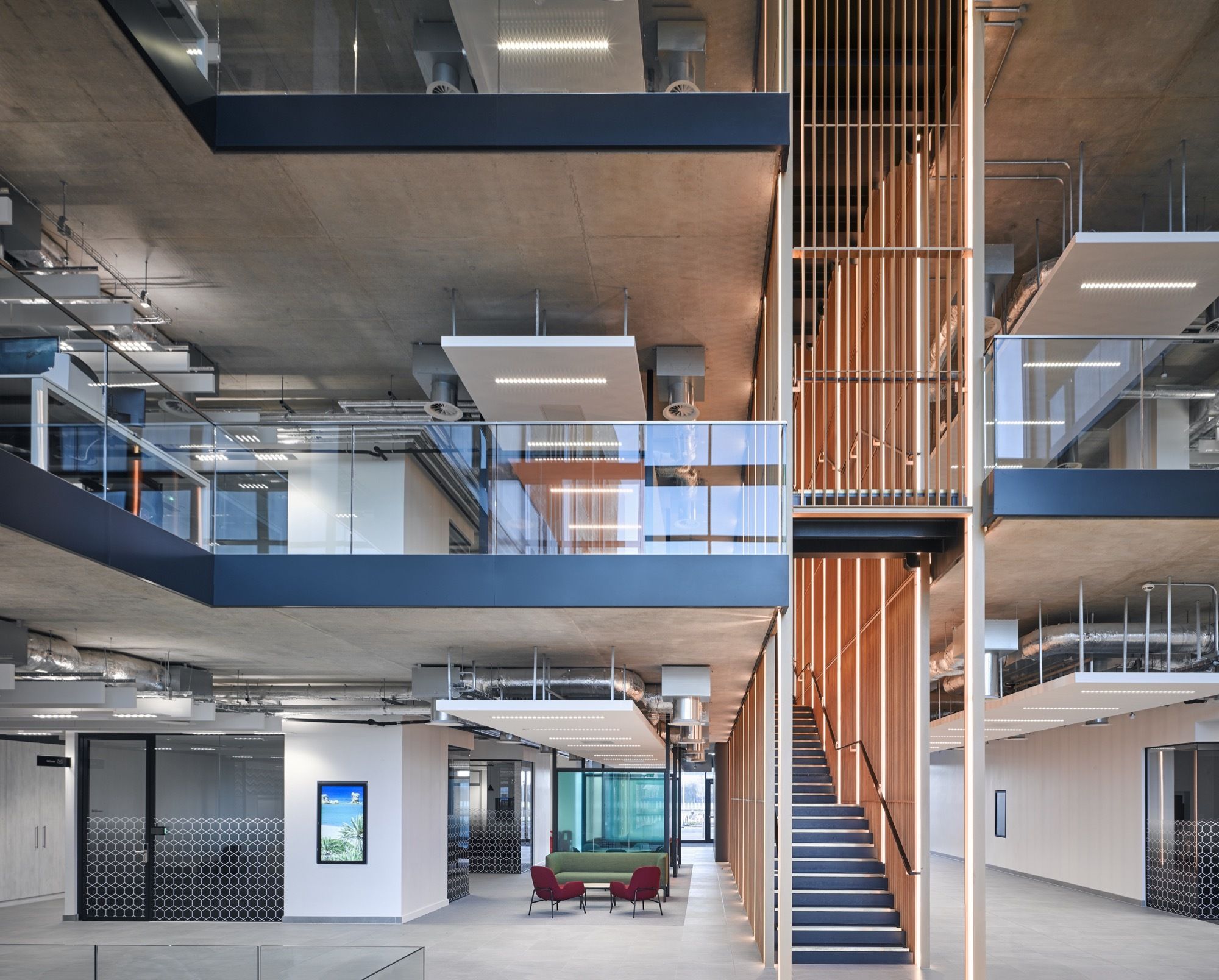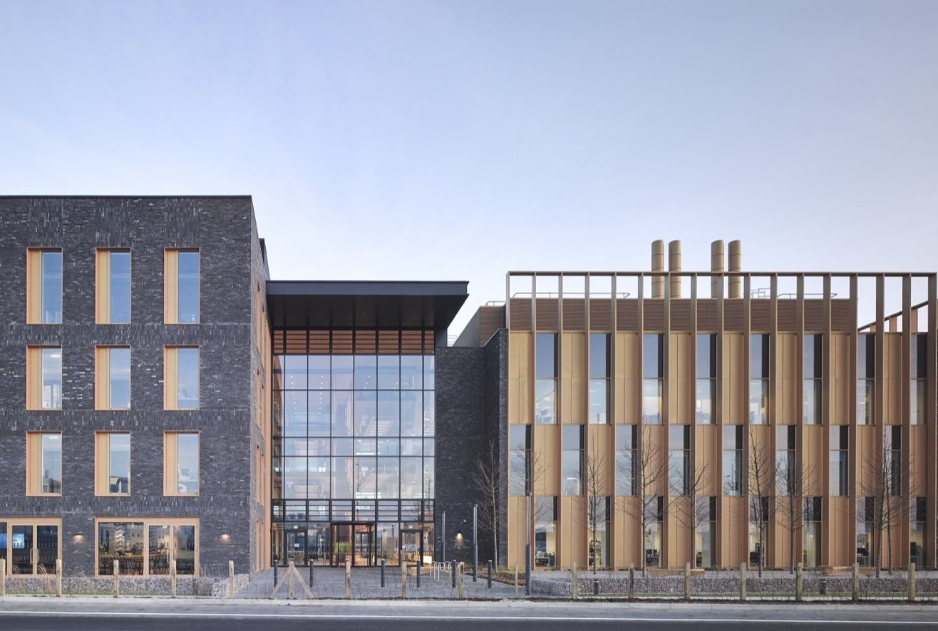 The building’s striking exterior features parametrically designed extended fins and brise soleil, giving it a distinct identity and marking a new gateway to the south west entrance into the wider campus. Expansive glazing allows views out to the surrounding countryside, while ‘putting science on show’ by making the work within visually accessible to the public. A variety of hard and soft landscaping helps to situate the building within the campus, and outdoor amenity spaces with integral cycle storage are provided for employees. The campus’ natural biodiversity is enhanced through indigenous planting, bird boxes, and landscape rainwater management using bioswales.